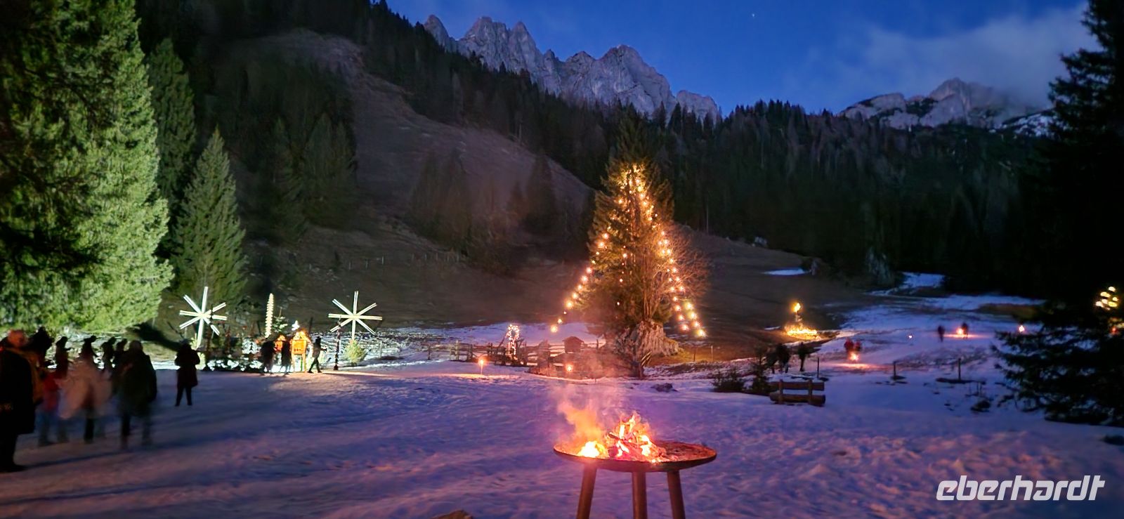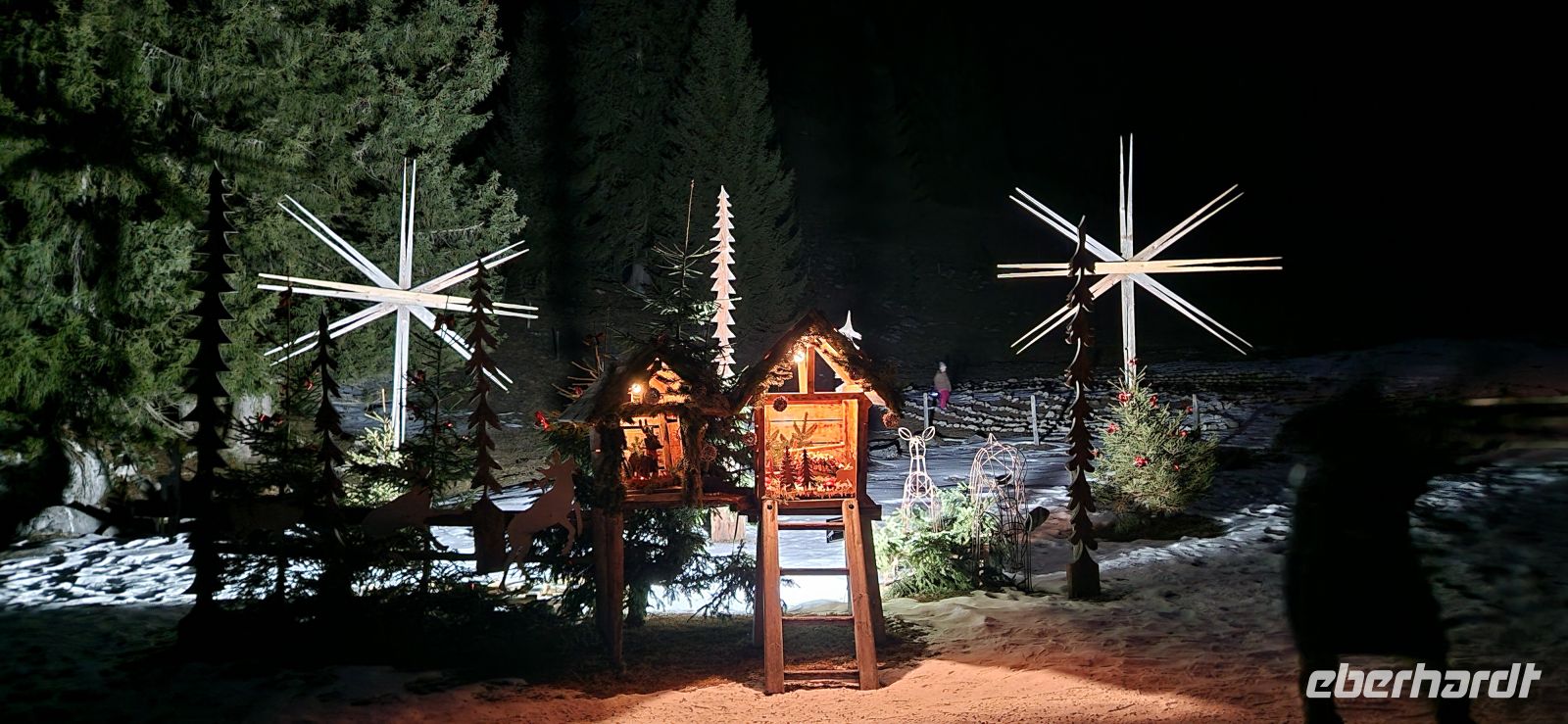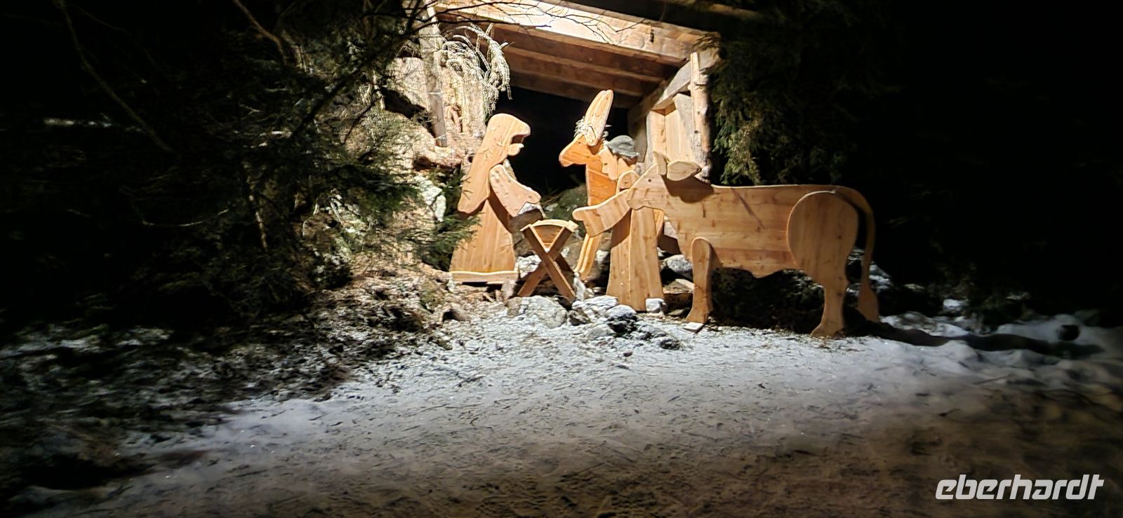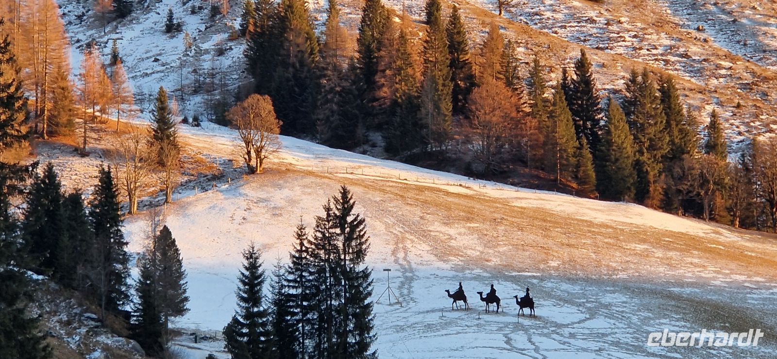 Mit mehreren Zweispännern fuhren wir, dick eingemummelt, eine Stunde zur Unterhofalm hinauf. Die Alm erwartete uns schon zu einem Glühwein. Mit Einbruch der Dunkelheit öffnete die „Weihnachtsidylle“, ein Rundweg mit Lichtilluminationen, Weihnachtskrippen und den Drei Königen auf ihren Kamelen. Nur die angesagten Schiachperchten waren außer Dienst.
