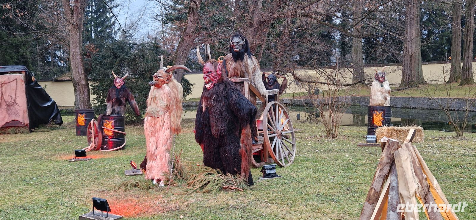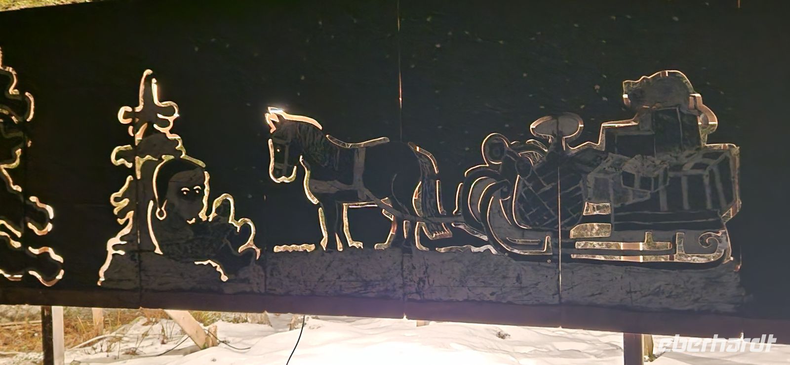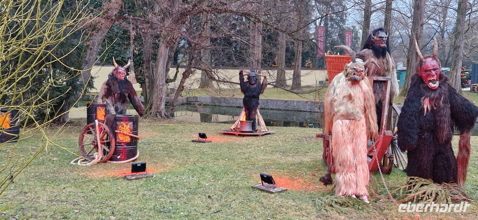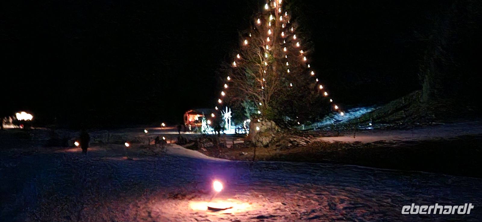 Mit mehreren Zweispännern fuhren wir, dick eingemummelt, eine Stunde zur Unterhofalm hinauf. Die Alm erwartete uns schon zu einem Glühwein. Mit Einbruch der Dunkelheit öffnete die „Weihnachtsidylle“, ein Rundweg mit Lichtilluminationen, Weihnachtskrippen und den Drei Königen auf ihren Kamelen. Nur die angesagten Schiachperchten waren außer Dienst.