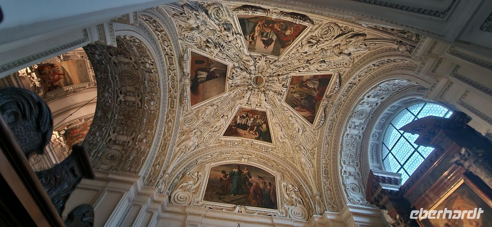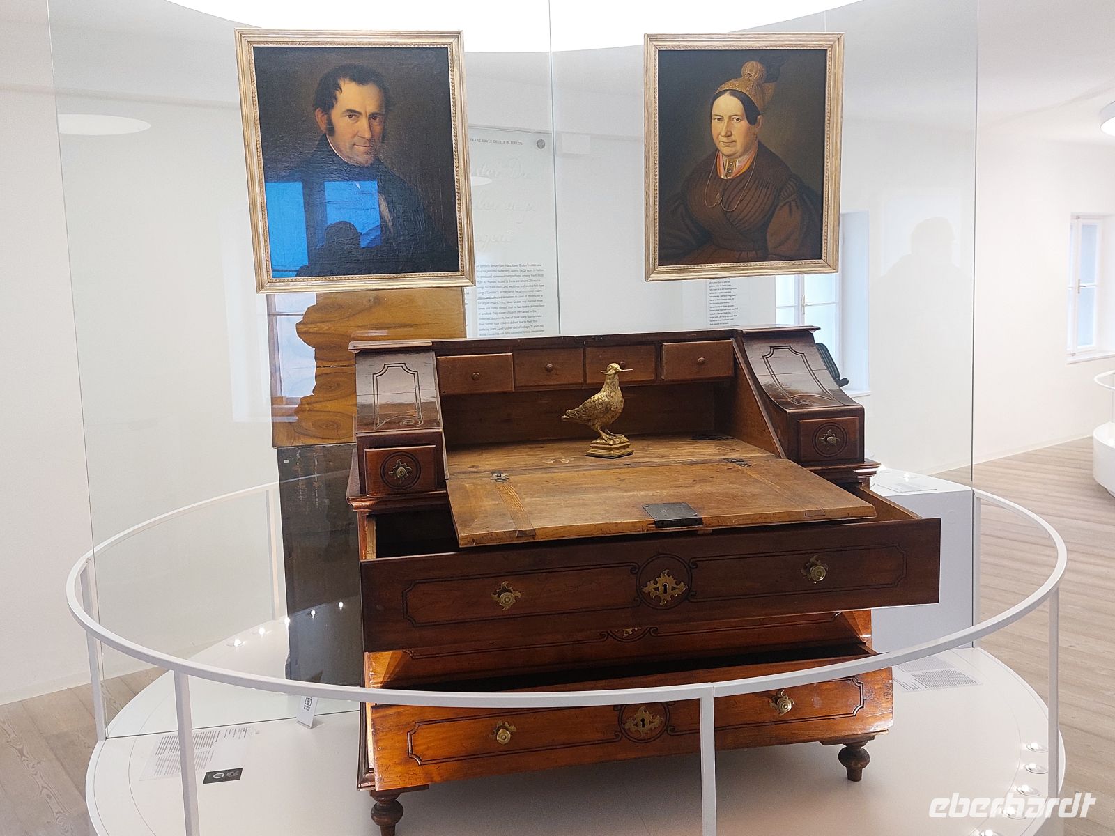 Wir durchschritten ein, zwei Räume und in der Empfangshalle erklang „Es ist ein Ros entsprungen“. Und so ging es mehrfach weiter. Wir blickten aus einem Oratorium von oben in die Schlosskirche. Dann zog uns ein toller Sekretär, mit 72 Schüben, in seinen Bann. Tolle handwerkliche Arbeit!