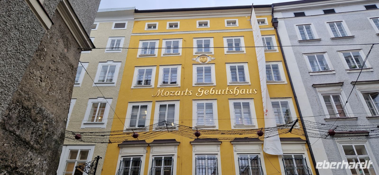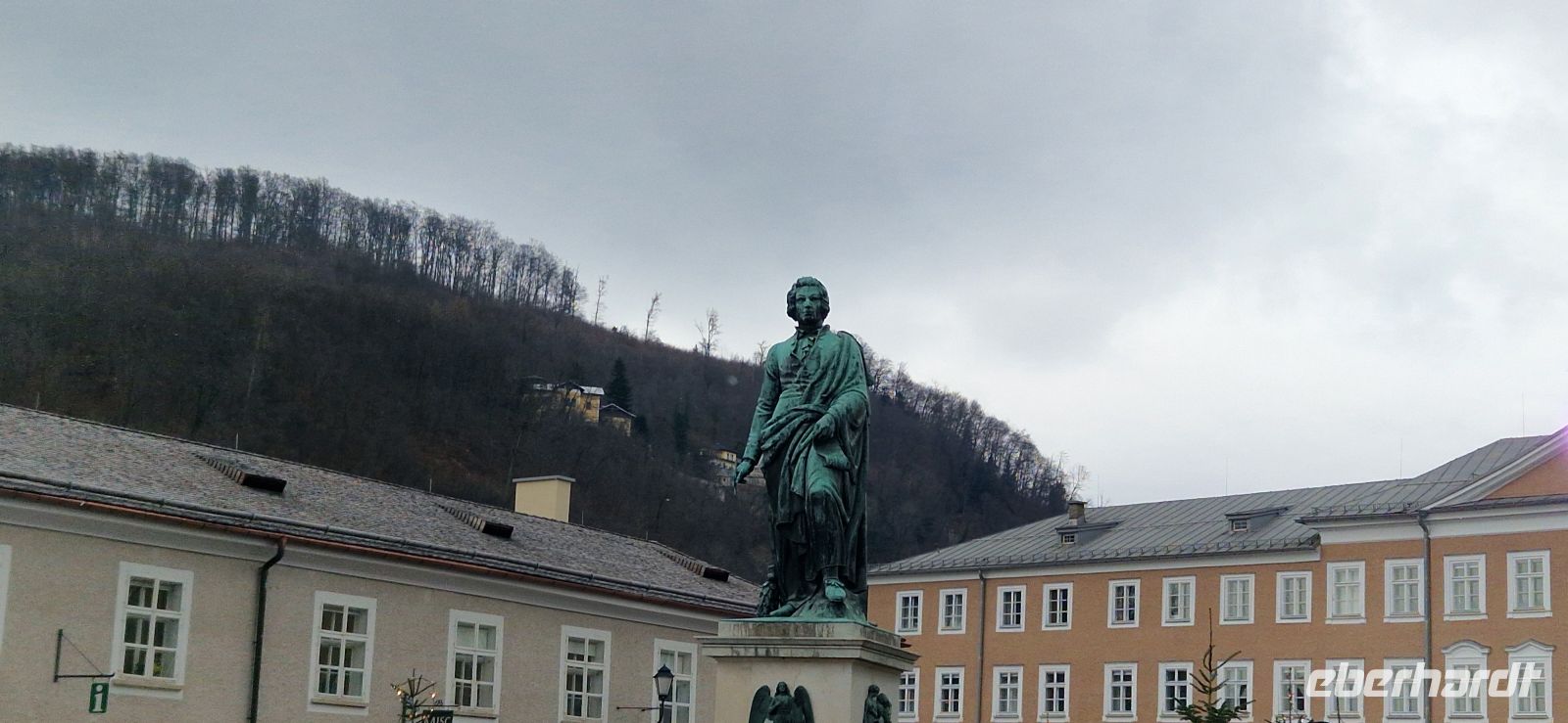Anrdré setzte uns in Salzburg am Busterminal Nonnental ab und wir liefen in zwei Gruppen, mit zwei Geschwindigkeiten, in die Stadt. Am 1848 zu Ehren Wolfgang Amadeus Mozart errichteten Denkmal gab es die Wahl, direkt auf den Christkindlmarkt zu gehen oder noch eine zusätzliche, kleine Stadtführung zu unternehmen, die uns zum Ufer der Salzach, dem Rathaus, dem Geburtshaus Mozarts, dem Universitätsplatz und dem Franziskaner Kloster führte. Die kleine Führung, an der die Hälfte der Gruppe teilnahm, endete am Domplatz.