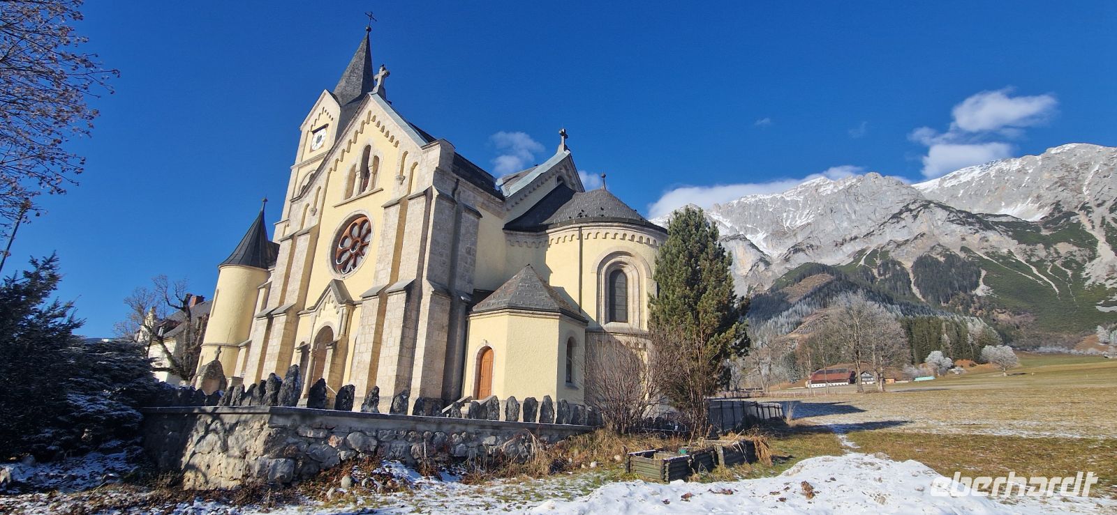 Nächster Halt war in Ramsau am Dachstein, direkt unterhalb der Dachsteinsüdwand. Ramsau ist ein Zentrum der nordischen Ski Arten. Hier spielt auch die ZDF-Serie „Die Bergretter“. Direkt gegenüber der Dorfkirche ist das Büro der Bergrettung zu sehen.