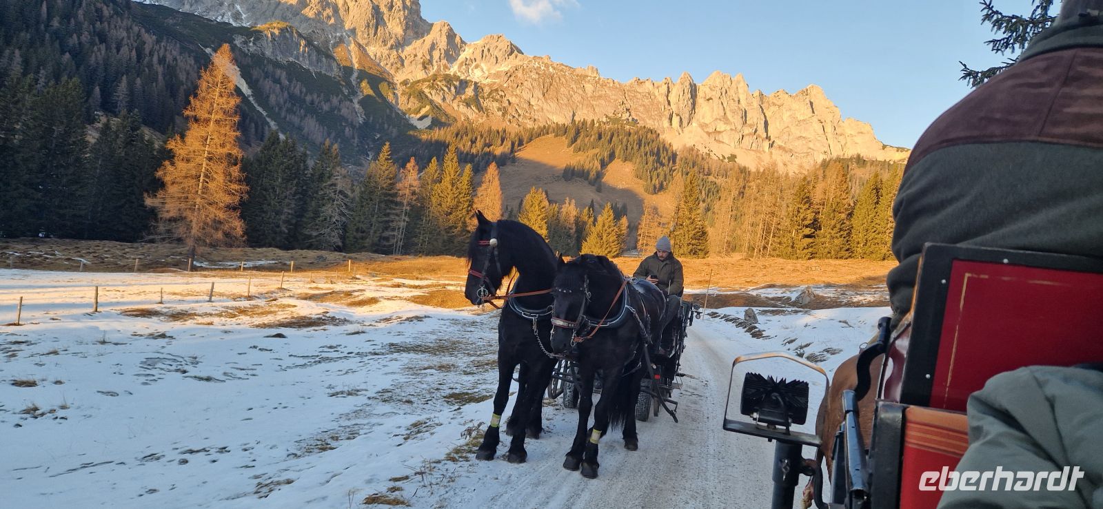 Wieder gut auf der Unterhofalm angekommen, fuhren wir mit den bereits bereitstehenden Pferdekutschen durch den dunklen Wald zurück nach Filzmoos.