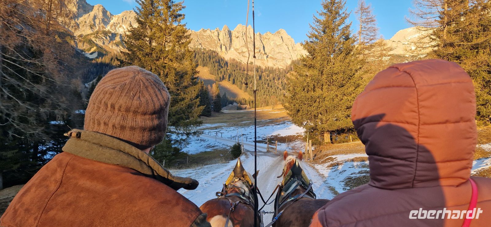 Von Ramsau aus fuhren wir, bei schönstem Sonnenschein, um die Dachsteinsüdwand herum und erreichten, mit Blick auf die, in der Sonnen liegenden, 2458 m hohe Großen Bischofsmütze, Filzmoos. Hier erwartete uns eine Kutschfahrt.