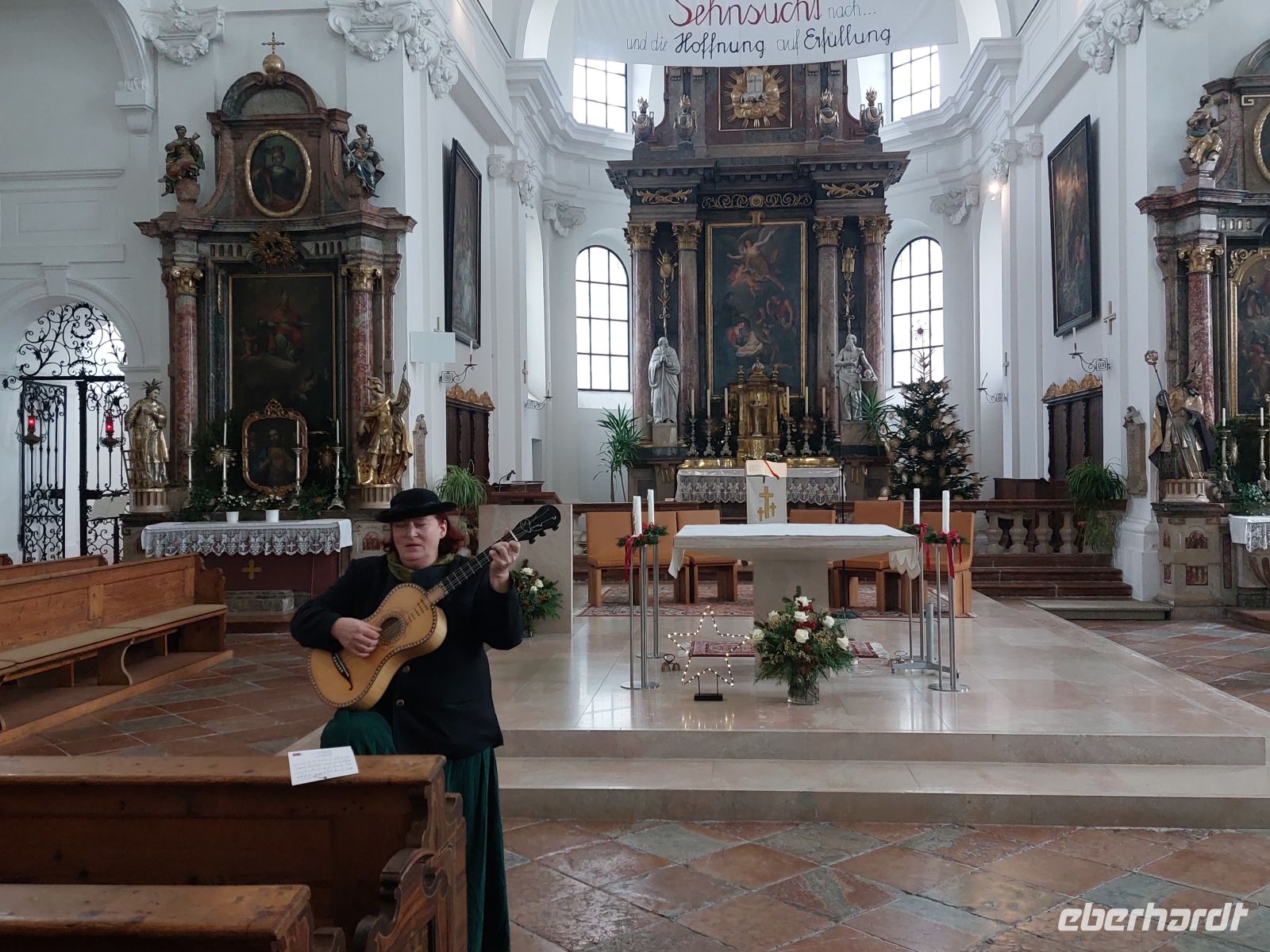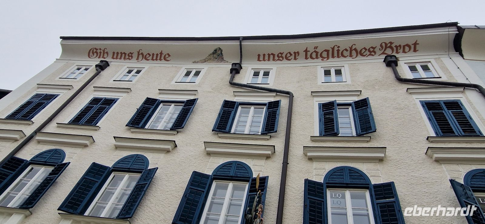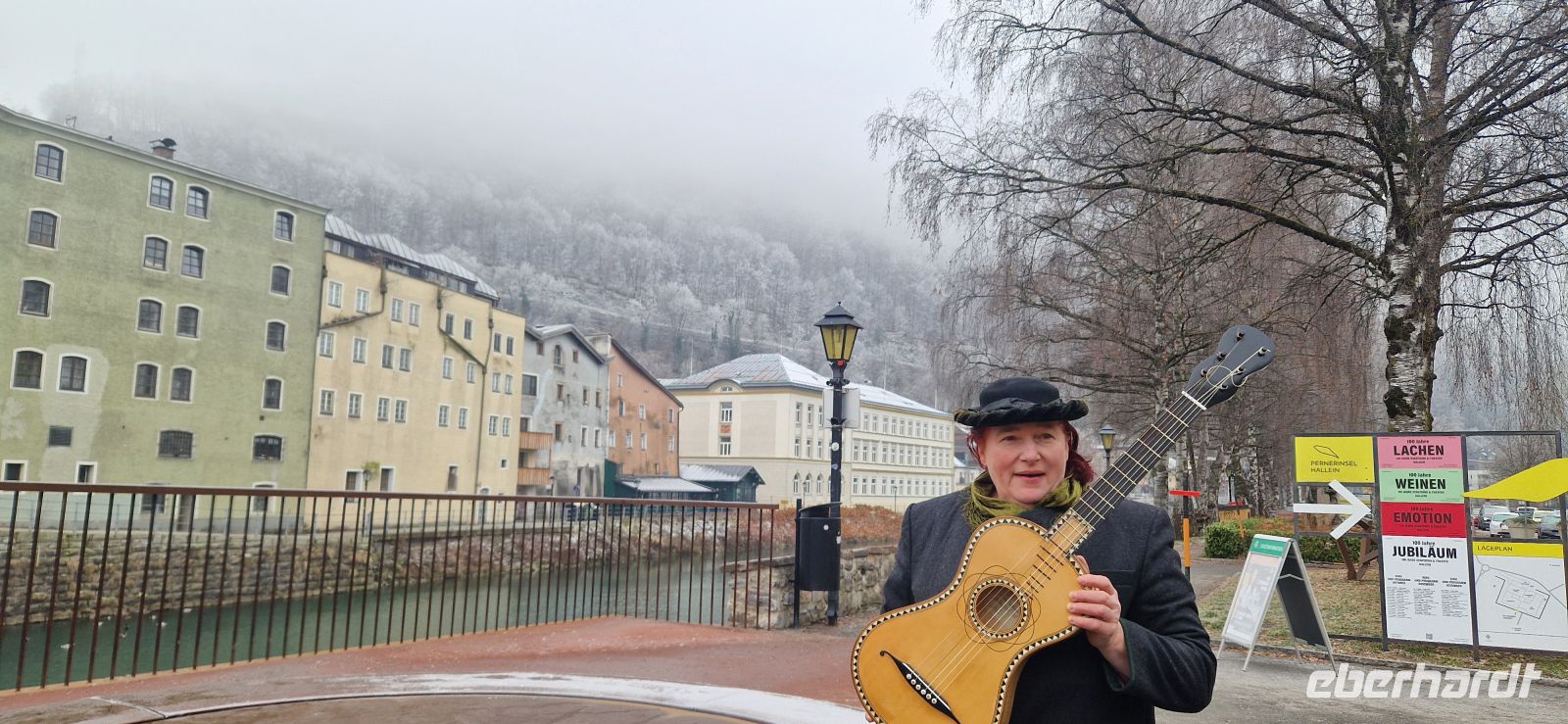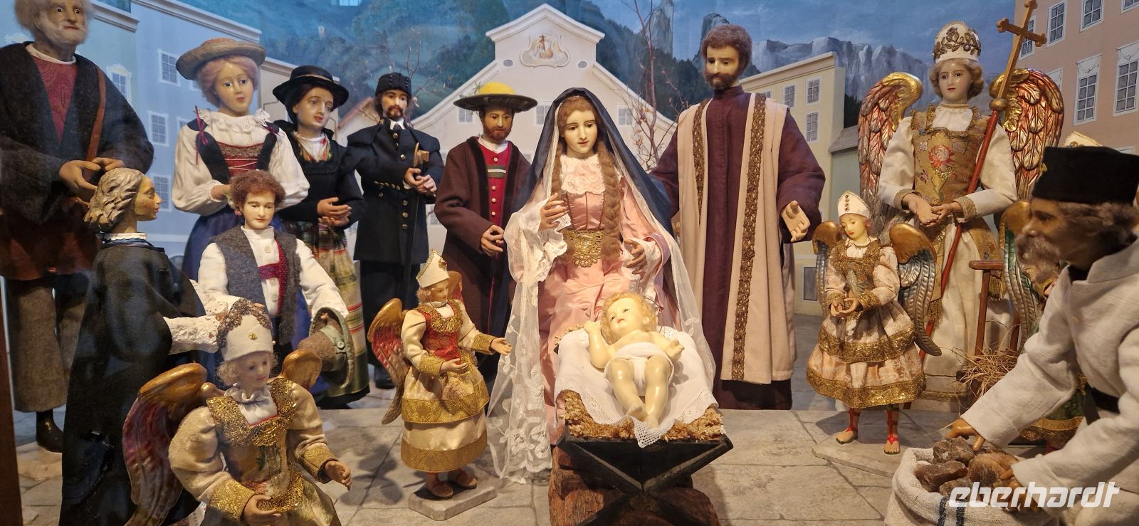 In Hallein angekommen empfing uns am Bus Elisabeth, eine „Tochter“ von Franz Xaver Gruber, dem Komponisten unseres berühmtesten Weihnachtsliedes. Mit einer Gitarre auf dem Rücken, ab und zu ein Lied singend, führte sie uns zuerst durch die alte Salinenstadt. Sie begann an der Salzachbrücke ihre Ausführungen mit „O Tannenbaum“. Hallein ist vom Salzabbau und dessen Vermarktung stark geprägt. Hier war einst das älteste Bergwerk der Welt, das 1986 geschlossen wurde. Am ehemaligen Wohnhaus von F.X. Gruber legten wir einen Stopp ein und besuchten das heute als Museum fungierende Haus. Hier berichtete uns Elisabeth einiges aus dem Leben ihres Vaters und vom Leben in der damaligen Zeit. Auch durfte hier die musikalische Umrahmung nicht fehlen und wir sangen alle zusammen drei Strophen von „Stille Nacht“. Anschließend gingen wir noch in die gegenüberliegende Stadtpfarrkirche St. Antonius. Die Kirche war innen sehr schlicht, denn die Gemeinde hatte früher kein Geld für die Ausschmückung. Um so besser klag das von Elisabeth zum Abschluss gesungene Lied „O Du Fröhliche“.