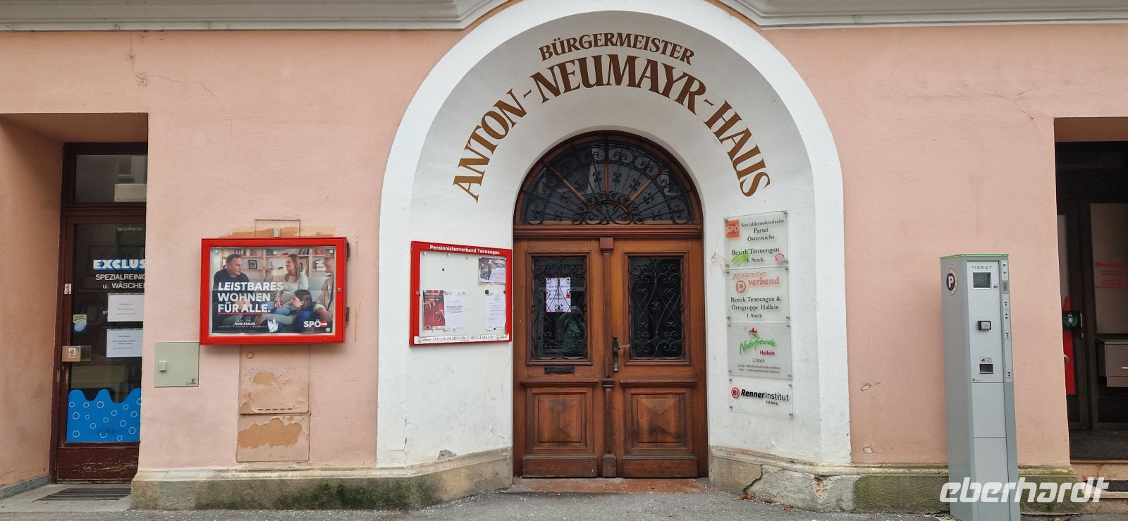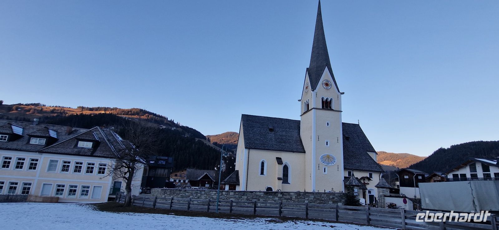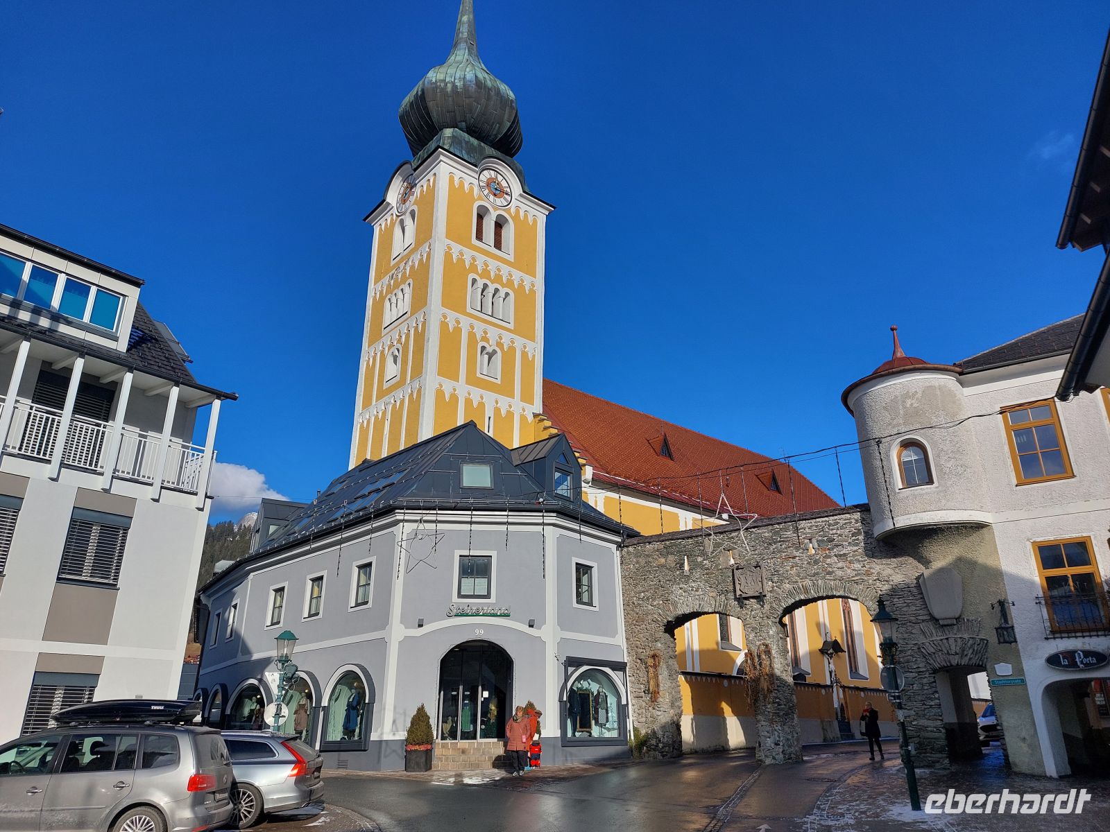 Wer wollte, ging mit dem Reiseleiter etwas durch den kleinen, idyllischen, aber fast ausgestorbenen Ort. Vorbei am 1884 von August Prinz von Sachsen-Coburg und Gotha als Jagdschloss errichteten, heutigem Rathaus gingen wir durch die Fußgängerzone bis zum Salzburger Tor. Dieses 1322 errichtete Stadttor ist als einziges Tor der alten Stadtbefestigung noch erhalten. Gleich daneben steht die 1532 geweihte Katholische Pfarrkirche, mit dem Hochaltar von 1704. Die Tür war offen und so konnten wir uns diese Kirche auch von innen ansehen. Den äußersten Punkt des Stadtrundgangs bildete das 1661 für die Unterbringung kranker Bergleute erbaute, heutige Stadtmuseum. Wir gingen zurück Richtung Parkplatz. Direkt neben dem Parkplatz war die Planai- Liftstation und der Zielhang der Schladminger FIS-Abfahrt. An einer Tafel an der Liftstation war zu erkennen, dass sämtliche Abfahrten des Skigebietes geöffnet waren. D.h., alle Pisten waren mit Kunstschnee präpariert.
