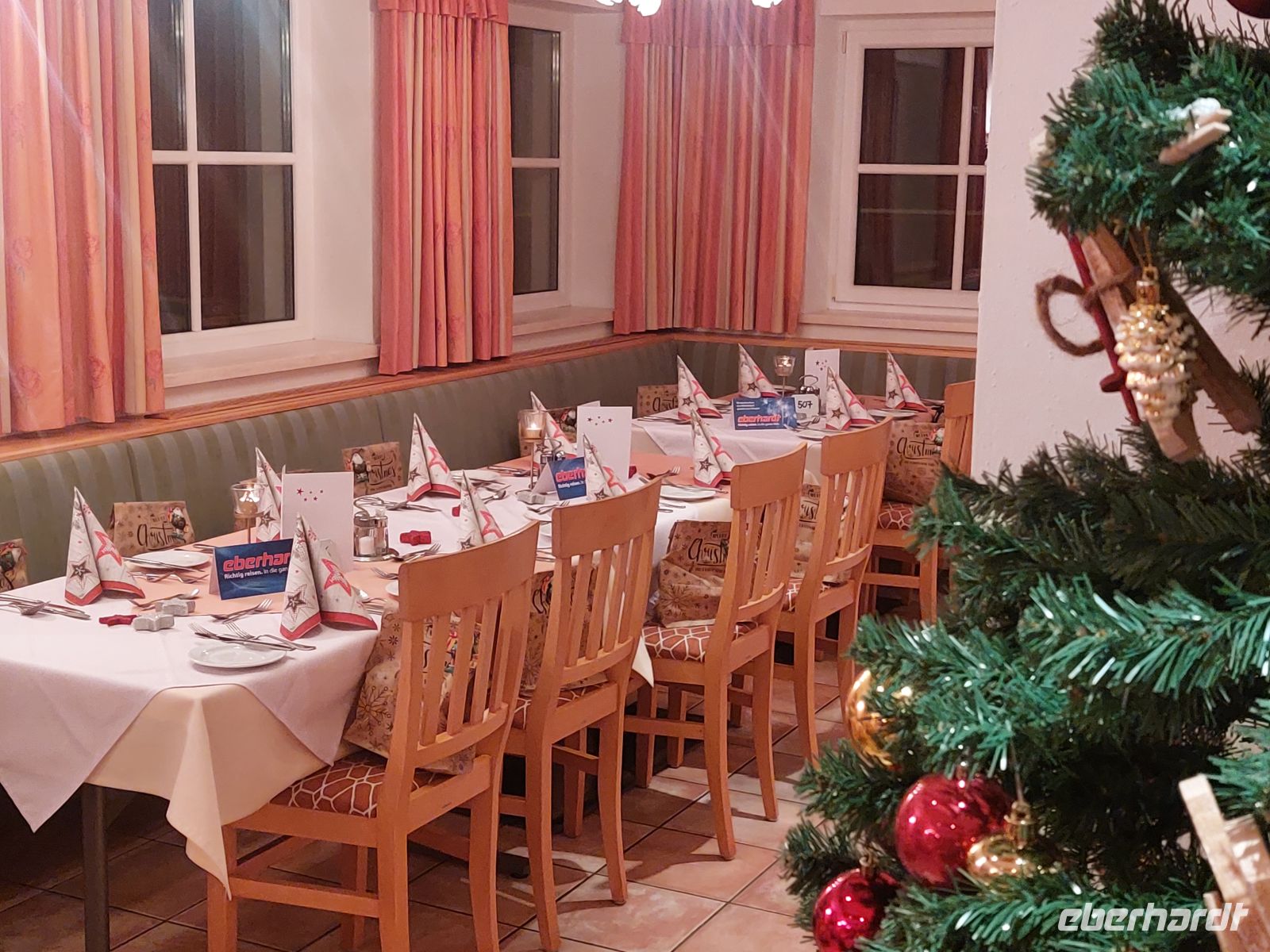 Um 18:30 Uhr begann das 5-Gänge-Menü. Vorher hatten fleißige Wichtel ein kleines Eberhardt-Weihnachtspräsent verteilt. Als der Reiseleiter zum Essen kam, raschelte es enorm. Die ganze Gruppe hat es nicht erwarten können und das Geschenk, vor der Bescherung, sofort aufgemacht. Dies war anders geplant!