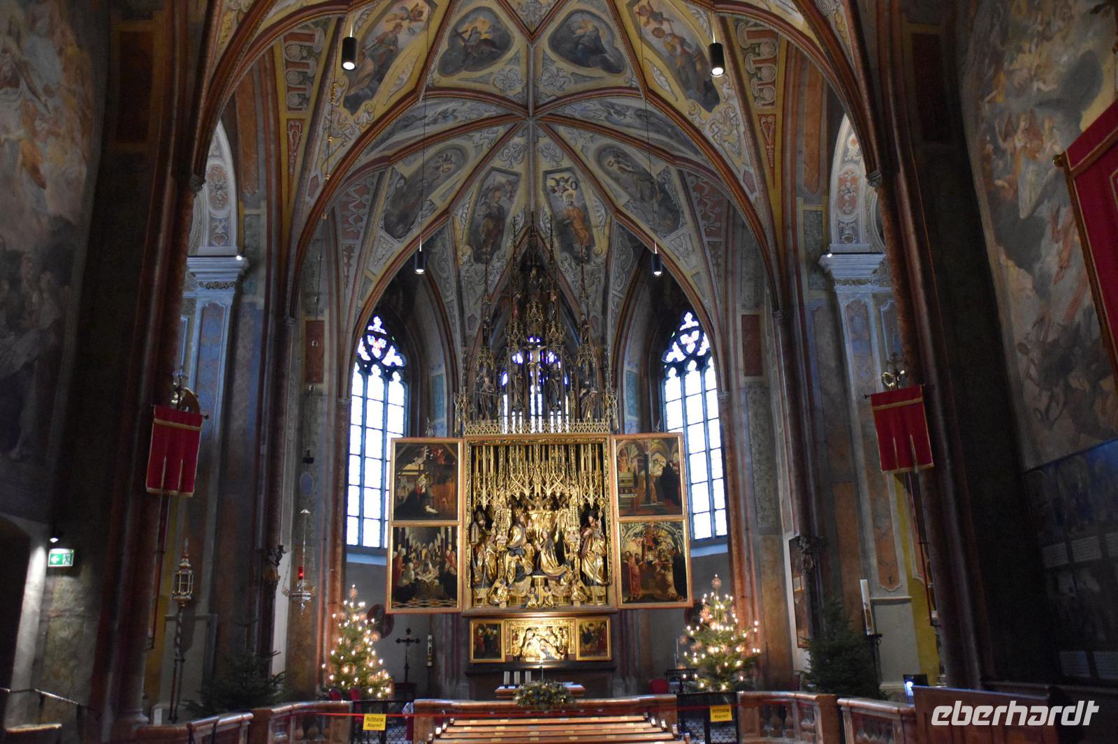 Im hübschen Ort St. Wolfgang wollen wir dem Silvestermarkt einen Besuch abstatten. Der Ort empfängt uns mit seinen wunderschön gepflegten Häusern und noch im weihnachtlichen Schmuck. Das Wahrzeichen, die Laterne auf dem Wolfgangsee scheint etwas renovierungsbedürftig, aber die mit lebensgroßen Figuren ausgestattete Weihnachtskrippe am Marktplatz ist auf alle Fälle sehenswert. Ebenso natürlich das berühmte Hotel Weißes Rössl und die Kirche des Heiligen Wolfgang mit ihren wunderschönen, kunstvollen Altären.