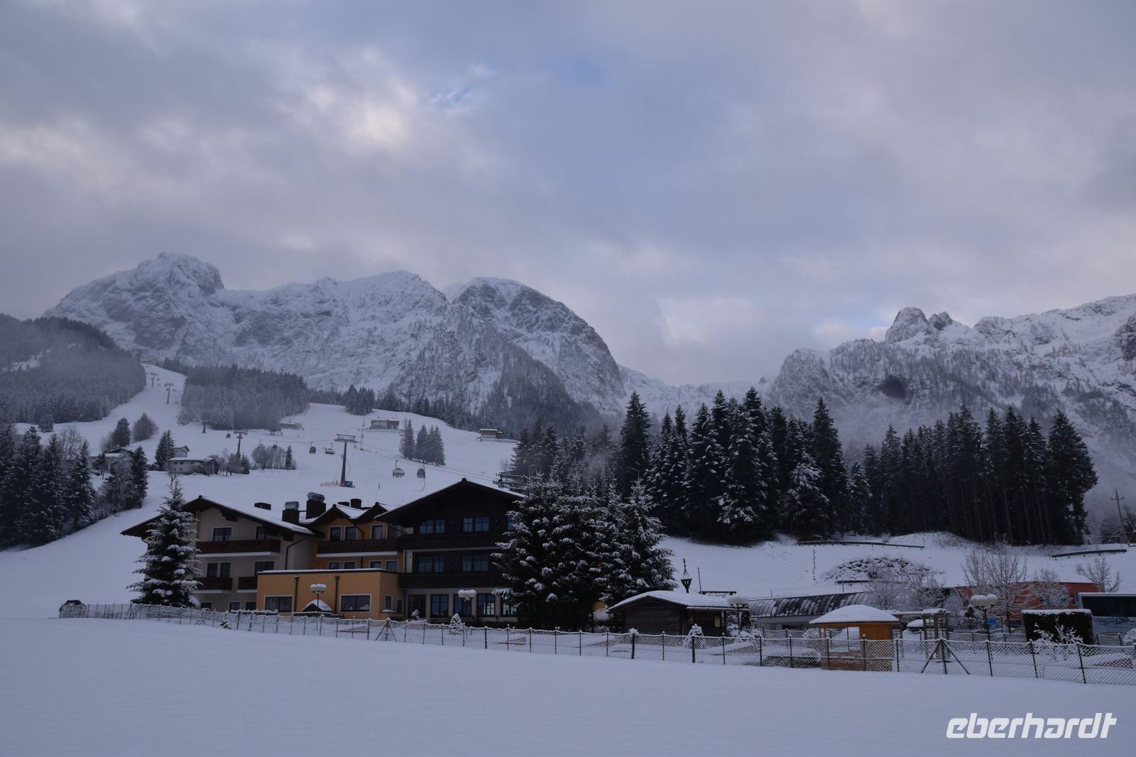 Früh 08:00 Uhr starteten wir pünktlich mit unserem Reisebus am Flughafen Dresden, nahmen auf unserer Fahrt durch Sachsen und Bayern in Richtung der österreichischen Alpen zahlreiche Reisegäste auf. Wir hatten gutes Reisewetter mit Sonne und Wolken und vor allem schnee- und eisfreie Straßen. Außer leicht verkehrsbedingten Behinderungen auf der Münchner Ostumfahrung verläuft unsere Fahrt bis Salzburg nahezu reibungslos. Vom Grenzübergang bei Freilassing war es über die Tauernautobahn nur noch ein Katzensprung bis Golling, wo wir die Autobahn verlassen und in das vor dem Tennengebirge verlaufende Lammertal abbogen. Am späten Nachmittag erreichten wir Abtenau, den romantischen Ort auf einem Wiesenhöhenzug zwischen der Osterhorngruppe mit der Postalm im Norden und den hohem Gipfelmassiv des Tennengebirges im Süden. Hier begrüßte uns Familie Pendl herzlich in ihrem Hotel Traunstein, das nach einem der markanten Gipfel des Tennengebirges oberhalb benannt ist.