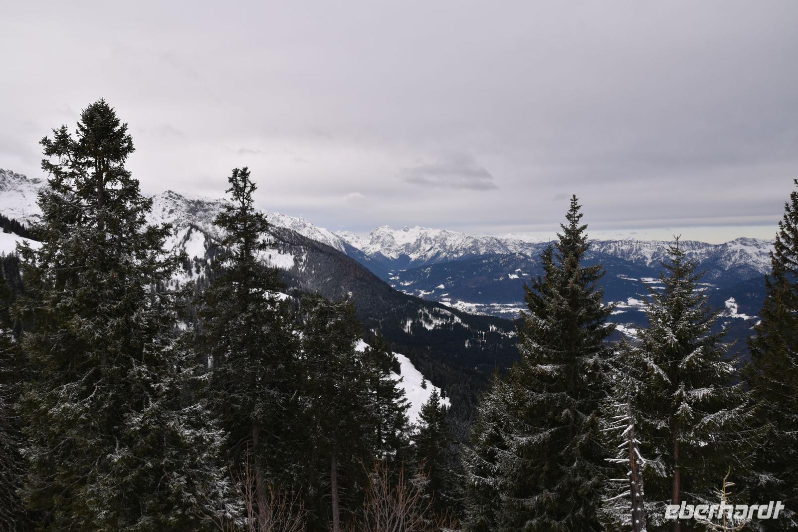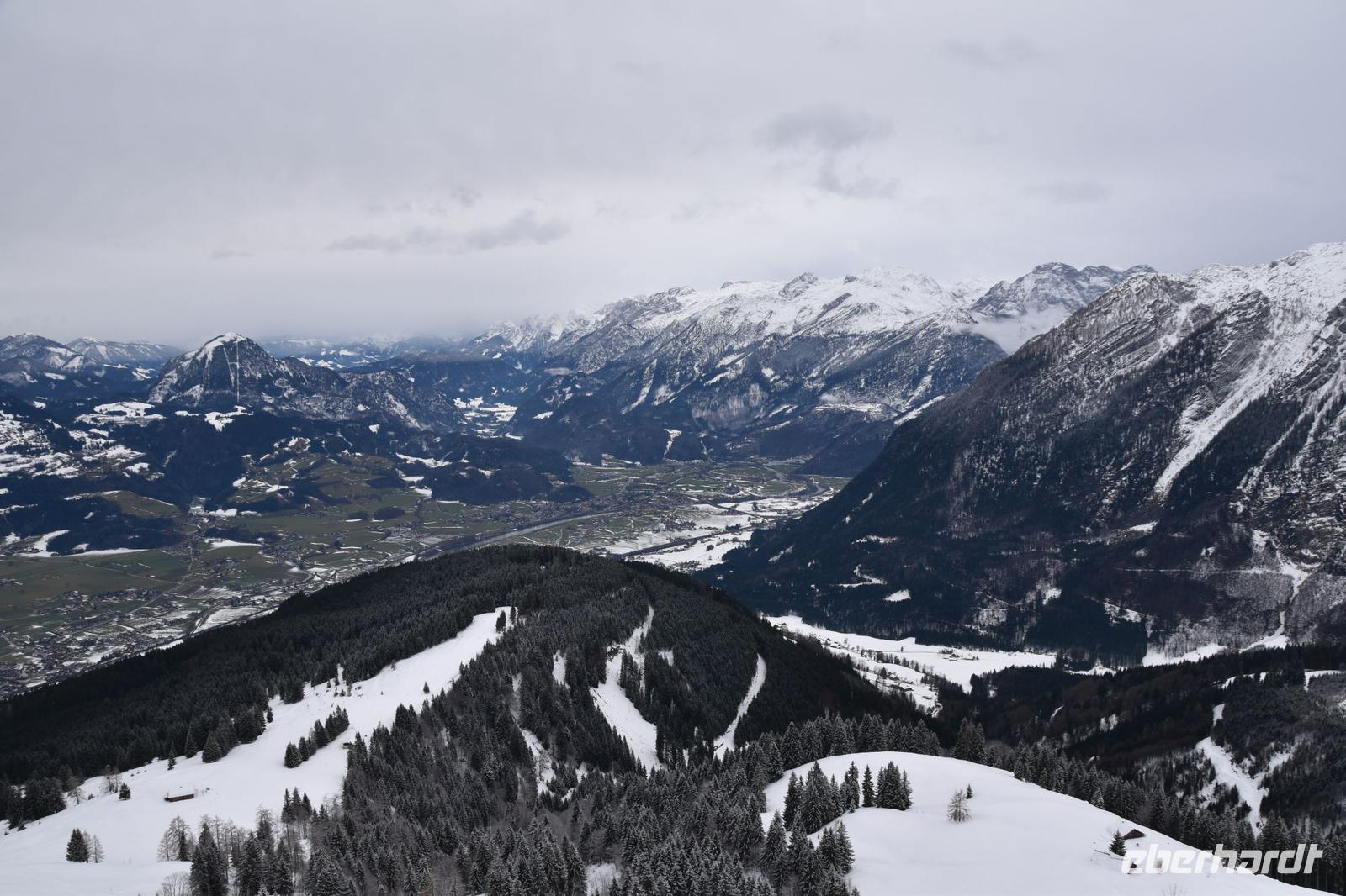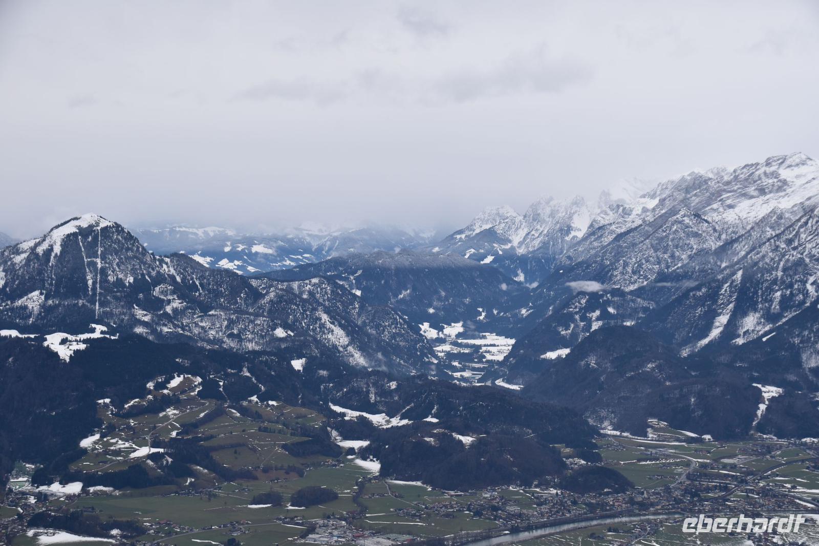 Dann treffen sich alle im Reisebus wieder. Die Roßfeldhöhenstraße ist unser Ziel an diesem schönen Neujahrstag. Wir fahren diese herrliche Bergstraße und stoppen an den wunderschönen Aussichten ins Berchtesgadner und ins Salzburger Land. Speziell der Tiefblick ins Salzachtal, nach Golling und hinüber zum Lammertal, dem Tennengebirge und dem Hohen Dachstein ist von hier phantastisch. Wir spazieren wir ein bisschen an der Scheitelstelle der Straße durch die wundervolle Bergwelt der berchtesgadener Alpen, sehen Watzmann, Hochkalter, Reiteralp, Lattengebirge (Schlafende Hexe), Untersberg, Höhen Göll, das Lammertal mit dem Schwarzberg, das Tennengebirge und natürlich Salzburg.