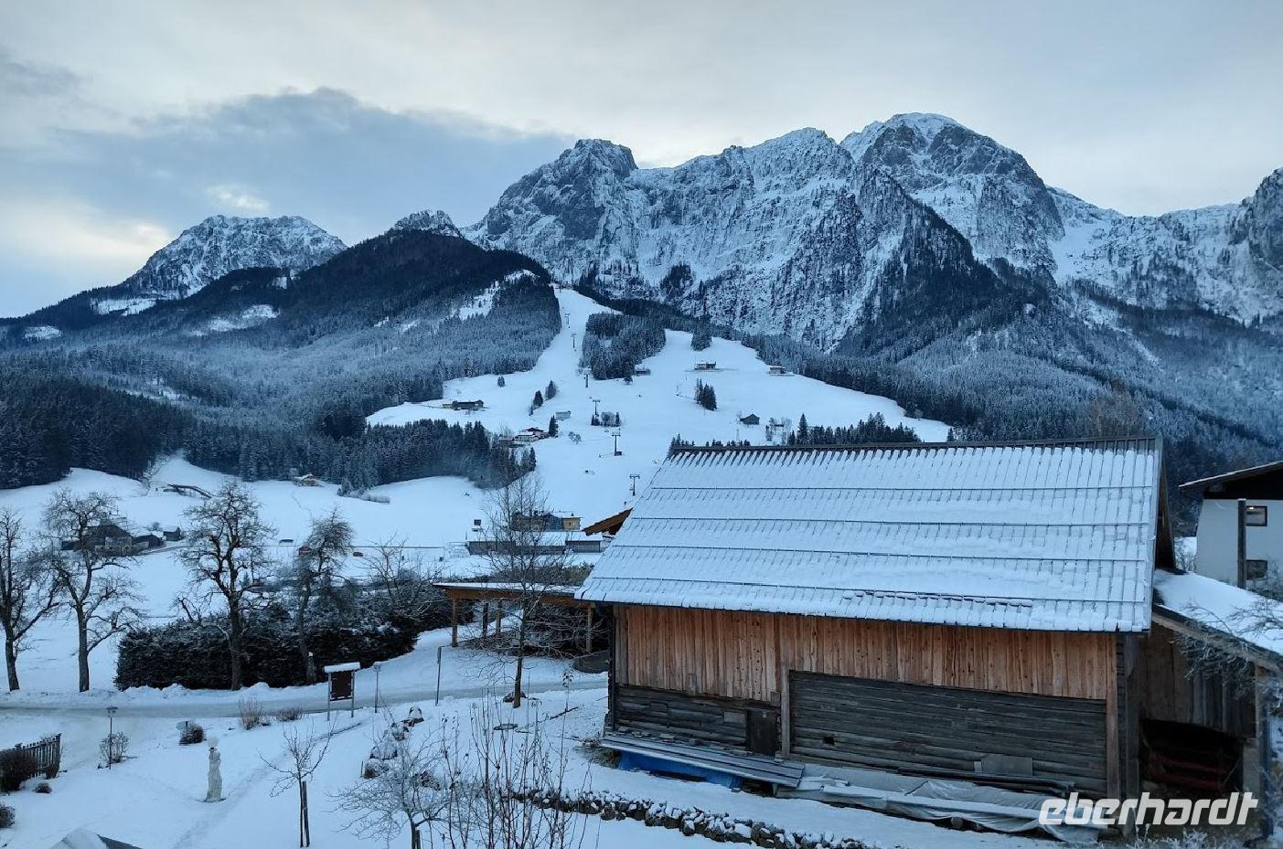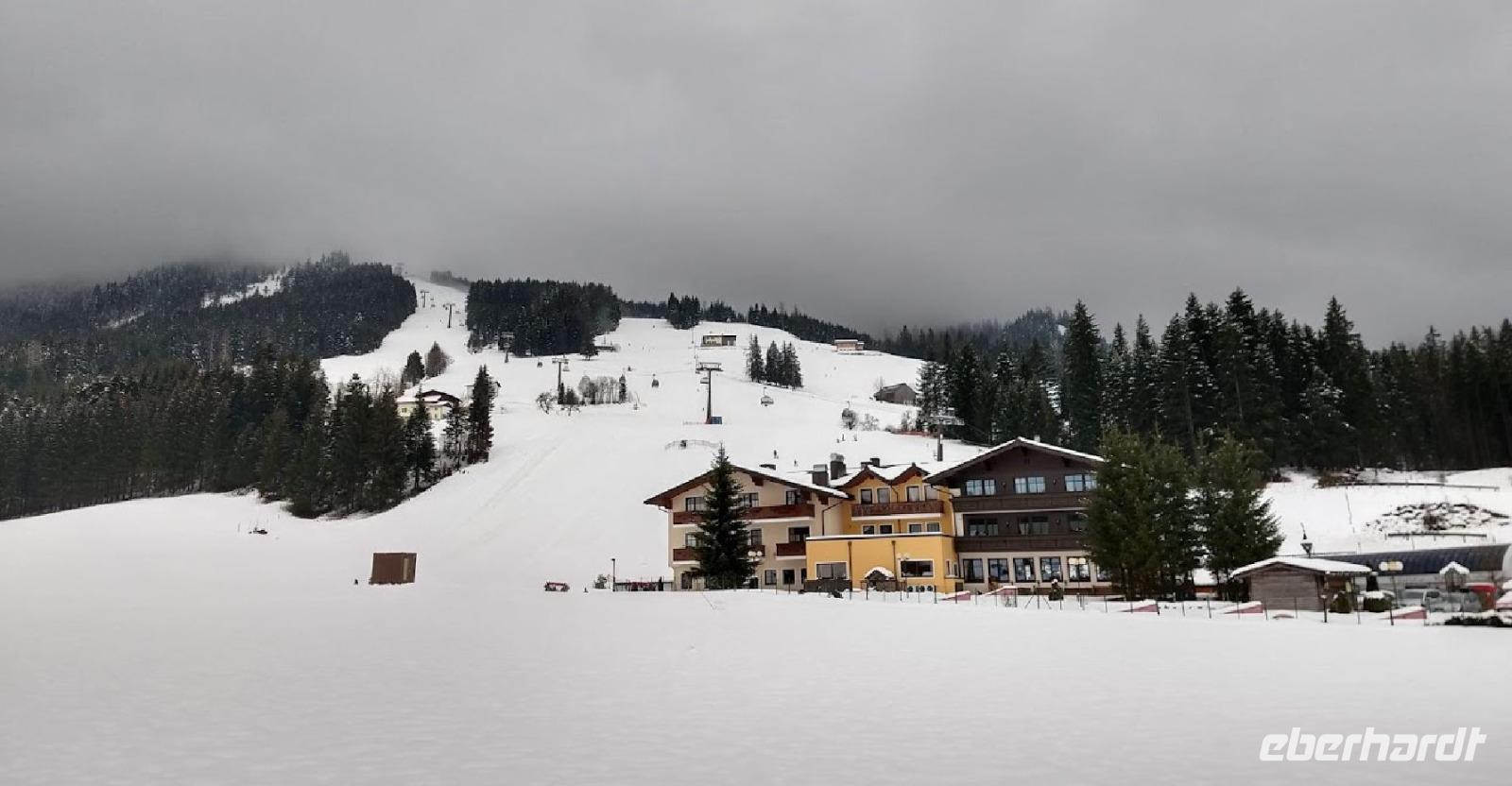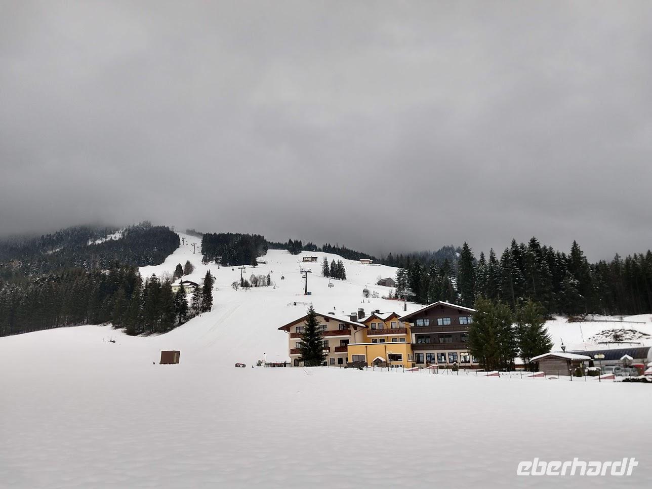 Hier am Gebirge liegt Schnee und der Ski- und Rodelbetrieb an der Karkogel-Seilbahn ist in vollem Gange.