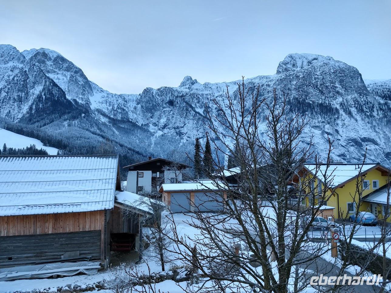 Wir entscheiden uns zur Sicherheit für unsere Gäste nicht über den Pass Gschütt zu fahren, da bei diesem Schneefall und der Glätte die steilen Abfahrten nach Gosau und nach Hallstadt sehr riskant wären.