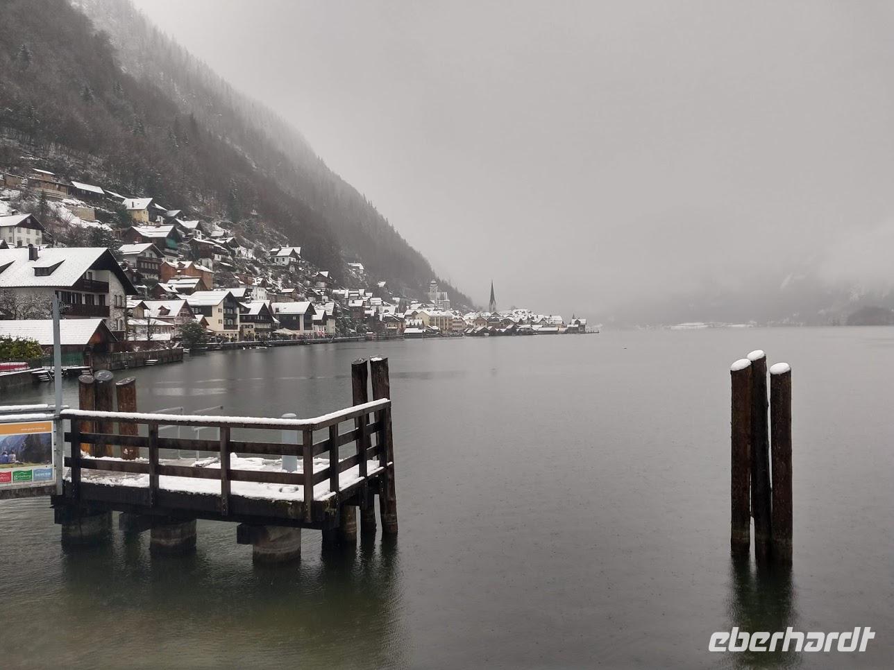 Von Abtenau fahren wir im Flockenwirbel also wieder nach Salzburg und weiter auf der Autobahn und der Landstraße zum Fuschlsee. Vorbei am Wolfgangsee und Bad Ischl erreichen wir bald das Trauntal mit dem Hallstädter See. Die Tourismusregion des Westlichen Dachsteins ist UNESCO-Welterberegion. Leider regnet es hier in Hallstadt sehr kräftig, wie es weiter oben eben kräftig schneit.