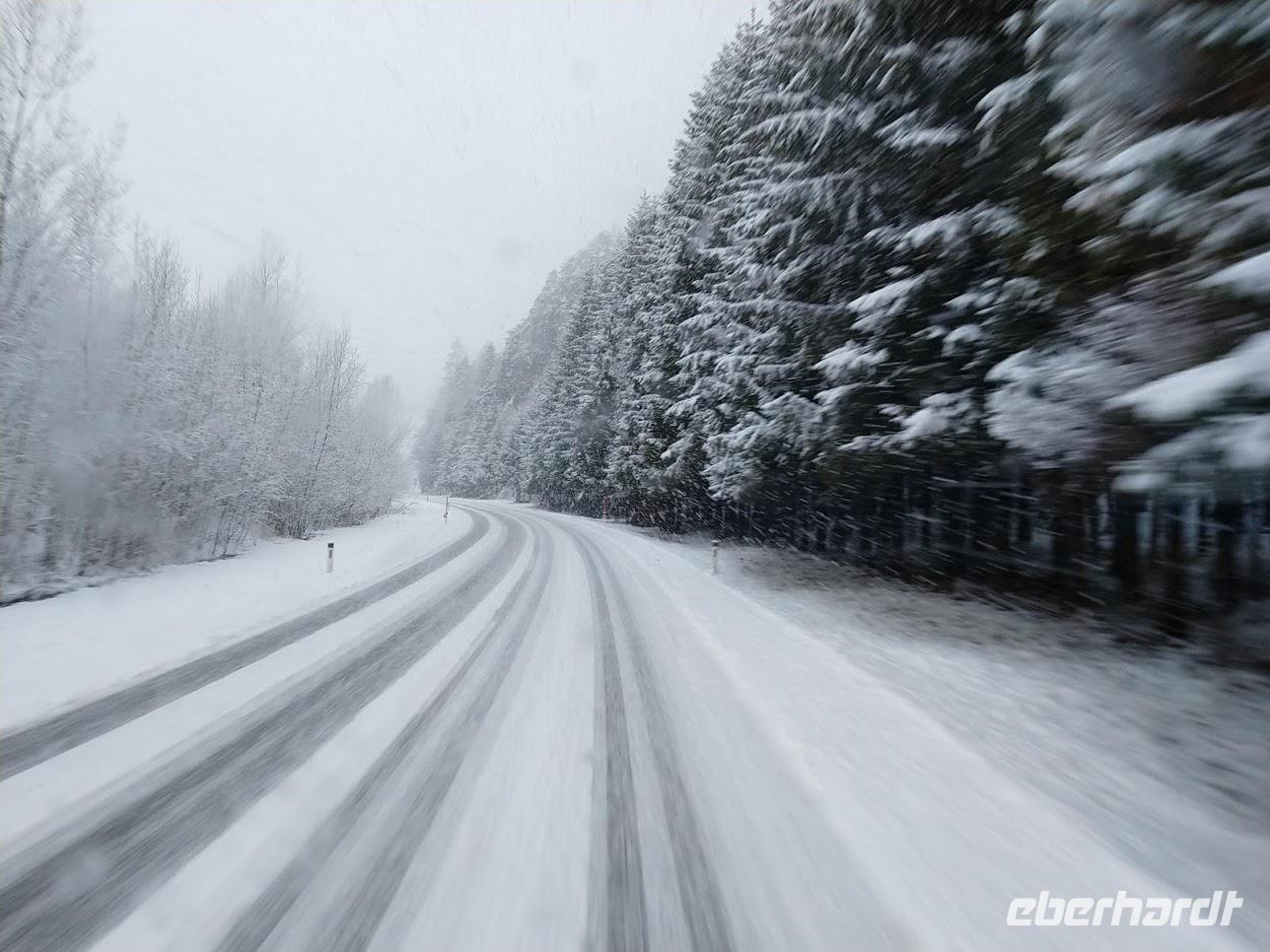 Die Straßenverhältnisse sind äußerst angespannt, da der Winterdienst auf allen Strecken unterwegs sein muss und das bei dem Schneefall kaum schaffen kann.