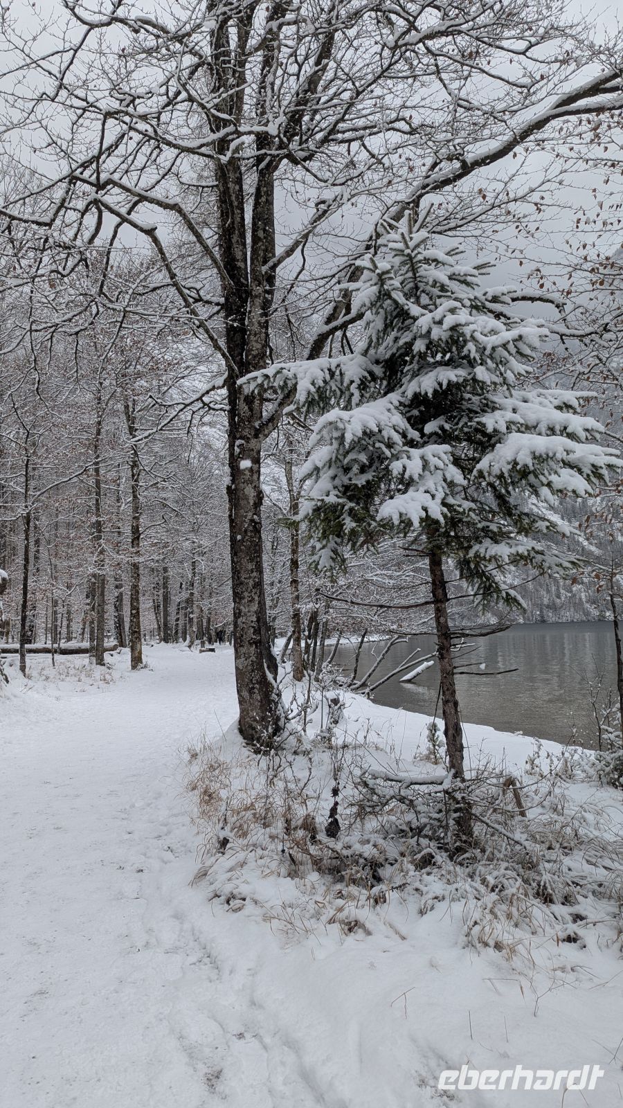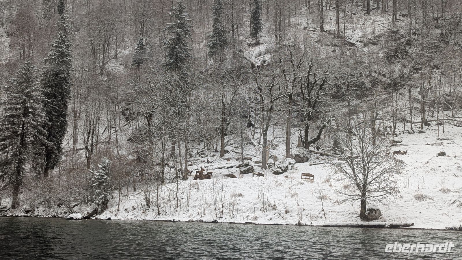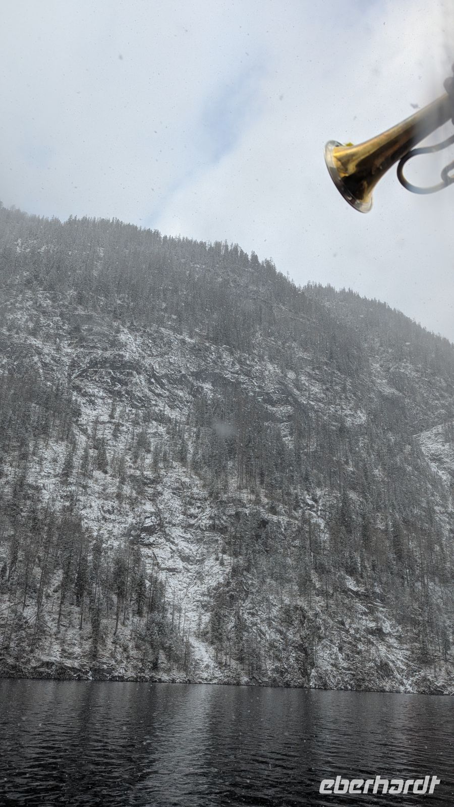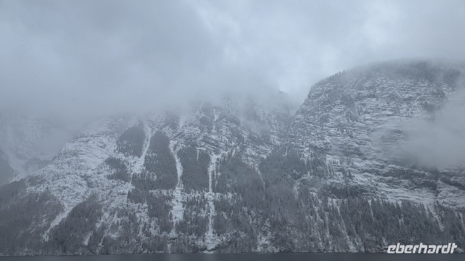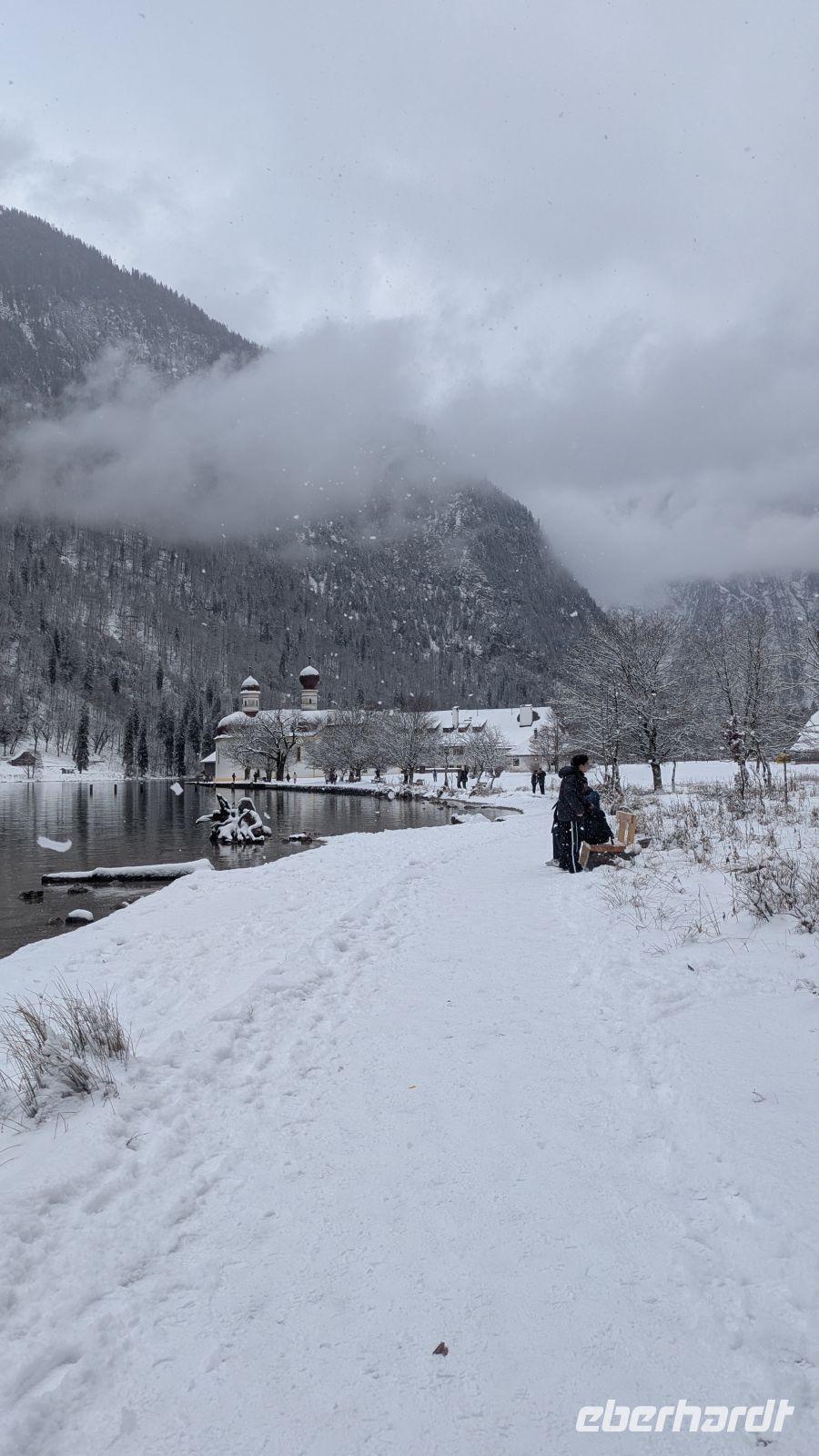 Nur wenige Minuten später erreichten wir Schönau am Königssee. Von dort aus starteten wir unsere Schifffahrt über den Königssee bis nach St. Bartholomä. Nachdem uns an den Tagen zuvor strahlender Sonnenschein begleitet hatte, wurden wir heute mit Schneefall überrascht. Die verschneite Landschaft verlieh dem See eine besondere Stimmung.