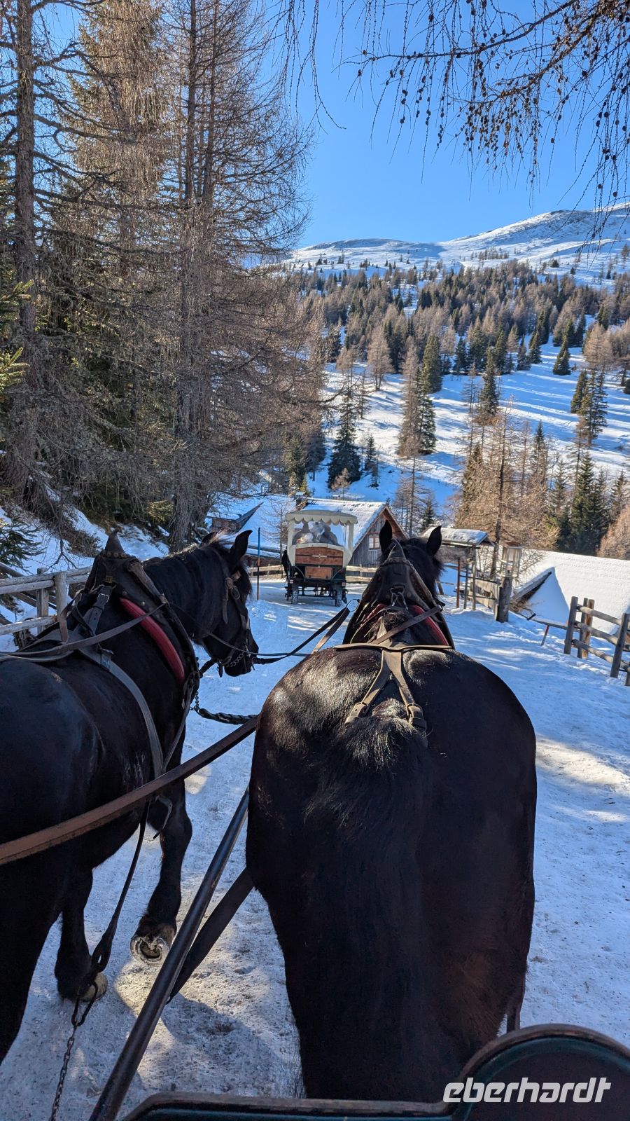 Auf rund 1.600 Metern Höhe angekommen, warteten wir voller Vorfreude auf unsere Pferdeschlitten. Und dann kamen sie auch schon mit klingelnden Glocken, schnaubenden Pferden und einer Atmosphäre wie aus einem Wintermärchen. Wir stiegen ein, kuschelten uns tief in die warmen Decken und ließen die Szenerie auf uns wirken. Ringsum glitzerte der Schnee in der Sonne, während wir Skifahrer beobachteten, die die Pisten hinabsausten oder bereits zur gemütlichen Einkehr in einer Alm saßen.