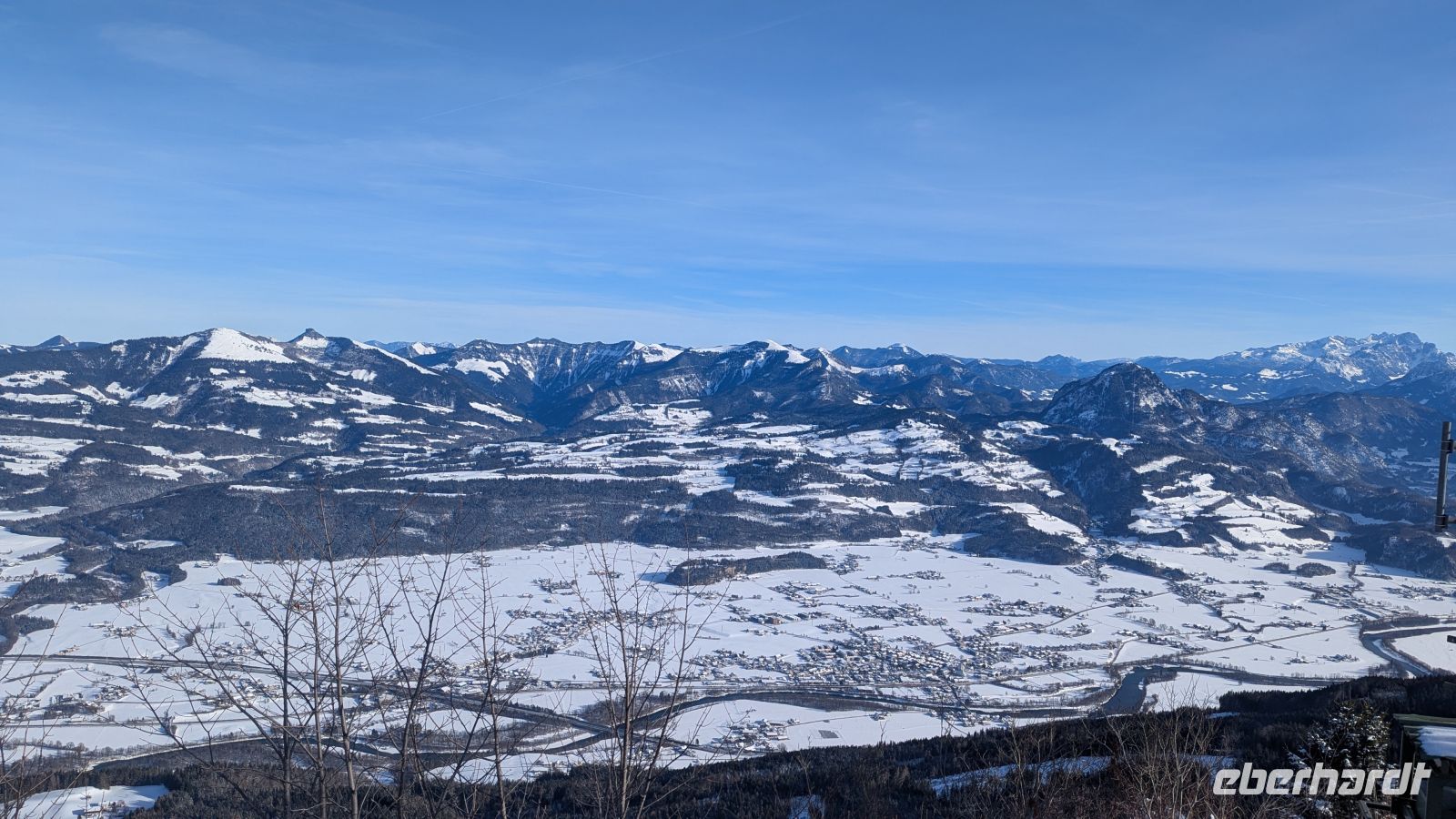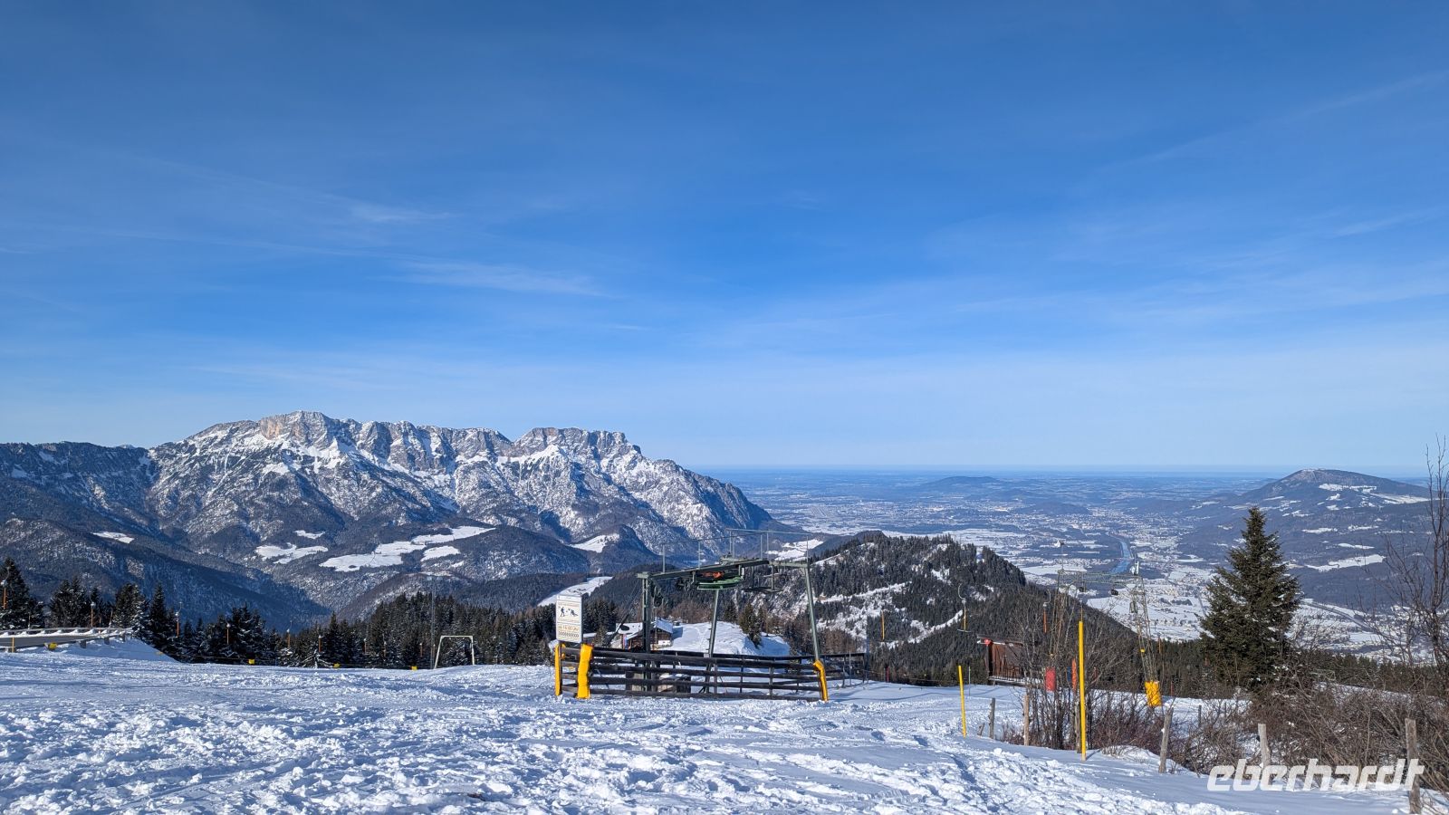 Die Fahrt führte uns hinauf bis auf etwa 1.600 Meter Höhe. Schon während der Auffahrt eröffneten sich immer neue Ausblicke auf die umliegende Bergwelt. An einem Aussichtspunkt legten wir einen Stopp ein und spazierten einen Panorama-Rundweg entlang. Von hier aus hatten wir einen fantastischen Blick auf Berchtesgaden, die Stadt Salzburg und zahlreiche Gipfel der Alpen. Auch der markante Watzmann war sowohl auf dem Hin- als auch auf dem Rückweg gut zu erkennen. Wohin man auch schaute, die Aussicht wurde mit jedem Schritt beeindruckender. In der winterlichen Landschaft sahen wir auch einige Kinder, die fröhlich den Hang hinunter rodelten.
