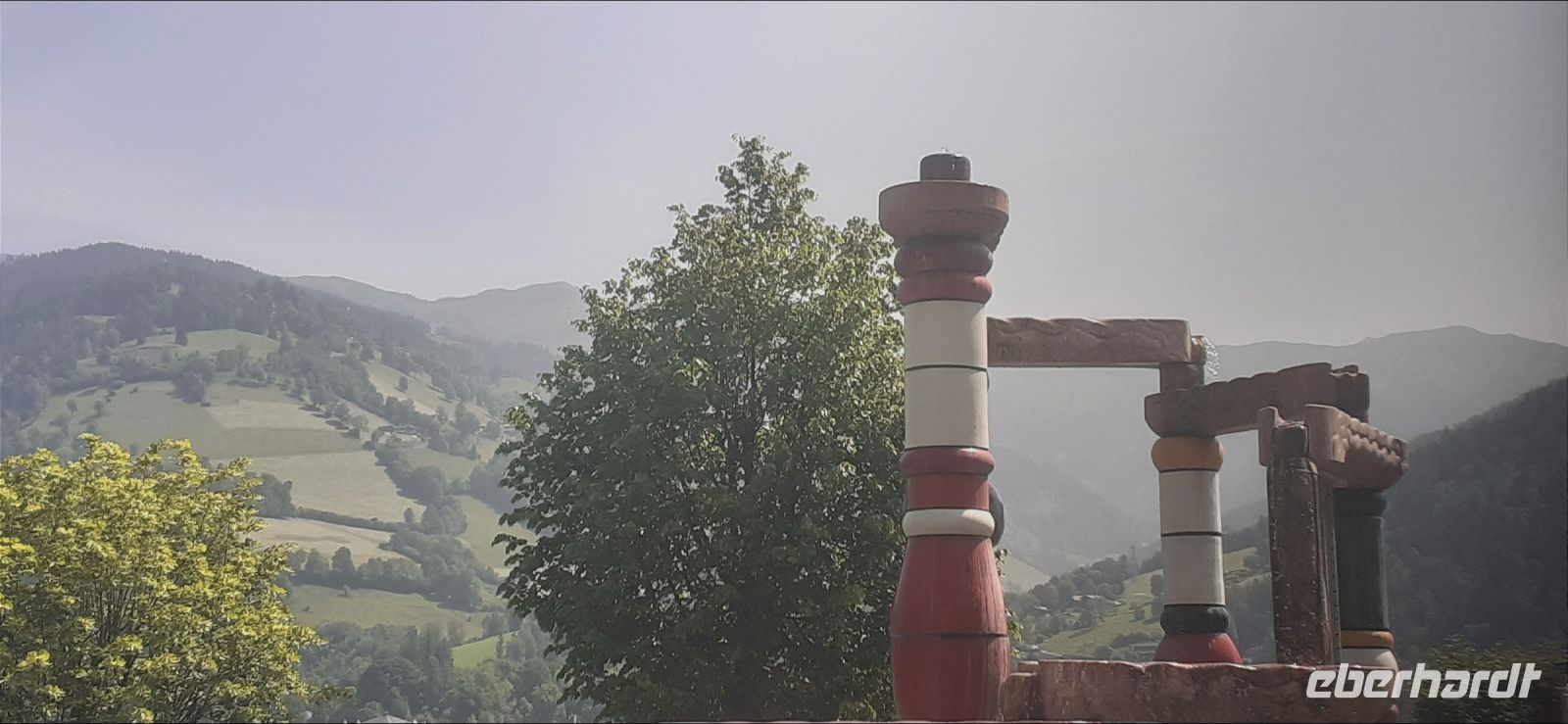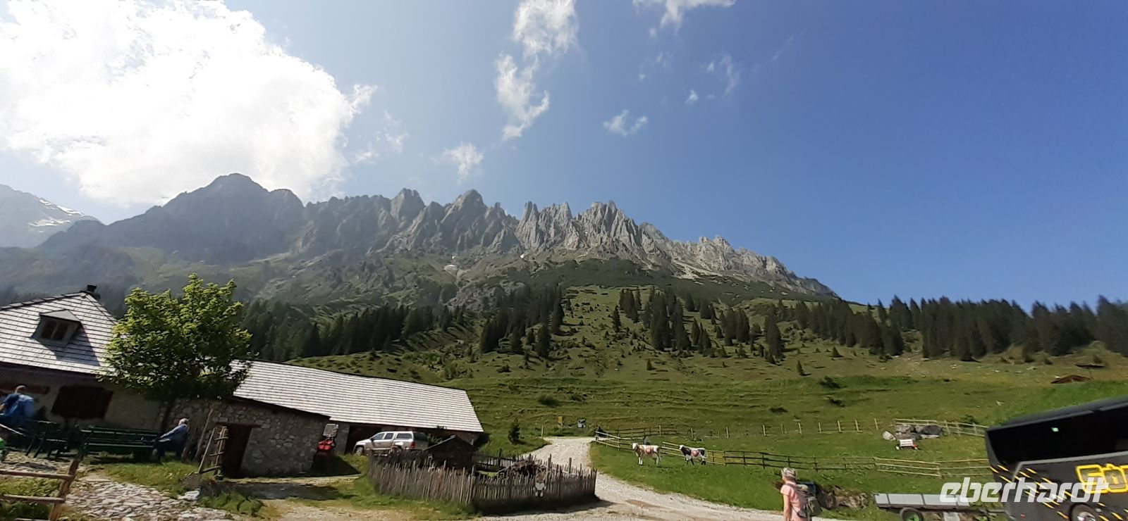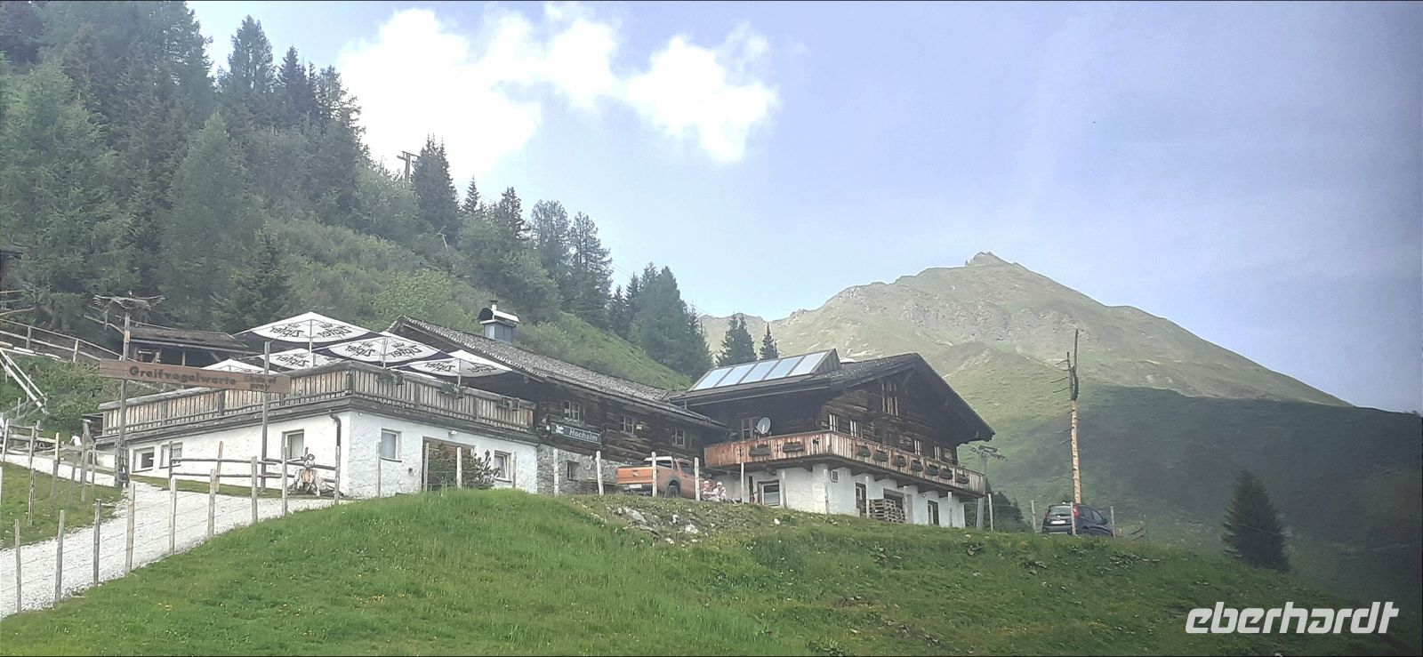 Leider regnete es am Morgen. So beschlossen wir mir mit Trudi eine Rundfahrt Richtung Zell am See und durch Maishofen zu unternehmen. Dabei erhielten wir interessante Informationen über die Region und Maishofen. Langsam hörte es auf zu Regnen. Wir fuhren nach Saalbach Hinterklemm zum Parkplatz der Talschlussbahn. Von dort ging es per Traktor weiter bis zur Lindling Alm. Dort kehrten wir ein. In einer gemütlichen Stube ließen wir uns die Köstlichkeiten schmecken. Über die "Golden Gate Bridge" der Alpen liefen wir hinüber zum Baumzipfelweg. Die 200 Meter lange Brücke überspannt den Talschluss. Nun ging es auf den 1 km langen Baumzipfelweg, dem höchstgelegenen Wipfelwanderweg Europas. Anschließend wanderten einige Gäste wieder zum Parkplatz zurück.