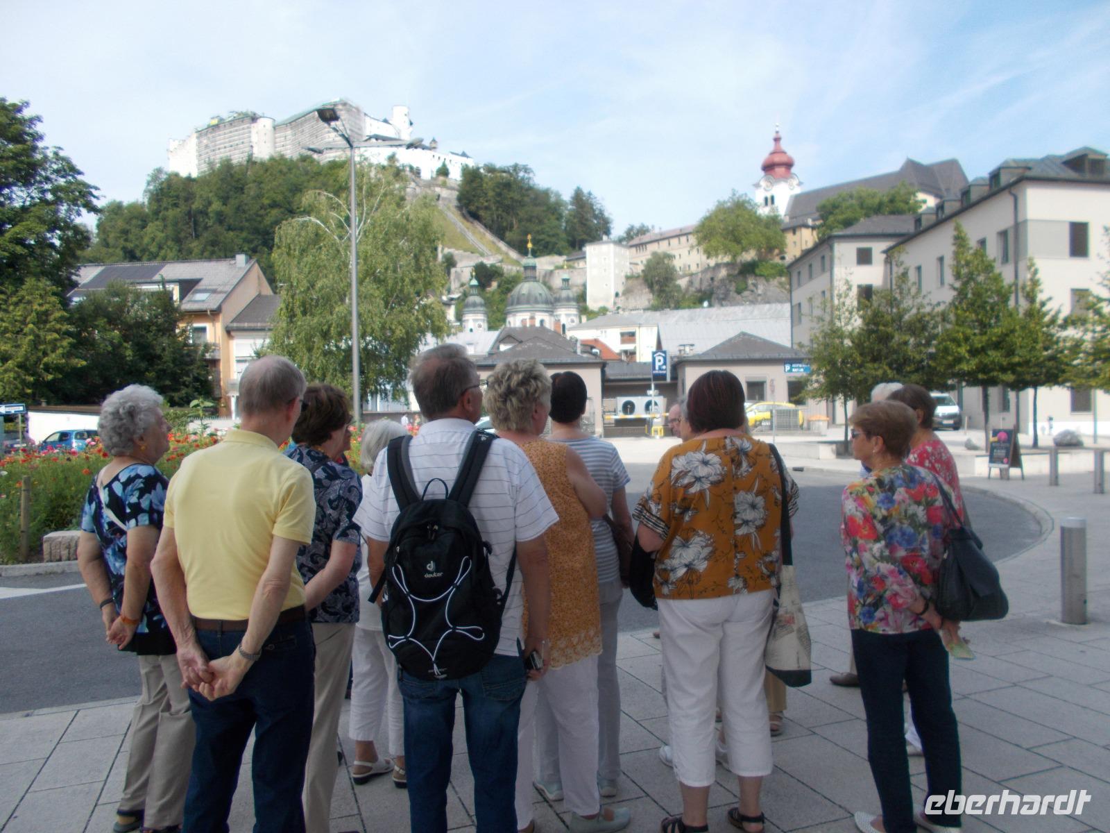 Die Hauptstadt, des Bundeslandes Salzburg ,war heute unser Ziel.Eingerahmt zwischen Kapuziner-Mönchs-und Festungsberg liegt die Stadt ,gleichen Namens, an der durchfließenden Salzach .Der Salzhandel brachte den Reichtum und Mozart den Bekanntheitsgrad.Viele andere Künstler trugen ebenfalls dazu bei ,den Ruhm Salzburgs in die Welt zu tragen.Im Moment wird schon wieder,vor der Kulisse des Doms,die Inszenierung des „Jedermann"geprobt.Unsere örtliche Stadtführerin schlenderte mit uns durch die belebten,verwinkelten Gassen der Festspielstadt.Unser Rundgang begann am Busterminal -Nonnental,mit Blick auf die gigantisch Festung Hohensalzburg.Über den Mozartplatz gelangten wir zur Fürsterzbischöflichen Residenz.Von dort ist es ein Katzensprung zur Bühne des „Jedermann"und Doms.Eine kleine Verschnaufpause im Kirchengestühl und dann bestaunten wir das Taufbecken von Mozart.Die Erzabtei St.Peter ,die als Benediktiner Kloster gegründet wurde und heute noch als solches fungiert,lag auf unserem Weg.Die berühmte Getreidegasse besuchten wir im Anschluss .Wie erwartet war dies auch Ziel, der vielen anderen Touristen ,die das Geburtshaus ,von Mozart ,sehen wollten.Hier teilte sich dann auch unsere Gruppe.Ein Teil ging, mit der Stadtführerin, hinüber zum Schloss Mirabell und die anderen Gäste folgten Kerstin zum alten Markt.Süße Genüsse versprach uns das ,1703 gegründete,Café Tomaselli. Eine Fiaker Fahrt gehört sicherlich auch in Salzburg dazu und einige Gäste genossen dies sichtlich.Am Nachmittag trafen wir uns vorm „Jedermann"und kehrten langsam der Stadt den Rücken.Auf der Heimfahrt erhaschten wir noch einen kleinen Blick,stadtauswärts,auf Schloss Hellbrunn und den Bergzoo.