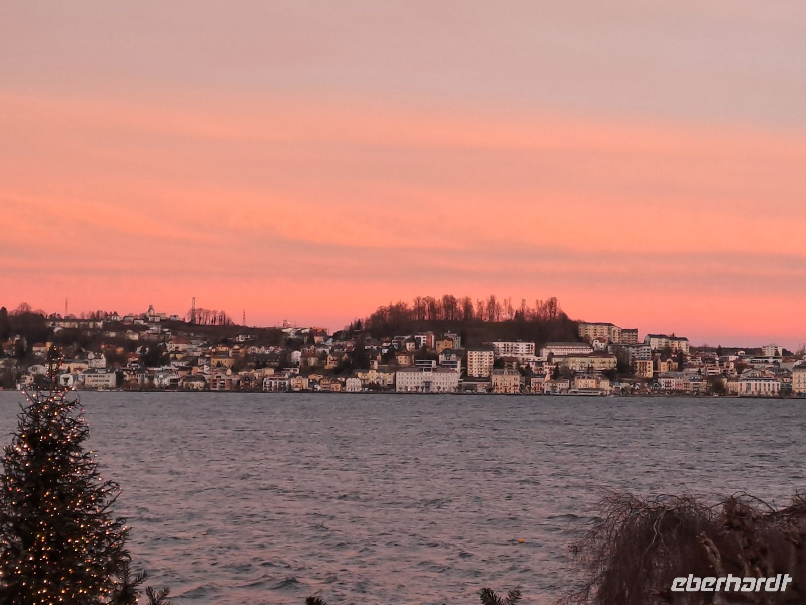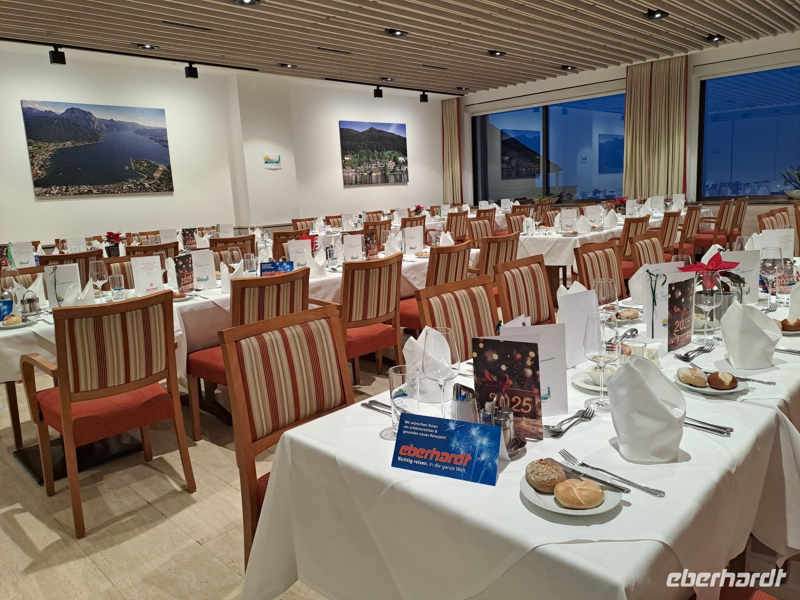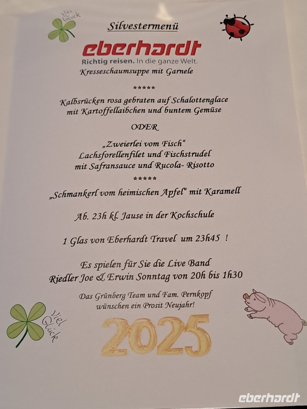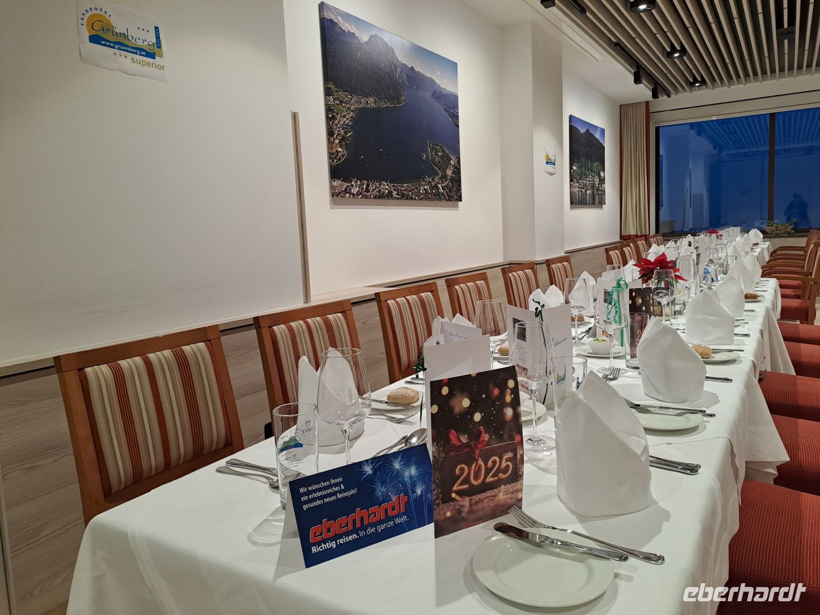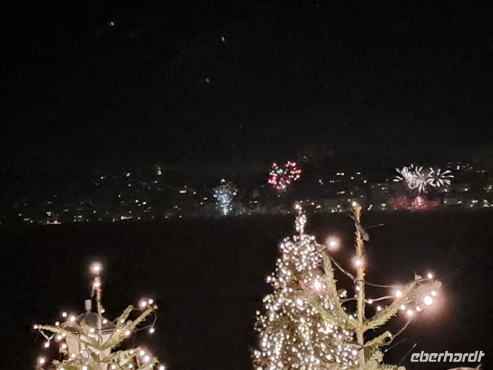 Nach einem guten Frühstück im Hotel sind wir wieder um 9:00 Uhr mit dem Bus zur Talstation der Feuerkogel-Seilbahn gestartet, welche sich am Südende des Traunsees in Ebensee befindet. Mit unseren von der Reiseleitung gekauften Tickets stiegen wir in eine Gondel, Den letzten Tag des Jahres begannen wir hoch oben. Zuerst hieß es zusammen mit vielen Skifahrern den Feuerkogel per Seilbahn zu erklimmen. welche uns mit Schwung in wenigen Minuten auf mehr als 1500m Höhe brachte. Oben angekommen konnte man einen wunderbaren Spaziergang bei herrlichem Sonnenschein und Blick auf die Berge genießen . Oben haben wir bei minus 3 ° zunächst geschaut, ob jemand Luftnot o. ä. Probleme hatte, bevor wir uns auf die kleinen Spaziergänge auf dem Gipfel begaben. Hier waren diejenigen gut beraten, die rutschfeste Stiefel anhatten. Da gutes Wetter war, konnten wir vom Gasthaus Edelweiß aus das Europakreuz sehen. Um einen herum gab es aber natürlich neben den Wegen auch Pisten für Skifahrer, so dass wir auch den Familien bei ihren ersten Skiversuchen zuschauen konnten. Nach einer kurzen Einkehr sind wir 12.00 Uhr wieder mit der Gondel zur Talfahrt gestartet. Dann ging es mit dem Bus zurück nach Gmunden für eine Mittagspause auf dem kleinen Silvestermarkt – es gab noch ein paar kleine Stände und Buden. Am dortigen Fotorahmen haben wir dann noch einige tolle Bilder mit dem Hintergrund des tollen Bergpanoramas geschossen. Um 14 Uhr startete dann die einstündige Traunsee – Schiffsrundfahrt. Für unsere Gruppe waren Plätze reserviert, und vom Wasser aus hatten wir dann nochmal einen ganz anderen Blick auf die Uferpromenaden. Mit dem heißen Punsch/Glühwein an Bord war es ein Vergnügen und wir konnten die Fahrt auf dem See genießen. Nach der Rückkehr zum Hotel konnten wir dann ausruhen und uns auf den Silvesterabend vorbereiten. Diese startete dann 18.30 Uhr mit einem Gruß aus der Küche und einem leckeren 4-Gang-Galamenü. Von 20:00 Uhr bis 01:30 Uhr gab es gute Live-Musik. Es waren überwiegend tanzbare Evergreens und Klassiker, die jeder kannte, und aus jedem Genre und jeder Zeit war etwas dabei. Viele Gäste haben die Chance zum Tanzen auch genutzt. Das neue Jahr haben wir dann mit einem Glas Sekt begrüßt. Um 0:15 Uhr gab es für die Gruppe noch eine Überraschung: Im Raum der Kochschule gab es noch einen Servierwagen mit einem (Glücks-)Schweinekopf und einen kleinen kalten Buffet. … Also verhungern muss man in diesem Hotel definitiv nicht! ! Die letzten unserer Gruppe saßen noch bis 1:30 Uhr beim angeregten Plaudern, bevor der Neujahrsmorgen dann von der Müdigkeit verdrängt wurde.