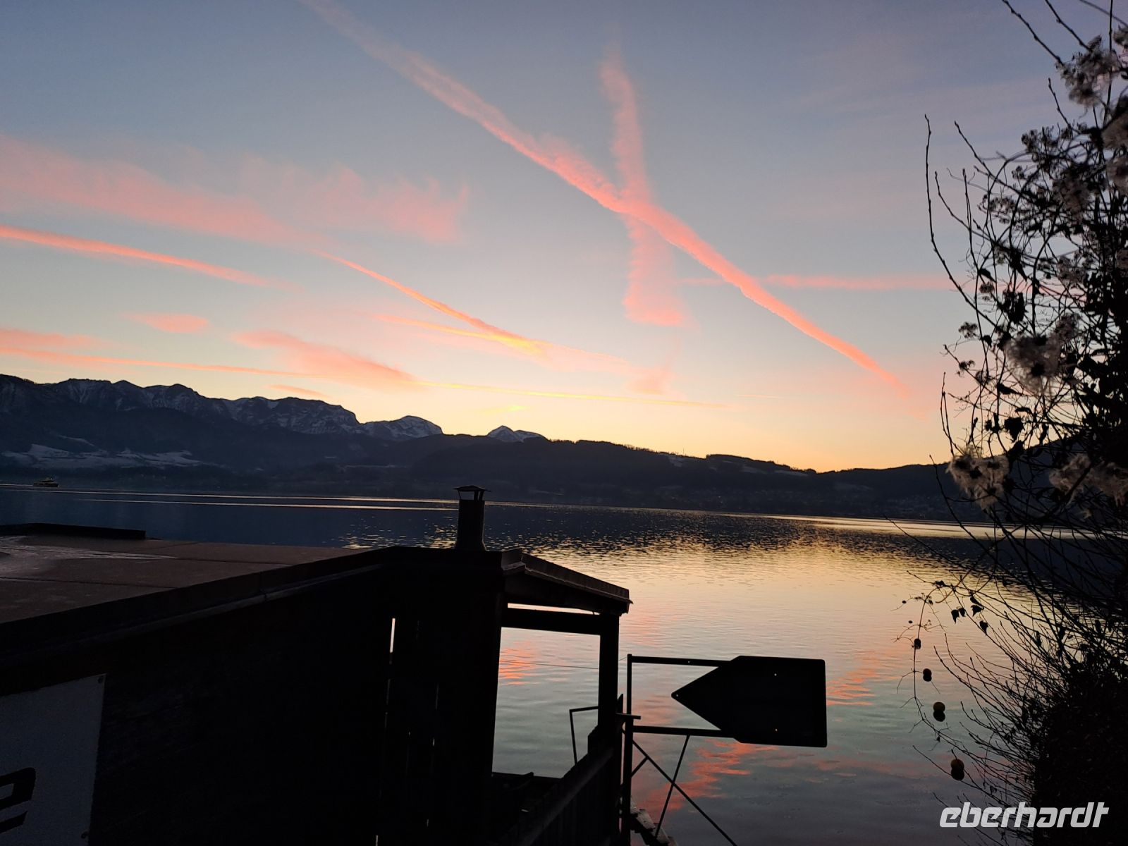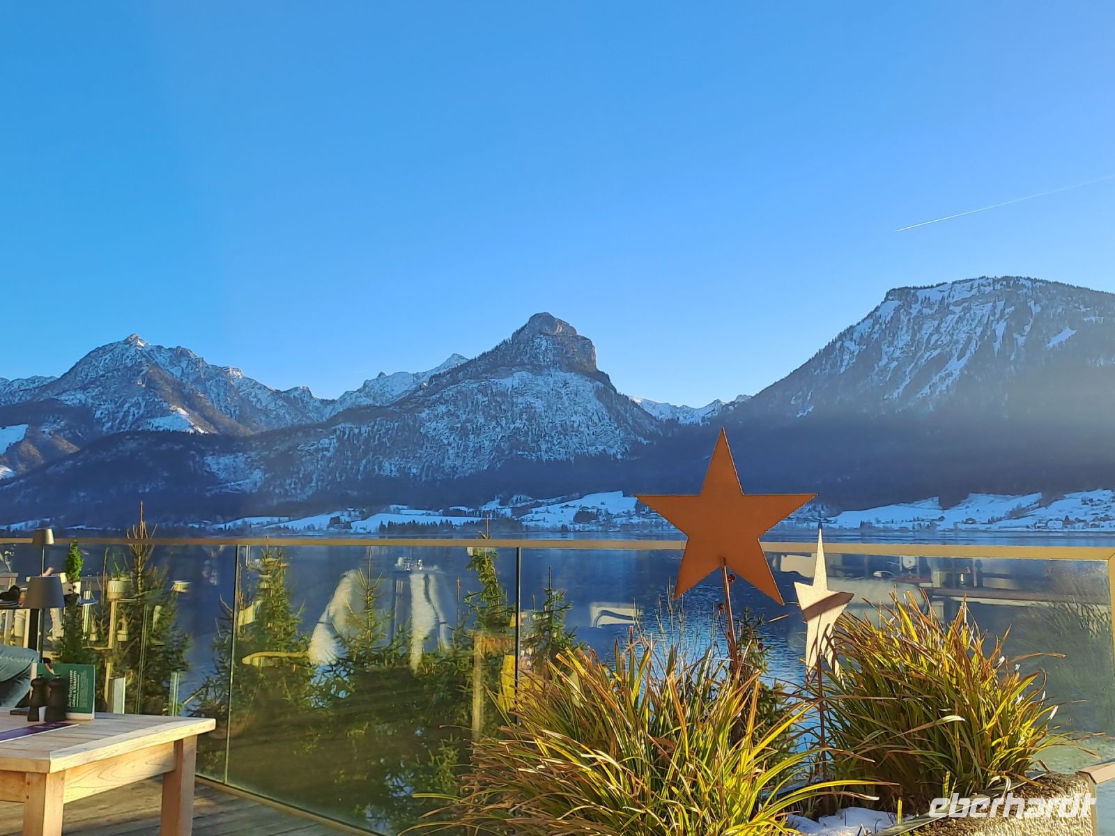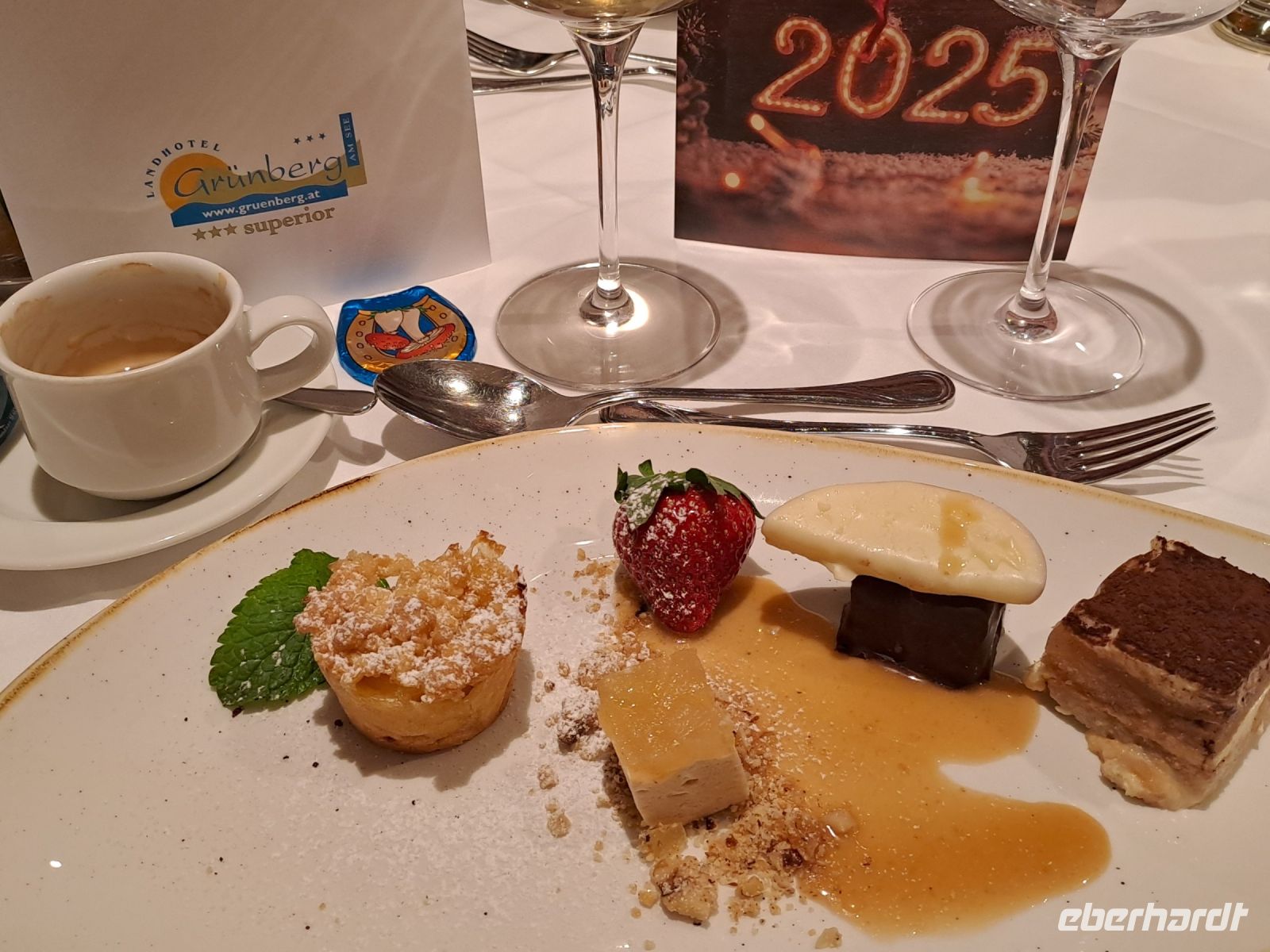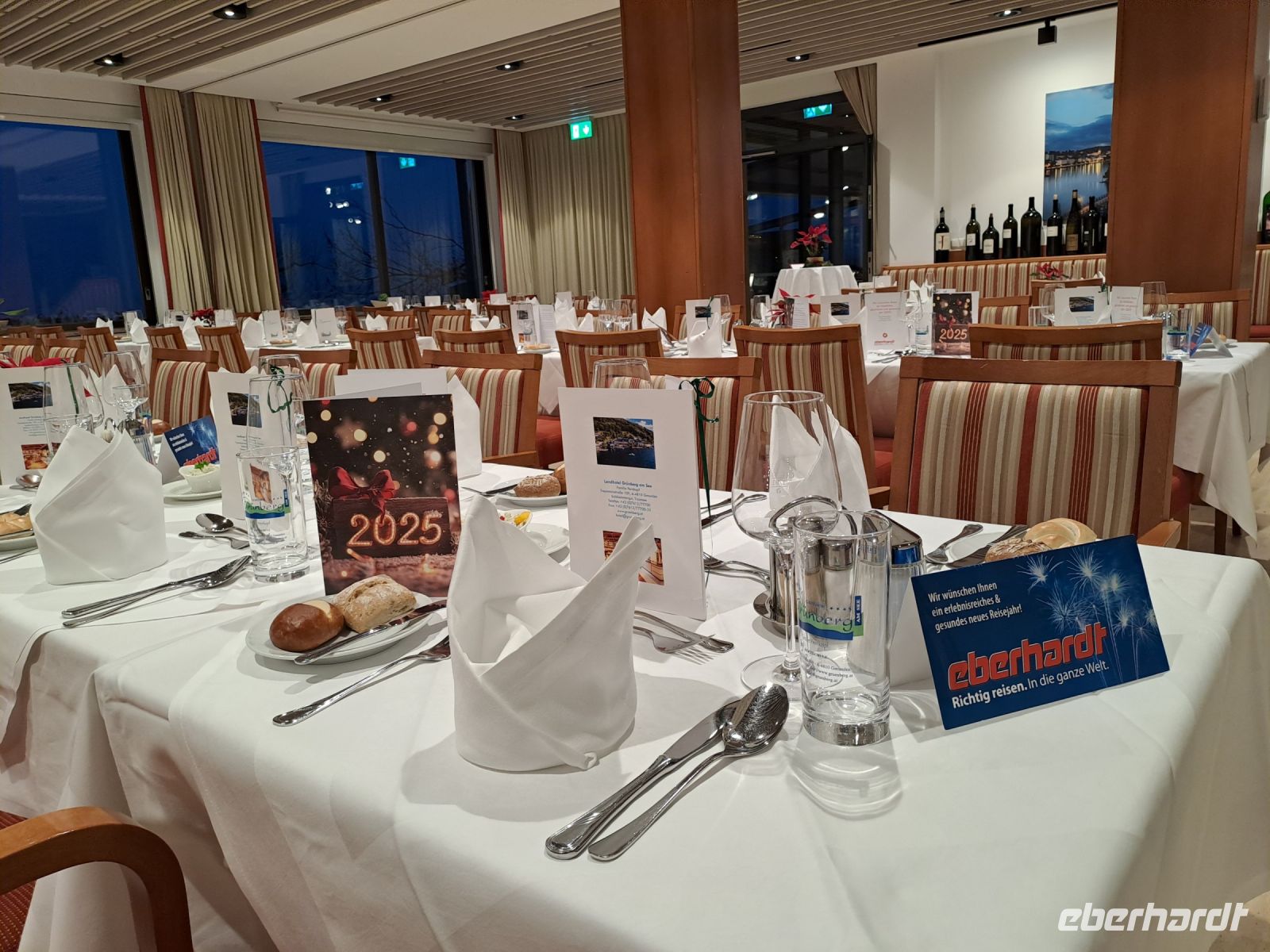 Nach einem guten Frühstück im Hotel sind wir wieder um 9:00 Uhr mit dem Bus zur Talstation der Feuerkogel-Seilbahn gestartet, welche sich am Südende des Traunsees in Ebensee befindet. Mit unseren von der Reiseleitung gekauften Tickets stiegen wir in eine Gondel, Den letzten Tag des Jahres begannen wir hoch oben. Zuerst hieß es zusammen mit vielen Skifahrern den Feuerkogel per Seilbahn zu erklimmen. welche uns mit Schwung in wenigen Minuten auf mehr als 1500m Höhe brachte. Oben angekommen konnte man einen wunderbaren Spaziergang bei herrlichem Sonnenschein und Blick auf die Berge genießen . Oben haben wir bei minus 3 ° zunächst geschaut, ob jemand Luftnot o. ä. Probleme hatte, bevor wir uns auf die kleinen Spaziergänge auf dem Gipfel begaben. Hier waren diejenigen gut beraten, die rutschfeste Stiefel anhatten. Da gutes Wetter war, konnten wir vom Gasthaus Edelweiß aus das Europakreuz sehen. Um einen herum gab es aber natürlich neben den Wegen auch Pisten für Skifahrer, so dass wir auch den Familien bei ihren ersten Skiversuchen zuschauen konnten. Nach einer kurzen Einkehr sind wir 12.00 Uhr wieder mit der Gondel zur Talfahrt gestartet. Dann ging es mit dem Bus zurück nach Gmunden für eine Mittagspause auf dem kleinen Silvestermarkt – es gab noch ein paar kleine Stände und Buden. Am dortigen Fotorahmen haben wir dann noch einige tolle Bilder mit dem Hintergrund des tollen Bergpanoramas geschossen. Um 14 Uhr startete dann die einstündige Traunsee – Schiffsrundfahrt. Für unsere Gruppe waren Plätze reserviert, und vom Wasser aus hatten wir dann nochmal einen ganz anderen Blick auf die Uferpromenaden. Mit dem heißen Punsch/Glühwein an Bord war es ein Vergnügen und wir konnten die Fahrt auf dem See genießen. Nach der Rückkehr zum Hotel konnten wir dann ausruhen und uns auf den Silvesterabend vorbereiten. Diese startete dann 18.30 Uhr mit einem Gruß aus der Küche und einem leckeren 4-Gang-Galamenü. Von 20:00 Uhr bis 01:30 Uhr gab es gute Live-Musik. Es waren überwiegend tanzbare Evergreens und Klassiker, die jeder kannte, und aus jedem Genre und jeder Zeit war etwas dabei. Viele Gäste haben die Chance zum Tanzen auch genutzt. Das neue Jahr haben wir dann mit einem Glas Sekt begrüßt. Um 0:15 Uhr gab es für die Gruppe noch eine Überraschung: Im Raum der Kochschule gab es noch einen Servierwagen mit einem (Glücks-)Schweinekopf und einen kleinen kalten Buffet. … Also verhungern muss man in diesem Hotel definitiv nicht! ! Die letzten unserer Gruppe saßen noch bis 1:30 Uhr beim angeregten Plaudern, bevor der Neujahrsmorgen dann von der Müdigkeit verdrängt wurde.