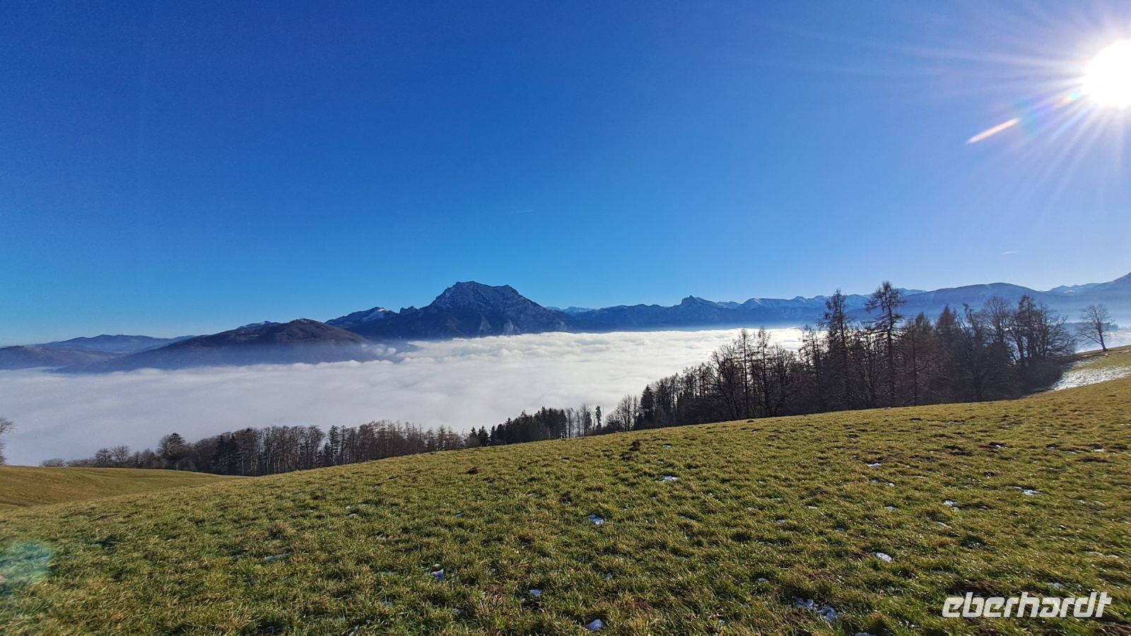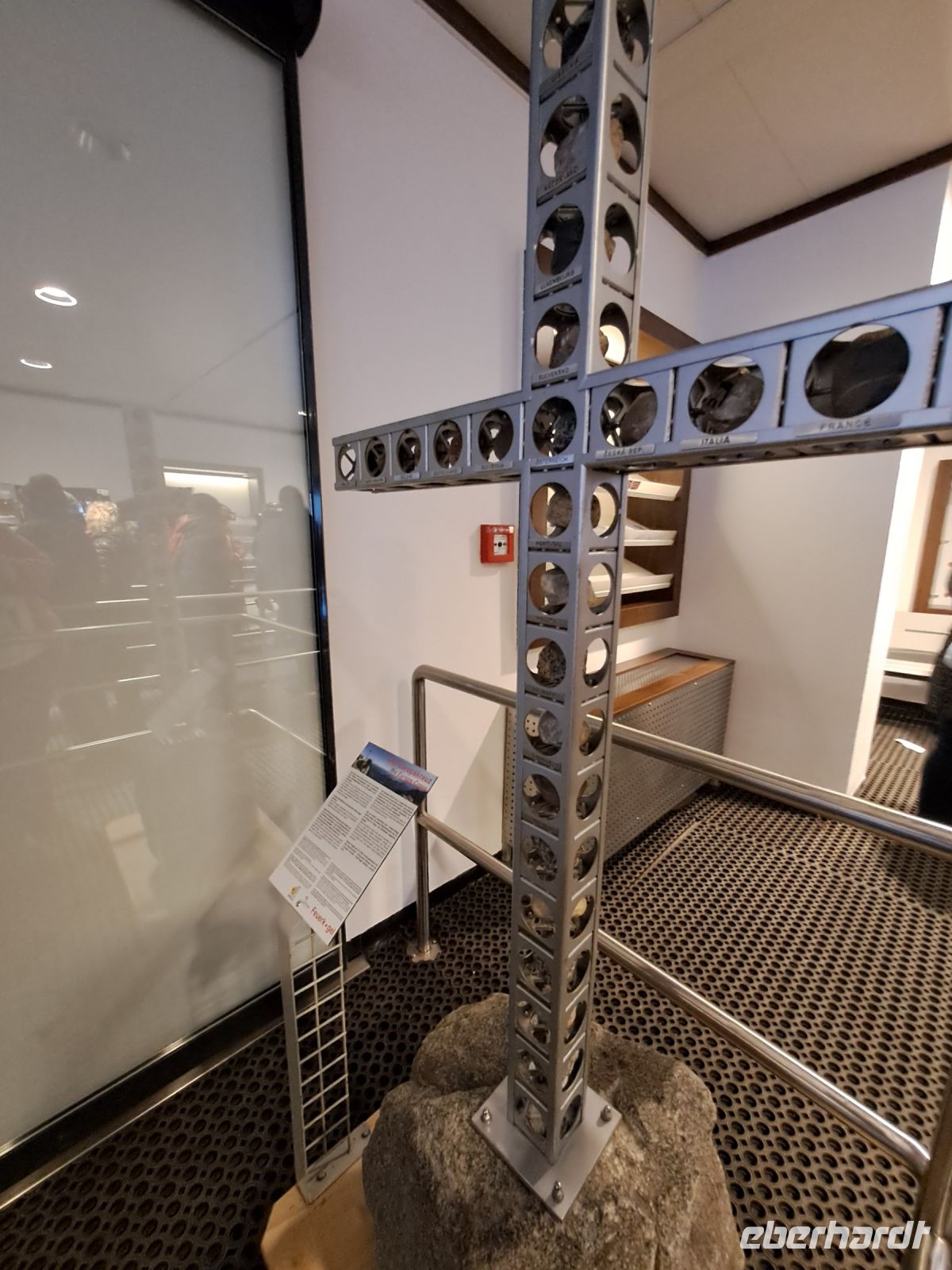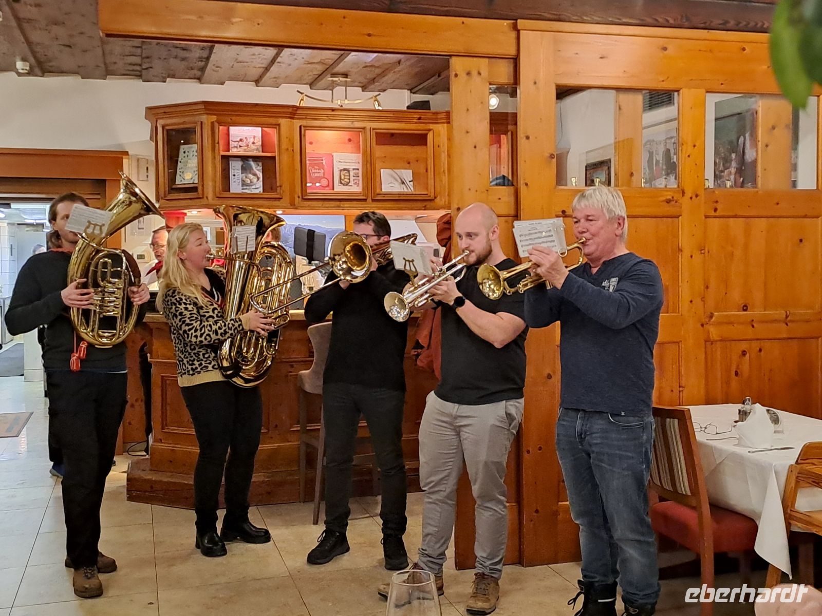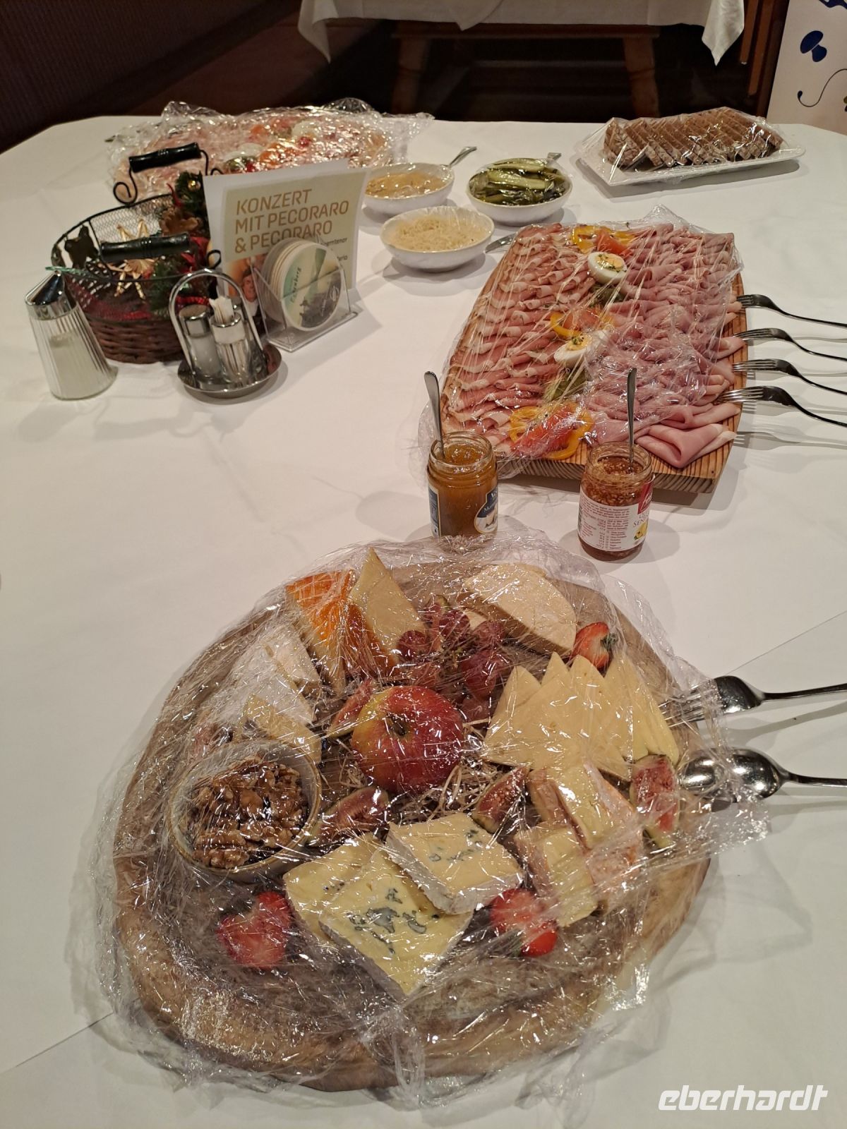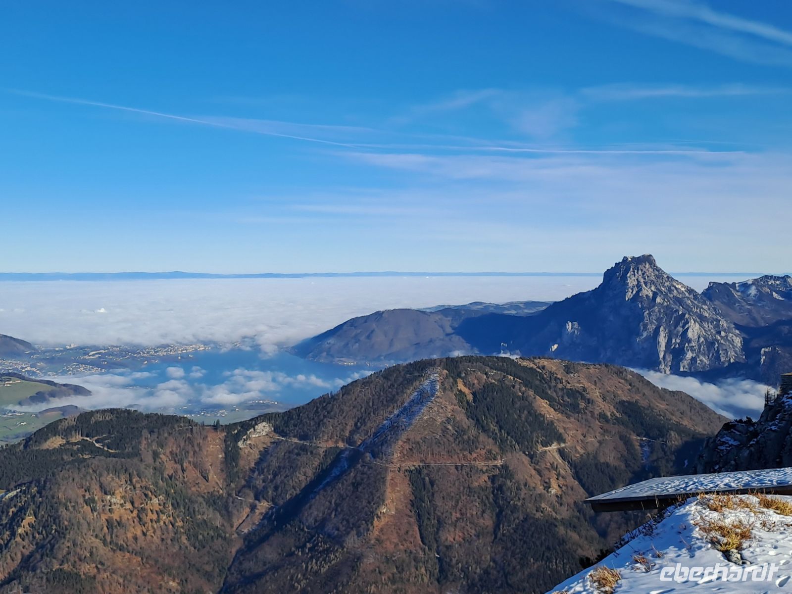 Nach einem guten Frühstück im Hotel sind wir wieder um 9:00 Uhr mit dem Bus zur Talstation der Feuerkogel-Seilbahn gestartet, welche sich am Südende des Traunsees in Ebensee befindet. Mit unseren von der Reiseleitung gekauften Tickets stiegen wir in eine Gondel, Den letzten Tag des Jahres begannen wir hoch oben. Zuerst hieß es zusammen mit vielen Skifahrern den Feuerkogel per Seilbahn zu erklimmen. welche uns mit Schwung in wenigen Minuten auf mehr als 1500m Höhe brachte. Oben angekommen konnte man einen wunderbaren Spaziergang bei herrlichem Sonnenschein und Blick auf die Berge genießen . Oben haben wir bei minus 3 ° zunächst geschaut, ob jemand Luftnot o. ä. Probleme hatte, bevor wir uns auf die kleinen Spaziergänge auf dem Gipfel begaben. Hier waren diejenigen gut beraten, die rutschfeste Stiefel anhatten. Da gutes Wetter war, konnten wir vom Gasthaus Edelweiß aus das Europakreuz sehen. Um einen herum gab es aber natürlich neben den Wegen auch Pisten für Skifahrer, so dass wir auch den Familien bei ihren ersten Skiversuchen zuschauen konnten. Nach einer kurzen Einkehr sind wir 12.00 Uhr wieder mit der Gondel zur Talfahrt gestartet. Dann ging es mit dem Bus zurück nach Gmunden für eine Mittagspause auf dem kleinen Silvestermarkt – es gab noch ein paar kleine Stände und Buden. Am dortigen Fotorahmen haben wir dann noch einige tolle Bilder mit dem Hintergrund des tollen Bergpanoramas geschossen. Um 14 Uhr startete dann die einstündige Traunsee – Schiffsrundfahrt. Für unsere Gruppe waren Plätze reserviert, und vom Wasser aus hatten wir dann nochmal einen ganz anderen Blick auf die Uferpromenaden. Mit dem heißen Punsch/Glühwein an Bord war es ein Vergnügen und wir konnten die Fahrt auf dem See genießen. Nach der Rückkehr zum Hotel konnten wir dann ausruhen und uns auf den Silvesterabend vorbereiten. Diese startete dann 18.30 Uhr mit einem Gruß aus der Küche und einem leckeren 4-Gang-Galamenü. Von 20:00 Uhr bis 01:30 Uhr gab es gute Live-Musik. Es waren überwiegend tanzbare Evergreens und Klassiker, die jeder kannte, und aus jedem Genre und jeder Zeit war etwas dabei. Viele Gäste haben die Chance zum Tanzen auch genutzt. Das neue Jahr haben wir dann mit einem Glas Sekt begrüßt. Um 0:15 Uhr gab es für die Gruppe noch eine Überraschung: Im Raum der Kochschule gab es noch einen Servierwagen mit einem (Glücks-)Schweinekopf und einen kleinen kalten Buffet. … Also verhungern muss man in diesem Hotel definitiv nicht! ! Die letzten unserer Gruppe saßen noch bis 1:30 Uhr beim angeregten Plaudern, bevor der Neujahrsmorgen dann von der Müdigkeit verdrängt wurde.