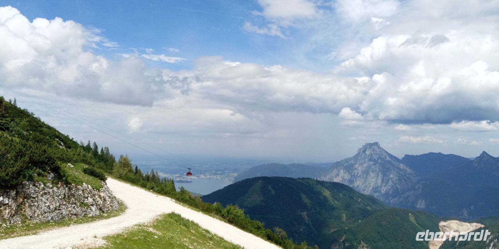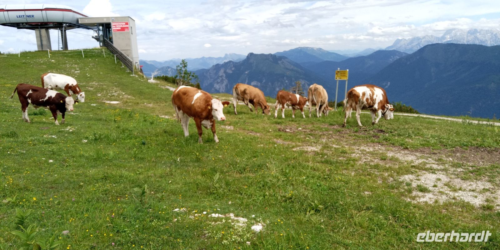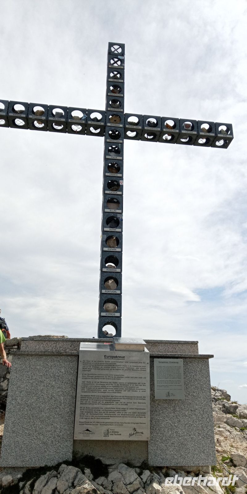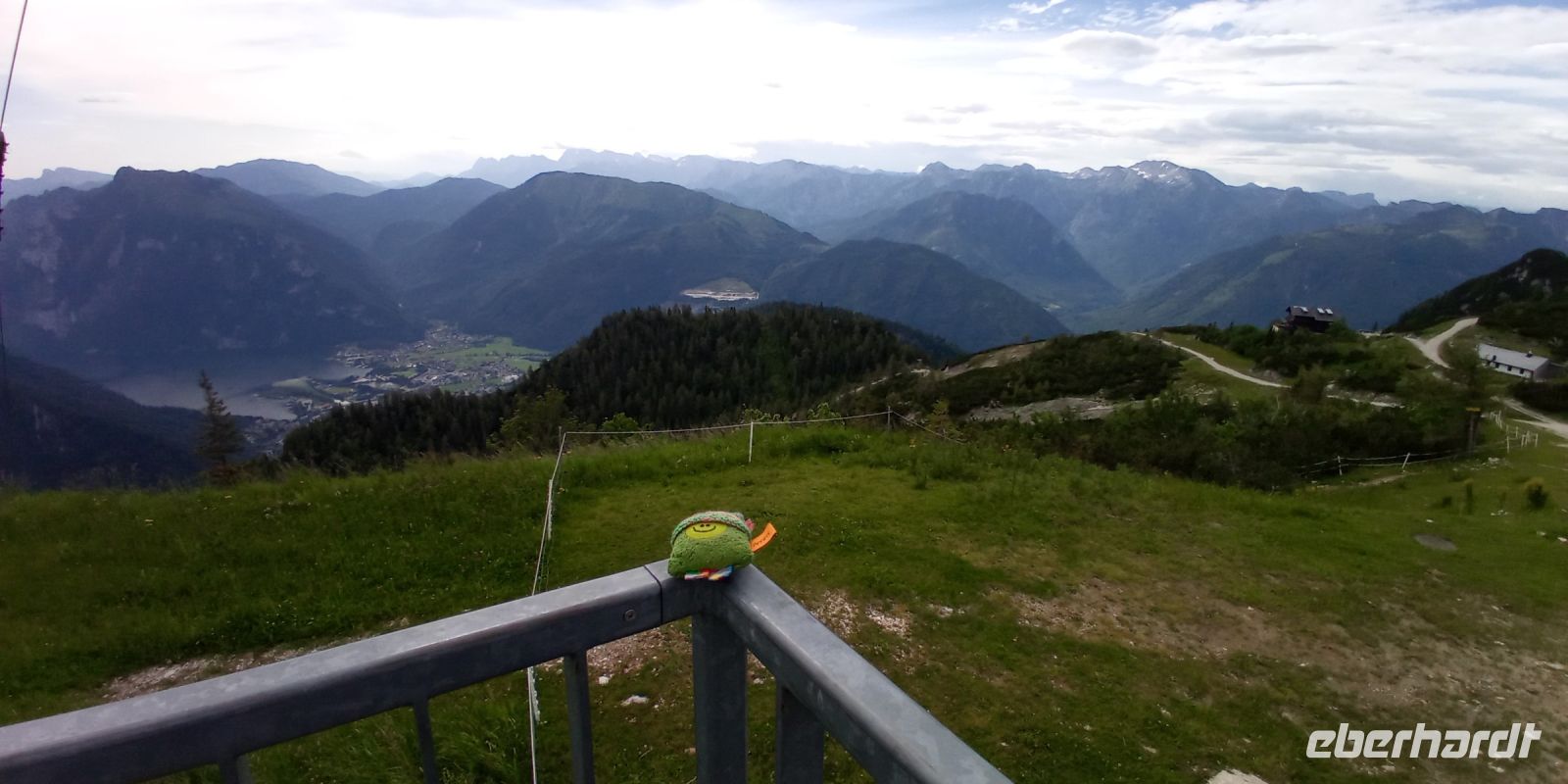 An unserem dritten Wandertag, erwartete uns am Morgen unsere heutige Bergführerin Barbara. So ging es heute auf den Weg zum Feuerkogel. Unser Busfahrer Andreas brachte uns zur Talstation der Feuerkogel-Bahn. Hier teilten wir heute unsere Wandergruppe. Barbara absolvierte mit 4 Gästen die anspruchsvolle Variante, nämlich den direkten Aufstieg zum Feuerkogel (1592 m). Die restliche Gruppe absolvierte mit mir die entspannte Variante. Wir fuhren mit der Feuerkogel-Bahn zur Bergstation hinauf, wo wir schon einen tollen Ausblick auf das Dachsteinmassiv und den Traunsee werfen konnten. Vom Feuerkogel aus starteten wir unsere Wanderung zum Europakreuz auf dem Alberfeldkogel (1707 m). Am Europakreuz konnten wir einen tollen Ausblick auf den vorderen Langbathsee genießen, welcher ja noch auf unserem Programm steht. Auch ein toller Blick bis zum Attersee bot sich dort oben. Das Europakreuz hat eine Besonderheit. Dieses Kreuz ist aus einzelnen Würfeln zusammen gebaut und jeder Würfel symbolisiert einen EU-Mitgliedsstaat. Gemütlich setzten wir unsere Wanderung fort, zurück Richtung Feuerkogel. So genossen wir einen weiteren tollen Ausblick auf den Traunsee am Pledigupf (1622 m). Anschließend legten wir eine Rast im Gasthof Edelweiss ein. Auch wenn ringsherum dunkle Wolken heranzogen, blieben wir aber auf dem Bergplateau trocken. So konnten wir die herrliche Landschaft noch ein wenig auf uns wirken lassen. Als am Nachmittag schließlich auch die andere Gruppe ihr Ziel erreicht hatte, fuhren wir alle zusammen wieder mit der Seilbahn hinunter ins Tal. Auf unserer Rückfahrt Richtung Altmünster, legten wir noch einen Stopp in dem kleinen Örtchen Traunkirchen ein. Barbara machte mit uns noch einen kleinen Spaziergang entlang der Seepromenade. Hier konnten wir die Füße ins Wasser halten, zur Abkühlung des heutigen Wandertages. Da es im Tal doch sehr warm war, gab es sogar ein paar mutige Badegäste. Individuell konnte jeder auch die idyllische Johannesbergkapelle besichtigen. Zurück am Hotel, ließen wir diesen schönen Tag wieder mit einem leckeren 3-Gänge Menü ausklingen.
