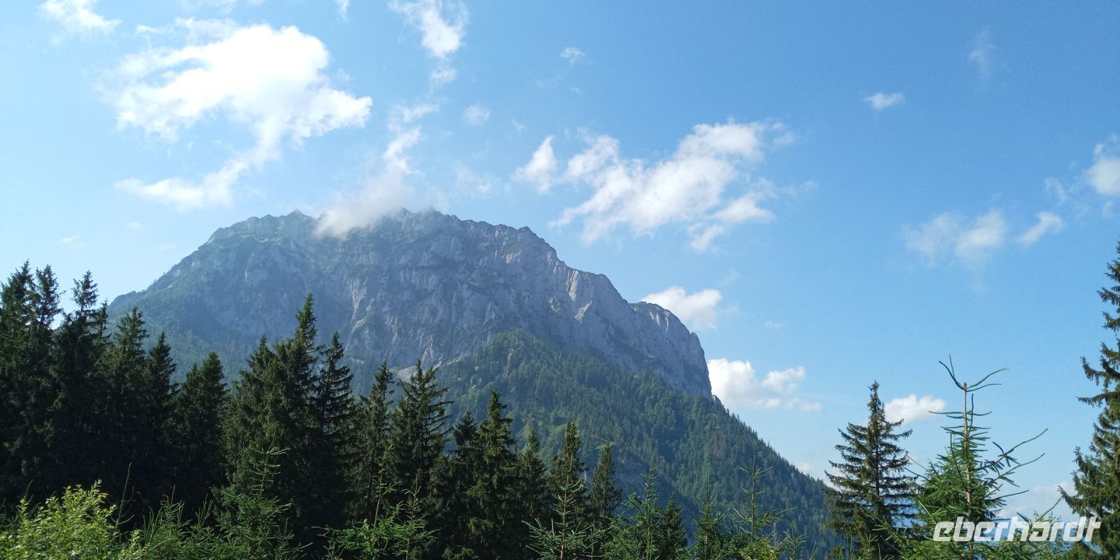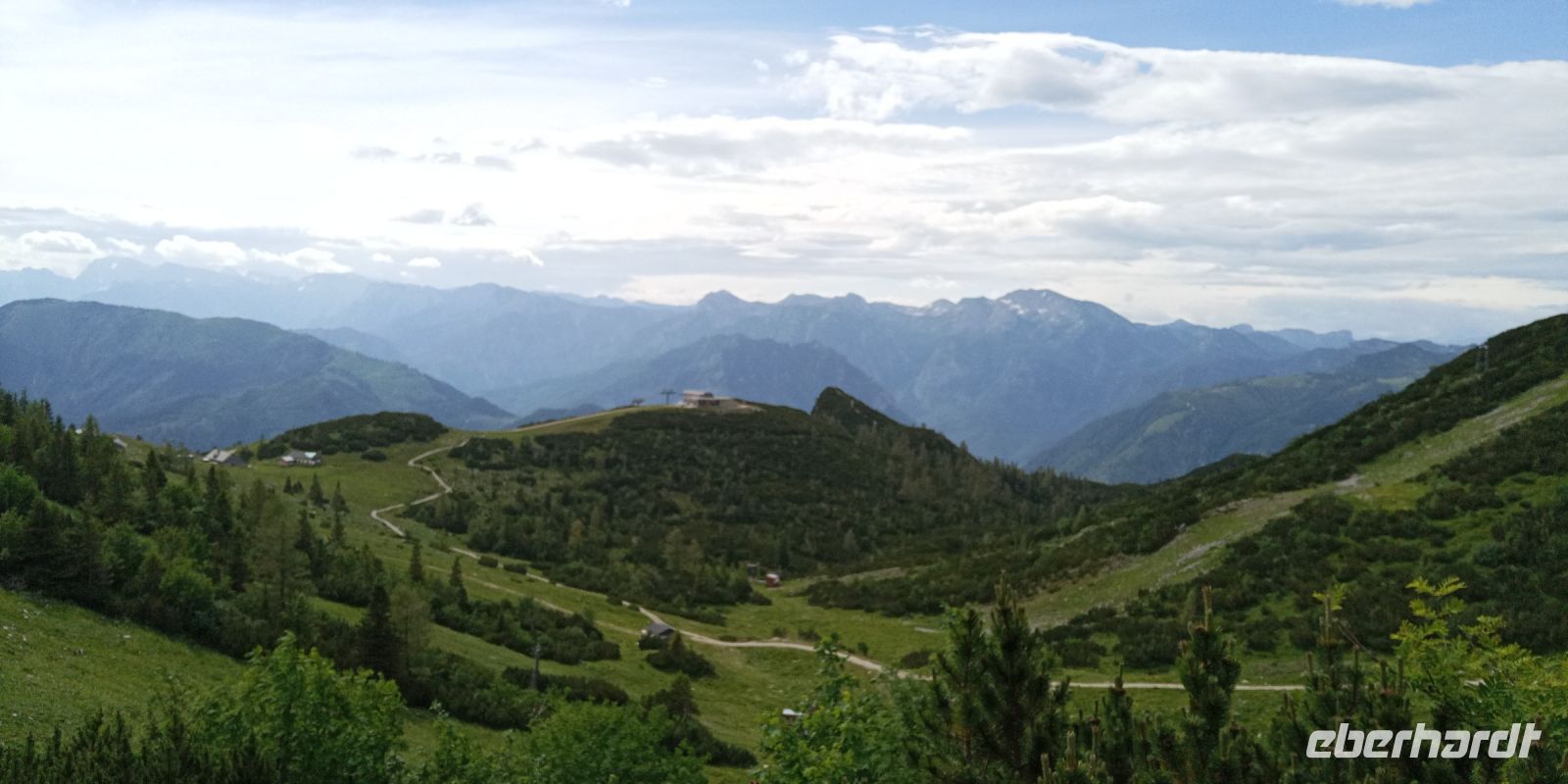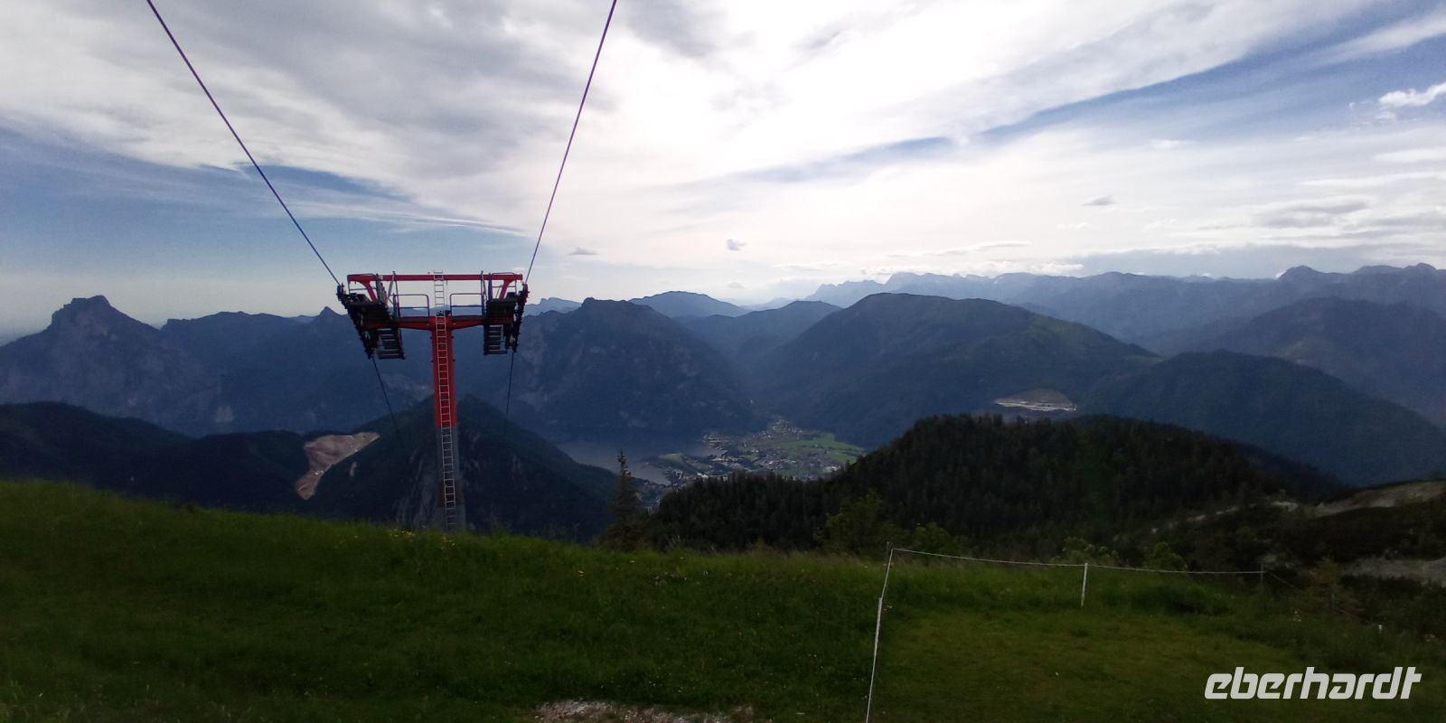 An unserem dritten Wandertag, erwartete uns am Morgen unsere heutige Bergführerin Barbara. So ging es heute auf den Weg zum Feuerkogel. Unser Busfahrer Andreas brachte uns zur Talstation der Feuerkogel-Bahn. Hier teilten wir heute unsere Wandergruppe. Barbara absolvierte mit 4 Gästen die anspruchsvolle Variante, nämlich den direkten Aufstieg zum Feuerkogel (1592 m). Die restliche Gruppe absolvierte mit mir die entspannte Variante. Wir fuhren mit der Feuerkogel-Bahn zur Bergstation hinauf, wo wir schon einen tollen Ausblick auf das Dachsteinmassiv und den Traunsee werfen konnten. Vom Feuerkogel aus starteten wir unsere Wanderung zum Europakreuz auf dem Alberfeldkogel (1707 m). Am Europakreuz konnten wir einen tollen Ausblick auf den vorderen Langbathsee genießen, welcher ja noch auf unserem Programm steht. Auch ein toller Blick bis zum Attersee bot sich dort oben. Das Europakreuz hat eine Besonderheit. Dieses Kreuz ist aus einzelnen Würfeln zusammen gebaut und jeder Würfel symbolisiert einen EU-Mitgliedsstaat. Gemütlich setzten wir unsere Wanderung fort, zurück Richtung Feuerkogel. So genossen wir einen weiteren tollen Ausblick auf den Traunsee am Pledigupf (1622 m). Anschließend legten wir eine Rast im Gasthof Edelweiss ein. Auch wenn ringsherum dunkle Wolken heranzogen, blieben wir aber auf dem Bergplateau trocken. So konnten wir die herrliche Landschaft noch ein wenig auf uns wirken lassen. Als am Nachmittag schließlich auch die andere Gruppe ihr Ziel erreicht hatte, fuhren wir alle zusammen wieder mit der Seilbahn hinunter ins Tal. Auf unserer Rückfahrt Richtung Altmünster, legten wir noch einen Stopp in dem kleinen Örtchen Traunkirchen ein. Barbara machte mit uns noch einen kleinen Spaziergang entlang der Seepromenade. Hier konnten wir die Füße ins Wasser halten, zur Abkühlung des heutigen Wandertages. Da es im Tal doch sehr warm war, gab es sogar ein paar mutige Badegäste. Individuell konnte jeder auch die idyllische Johannesbergkapelle besichtigen. Zurück am Hotel, ließen wir diesen schönen Tag wieder mit einem leckeren 3-Gänge Menü ausklingen.