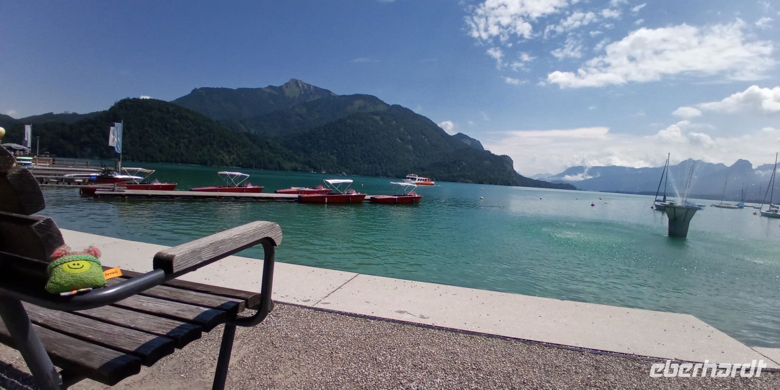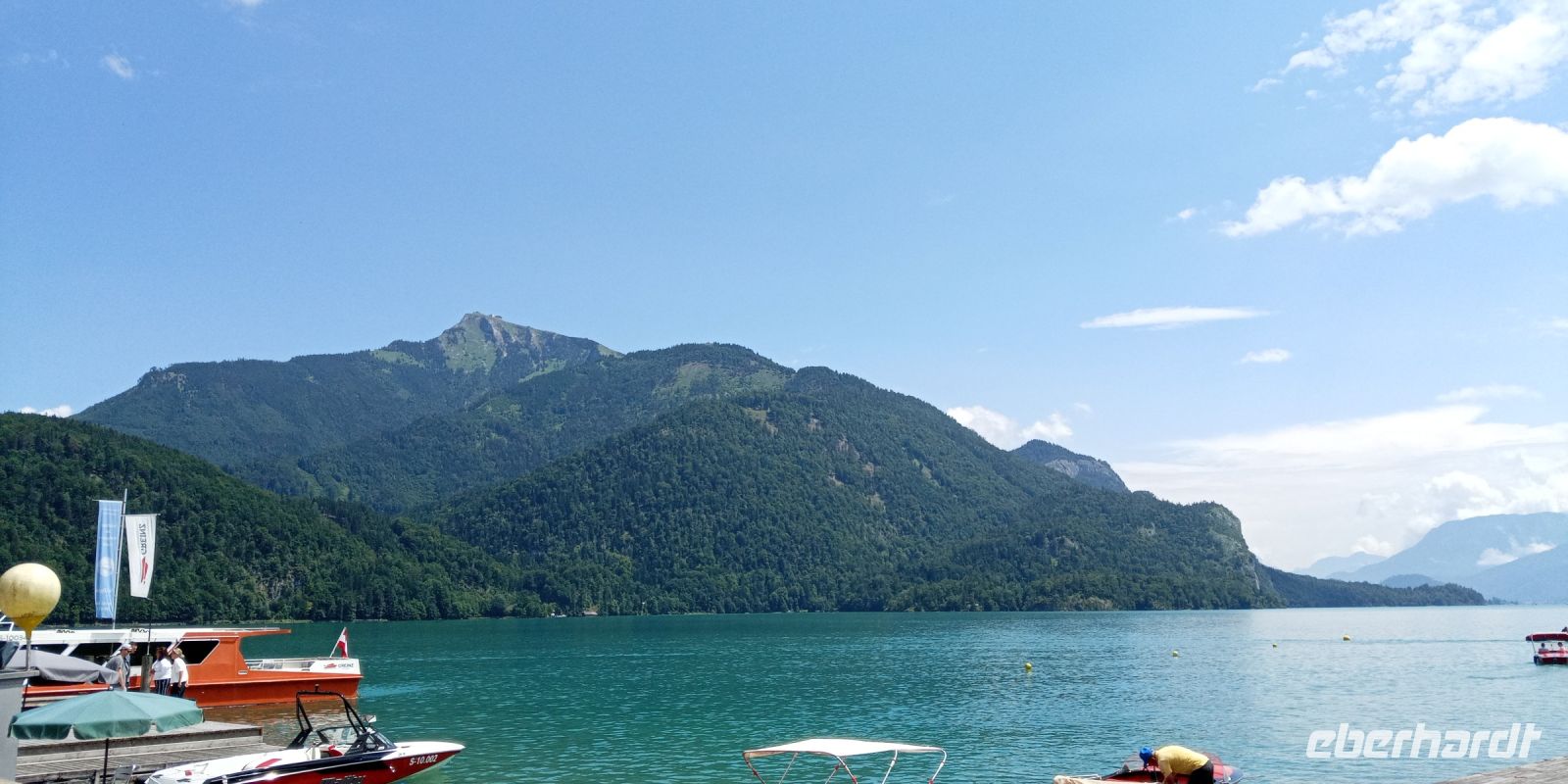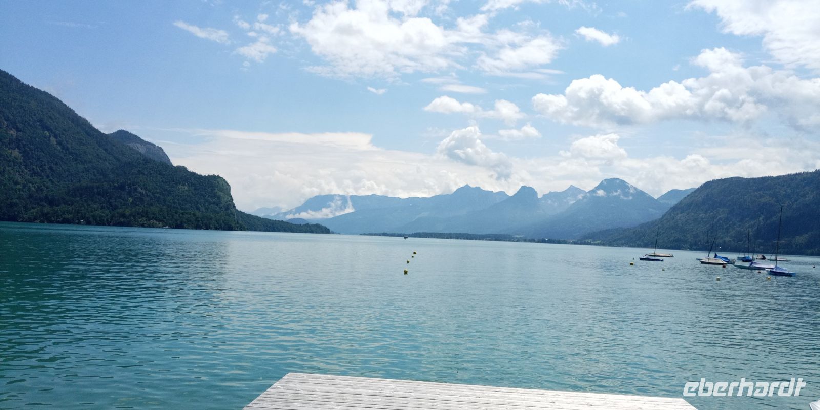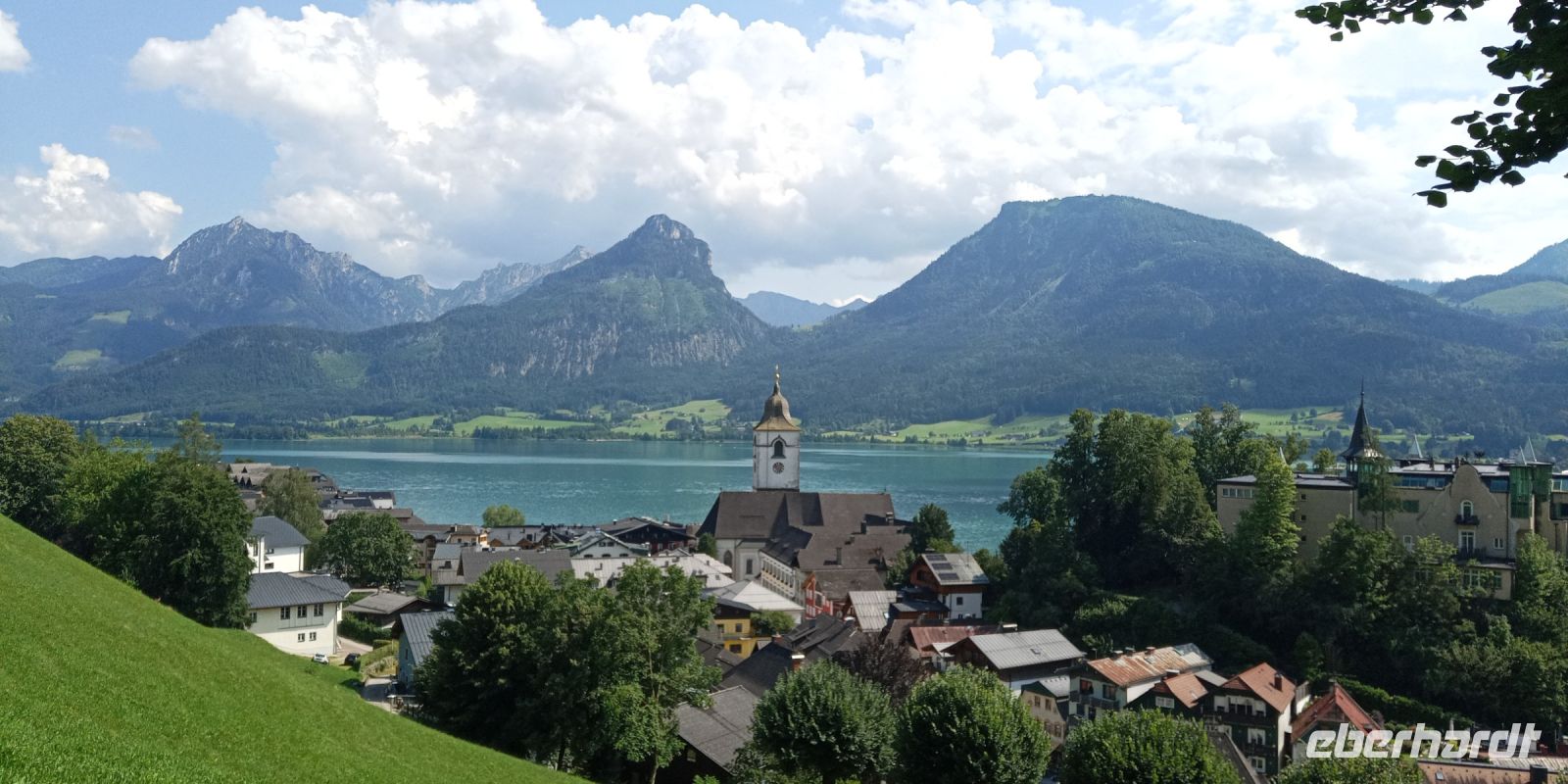 Nachdem es in der Nacht ordentliche Gewitterschauer gab, startete auch der Morgen noch mit Regen. Pünktlich um 9 Uhr erwartete uns wieder unsere Bergführerin Barbara am Hotel. Diesmal fuhren wir zusammen nach Abstdorf an den Attersee. Schon bei der Anfahrt zum Attersee, verzogen sich die letzten Schauer und wir erreichten Abstdorf wieder bei Sonnenschein und warmen Temperaturen. Spontan verkürzten wir hier in Abstdorf unsere geplante Wanderung und liefen eine gemütliche Tour zum Nachbarort Nußdorf. Auf schönen Bergwiesen und Felder, hatten wir dabei tolle Ausblicke auf den Attersee. Der äußerst klare Attersee liegt vor entzückendem Bergpanorama und ist mit einer Wasserfläche von 46km² der größte See Österreichs, der sich zur Gänze im Land befindet. Der türkisfarbene Attersee ist ein Gletscherrandsee mit einer Tiefe von bis zu 169 Meter und hat Trinkwasserqualität. In Nußdorf kamen wir an einer Tischlerei vorbei, wo Tische aus Zirbenholz hergestellt werden. Da der Tischlermeister uns zufällig gesehen hat, bekamen wir eine spannende kurze Führung durch seine Werkstatt. Anschließend sammelte uns Andreas wieder in Nußdorf ein und wir fuhren weiter an den Wolfgangsee nach St. Gilgen. Hier machte Barbara mit uns einen kleinen Spaziergang durch den Ort. Aus dem Ort stammte Mozarts Mutter, auch seine Schwester „Nannerl“ lebte viele Jahre hier. Wir liefen am ehemaligen Haus der Familie, dem Mozarthaus vorbei. Ebenfalls sehenswert waren die Pfarrkirche von St. Gilgen mit dem kleinen Friedhof und das schmucke Rathaus. Nachdem sich jeder ein leckeres Eis gönnte, fuhren entlang des Wolfgangsee an die Westspitze zum Örtchen Strobl. Hier liefen wir entlang des Bürglsteinweges mit tollen Aussichten auf den Wolfgangsee. Anschließend teilte sich unsere Wandergruppe wieder auf. Barbara absolvierte mit 4 Gästen noch eine etwas längere Tour bis St. Wolfgang. Die anderen Gäste liefen mit mir die gemütliche Variante, immer am See entlang nach St. Wolfgang. Hier hatte meine Wandergruppe dann etwas Freizeit, um sich das idyllische Örtchen anzusehen. Der Komponist Ralph Benatzky setzte dem Ort mit seinem 1930 uraufgeführten Singspiel „Im weißen Rössl am Wolfgangsee“ ein Denkmal. Noch berühmter wurde St. Wolfgang 30 Jahre später im Zuge der Verfilmung mit Peter Alexander in der Hauptrolle. Bis heute gibt es das besagte Hotel. Auch so kann sich St. Wolfgang mit seinen historischen Bauten samt schmucken Boutiquen und einladenden Cafes sehen lassen. Als am Nachmittag auch die andere Wandergruppe wieder in St. Wolfgang eintraf, verabschiedeten wir uns von Barbara für die 2 schönen Tage mit ihr. So ging es mit vielen Eindrücken wieder zurück in unser Hotel, wo wir beim Abendessen den ereignisreichen Tag noch Mal Revue passieren lassen konnten.