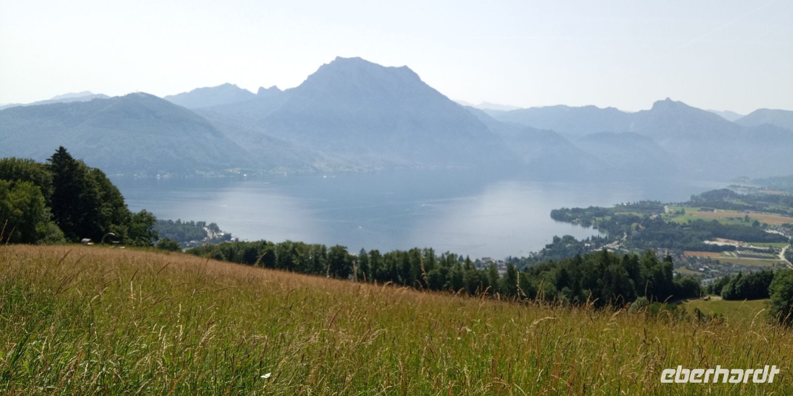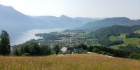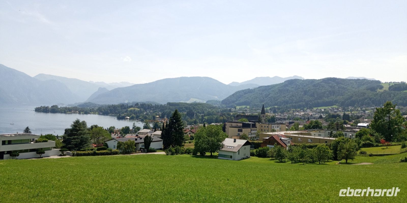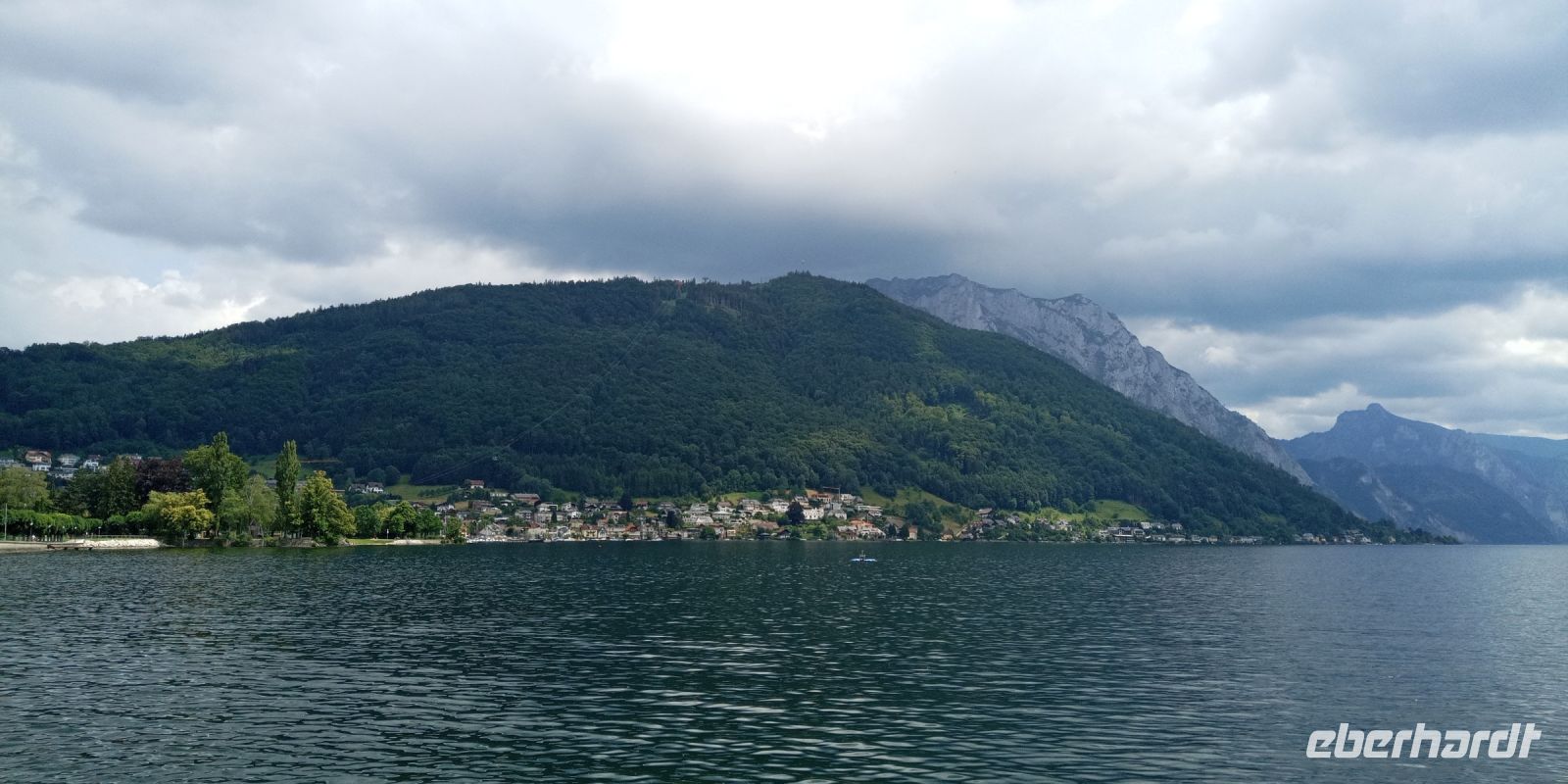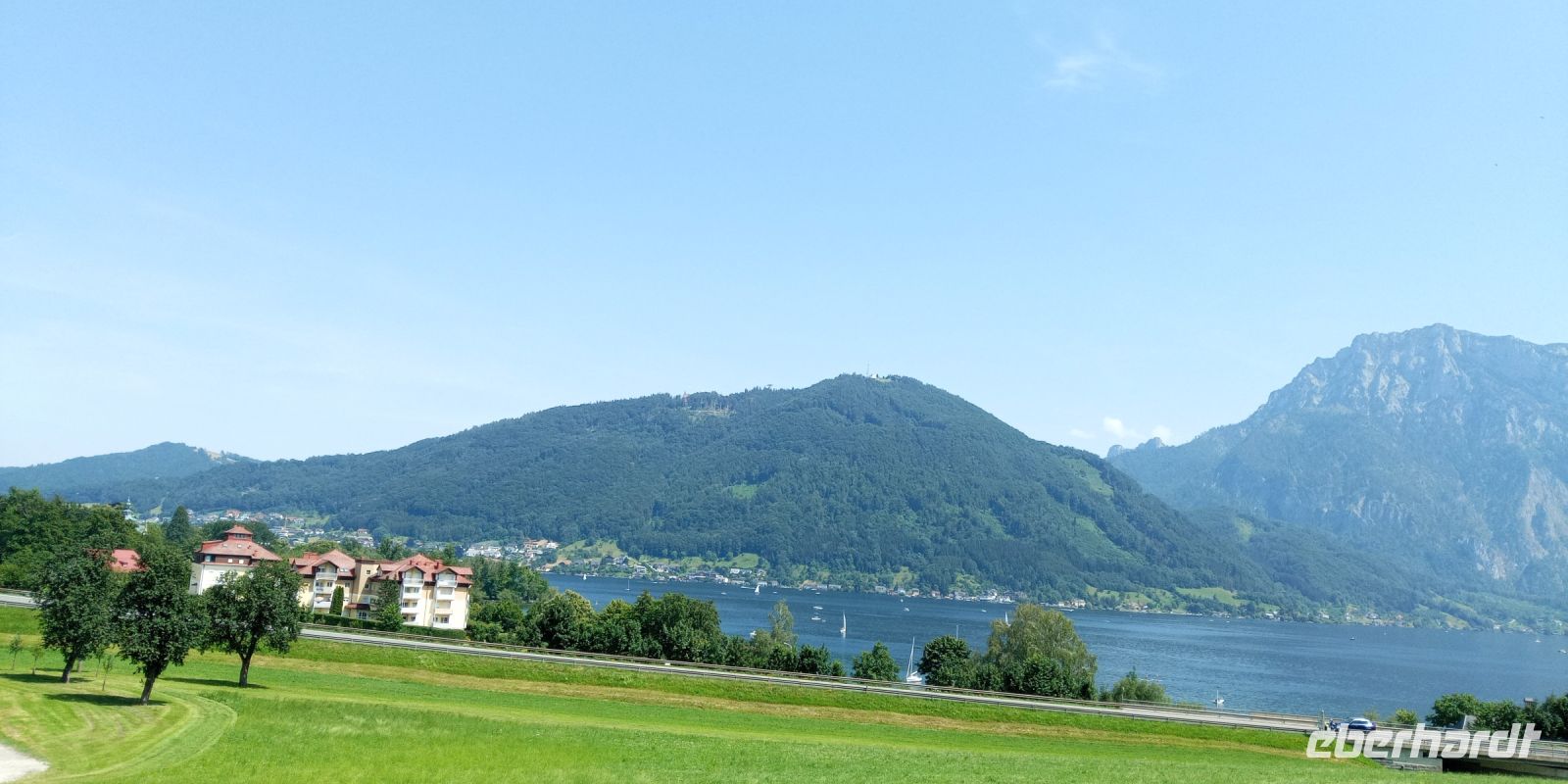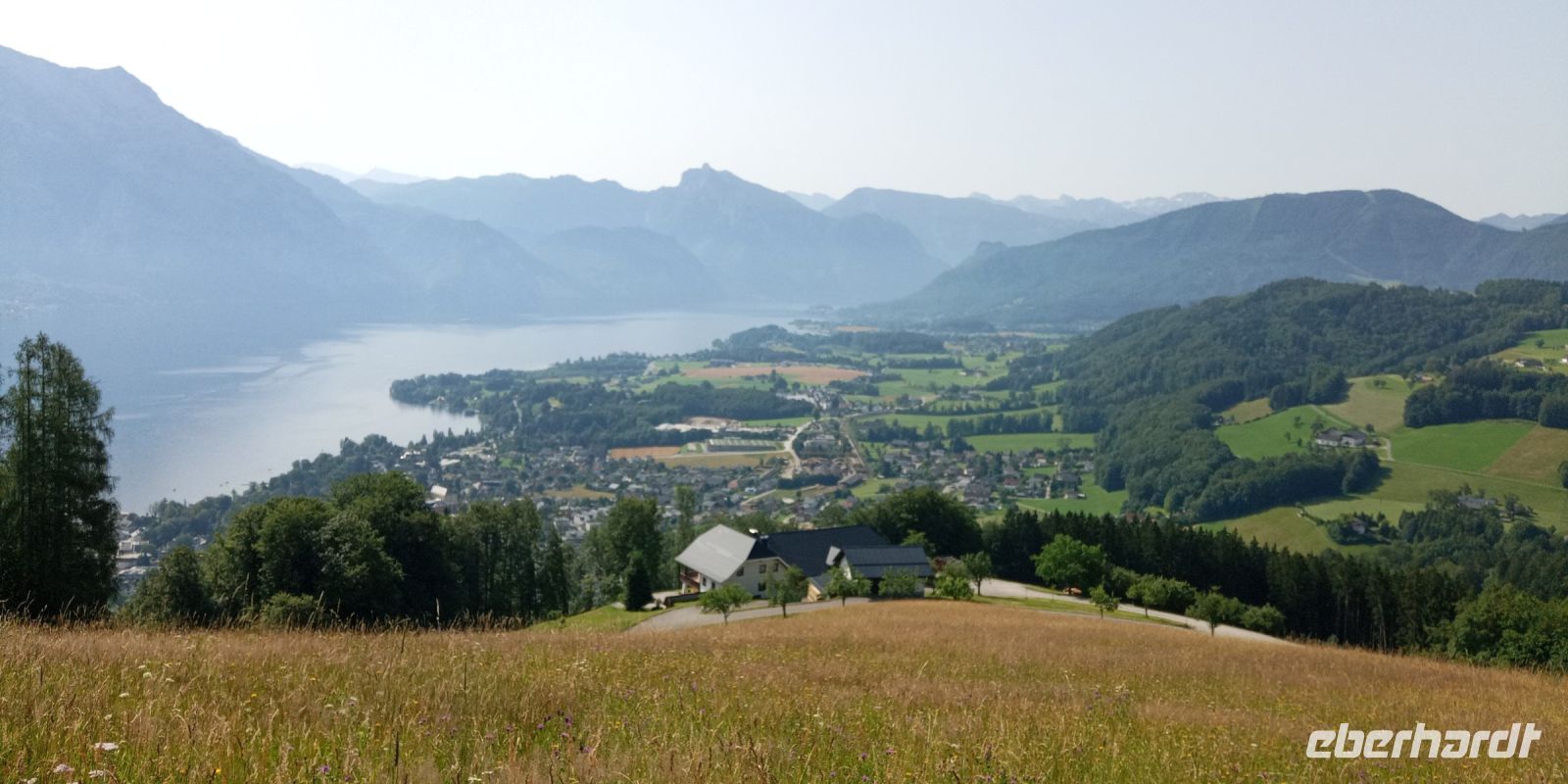Nachdem es in der Nacht ordentliche Gewitterschauer gab, startete auch der Morgen noch mit Regen. Pünktlich um 9 Uhr erwartete uns wieder unsere Bergführerin Barbara am Hotel. Diesmal fuhren wir zusammen nach Abstdorf an den Attersee. Schon bei der Anfahrt zum Attersee, verzogen sich die letzten Schauer und wir erreichten Abstdorf wieder bei Sonnenschein und warmen Temperaturen. Spontan verkürzten wir hier in Abstdorf unsere geplante Wanderung und liefen eine gemütliche Tour zum Nachbarort Nußdorf. Auf schönen Bergwiesen und Felder, hatten wir dabei tolle Ausblicke auf den Attersee. Der äußerst klare Attersee liegt vor entzückendem Bergpanorama und ist mit einer Wasserfläche von 46km² der größte See Österreichs, der sich zur Gänze im Land befindet. Der türkisfarbene Attersee ist ein Gletscherrandsee mit einer Tiefe von bis zu 169 Meter und hat Trinkwasserqualität. In Nußdorf kamen wir an einer Tischlerei vorbei, wo Tische aus Zirbenholz hergestellt werden. Da der Tischlermeister uns zufällig gesehen hat, bekamen wir eine spannende kurze Führung durch seine Werkstatt. Anschließend sammelte uns Andreas wieder in Nußdorf ein und wir fuhren weiter an den Wolfgangsee nach St. Gilgen. Hier machte Barbara mit uns einen kleinen Spaziergang durch den Ort. Aus dem Ort stammte Mozarts Mutter, auch seine Schwester „Nannerl“ lebte viele Jahre hier. Wir liefen am ehemaligen Haus der Familie, dem Mozarthaus vorbei. Ebenfalls sehenswert waren die Pfarrkirche von St. Gilgen mit dem kleinen Friedhof und das schmucke Rathaus. Nachdem sich jeder ein leckeres Eis gönnte, fuhren entlang des Wolfgangsee an die Westspitze zum Örtchen Strobl. Hier liefen wir entlang des Bürglsteinweges mit tollen Aussichten auf den Wolfgangsee. Anschließend teilte sich unsere Wandergruppe wieder auf. Barbara absolvierte mit 4 Gästen noch eine etwas längere Tour bis St. Wolfgang. Die anderen Gäste liefen mit mir die gemütliche Variante, immer am See entlang nach St. Wolfgang. Hier hatte meine Wandergruppe dann etwas Freizeit, um sich das idyllische Örtchen anzusehen. Der Komponist Ralph Benatzky setzte dem Ort mit seinem 1930 uraufgeführten Singspiel „Im weißen Rössl am Wolfgangsee“ ein Denkmal. Noch berühmter wurde St. Wolfgang 30 Jahre später im Zuge der Verfilmung mit Peter Alexander in der Hauptrolle. Bis heute gibt es das besagte Hotel. Auch so kann sich St. Wolfgang mit seinen historischen Bauten samt schmucken Boutiquen und einladenden Cafes sehen lassen. Als am Nachmittag auch die andere Wandergruppe wieder in St. Wolfgang eintraf, verabschiedeten wir uns von Barbara für die 2 schönen Tage mit ihr. So ging es mit vielen Eindrücken wieder zurück in unser Hotel, wo wir beim Abendessen den ereignisreichen Tag noch Mal Revue passieren lassen konnten.