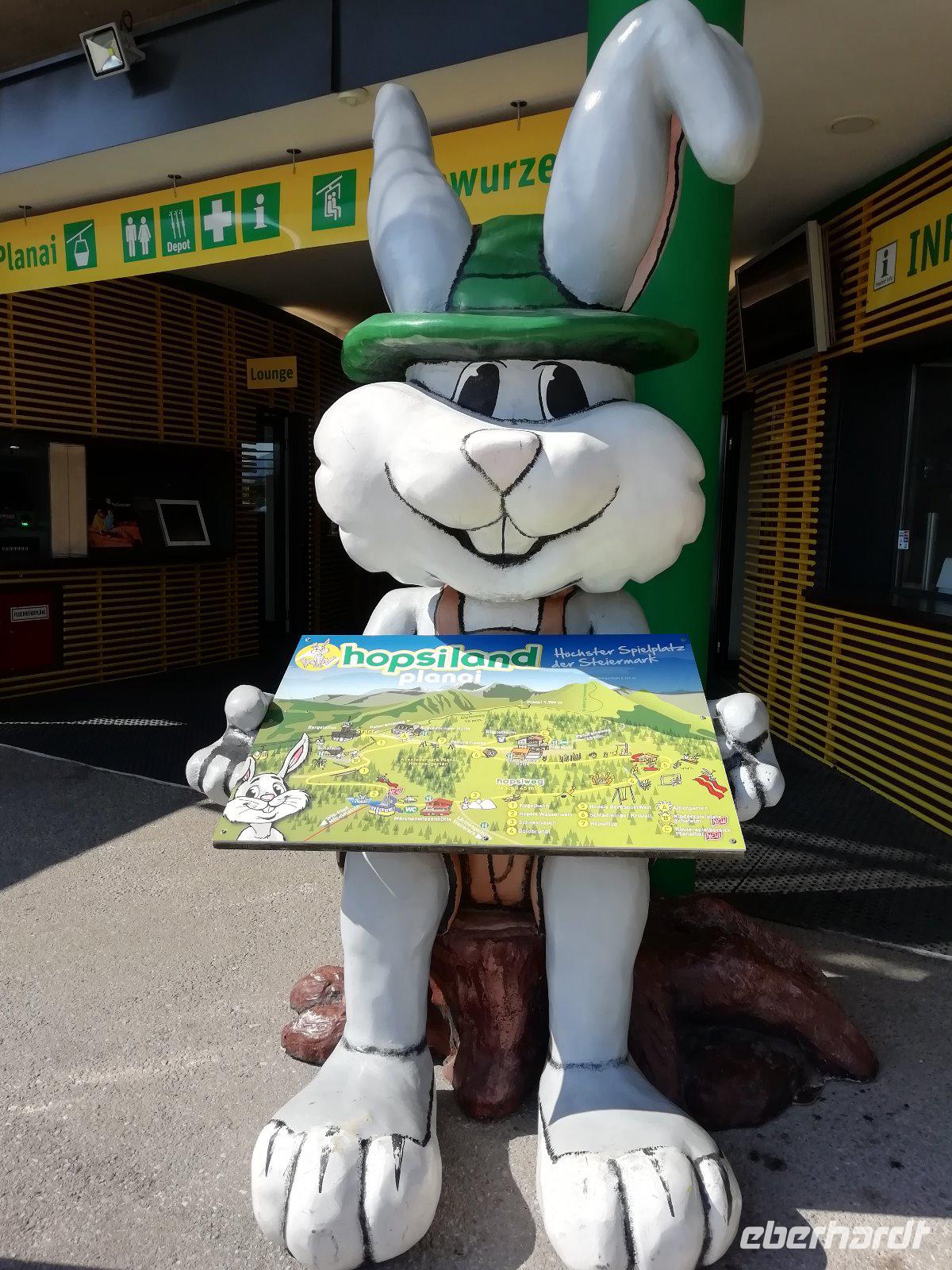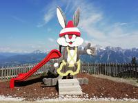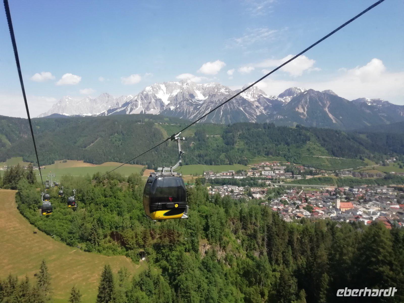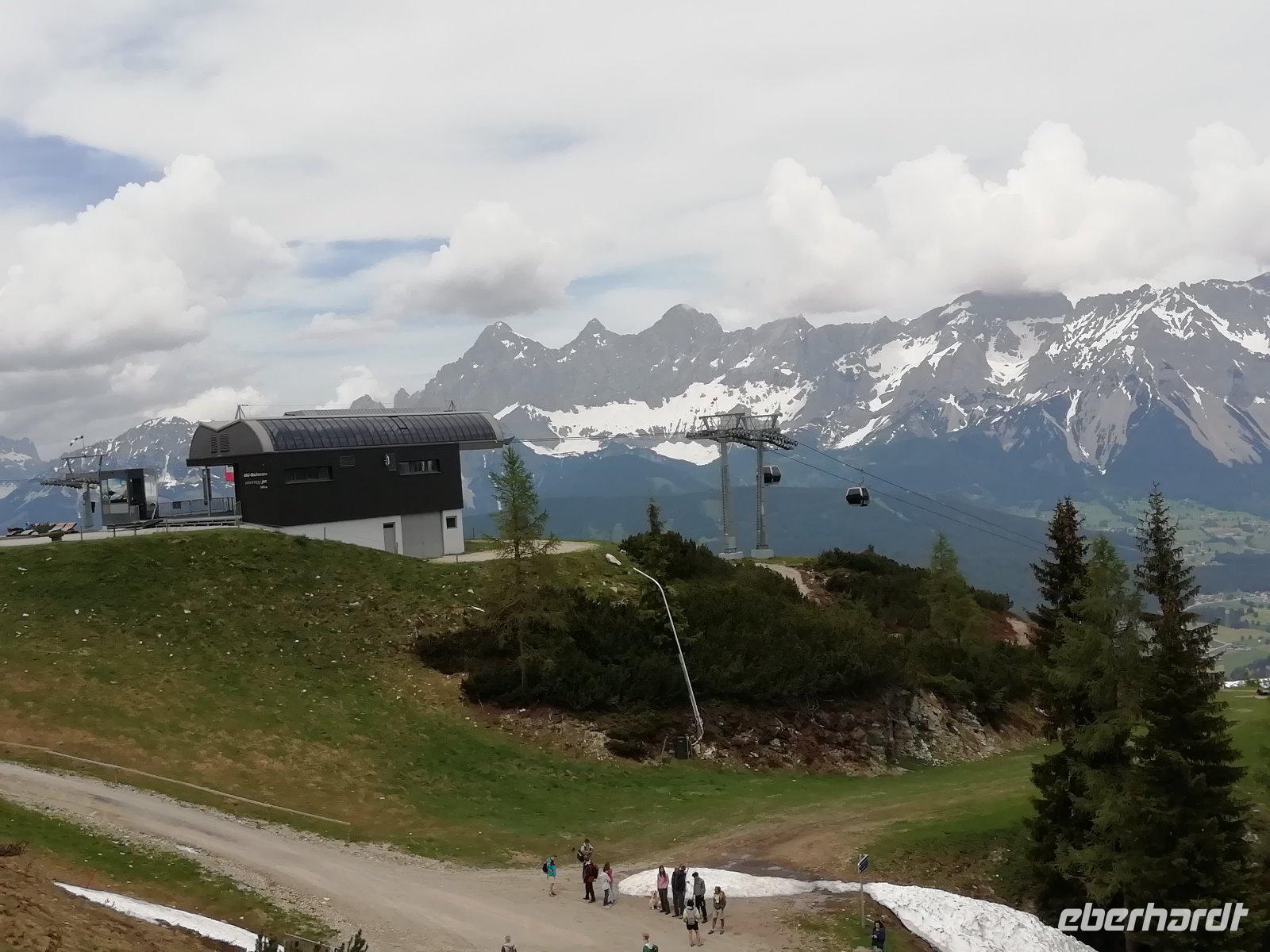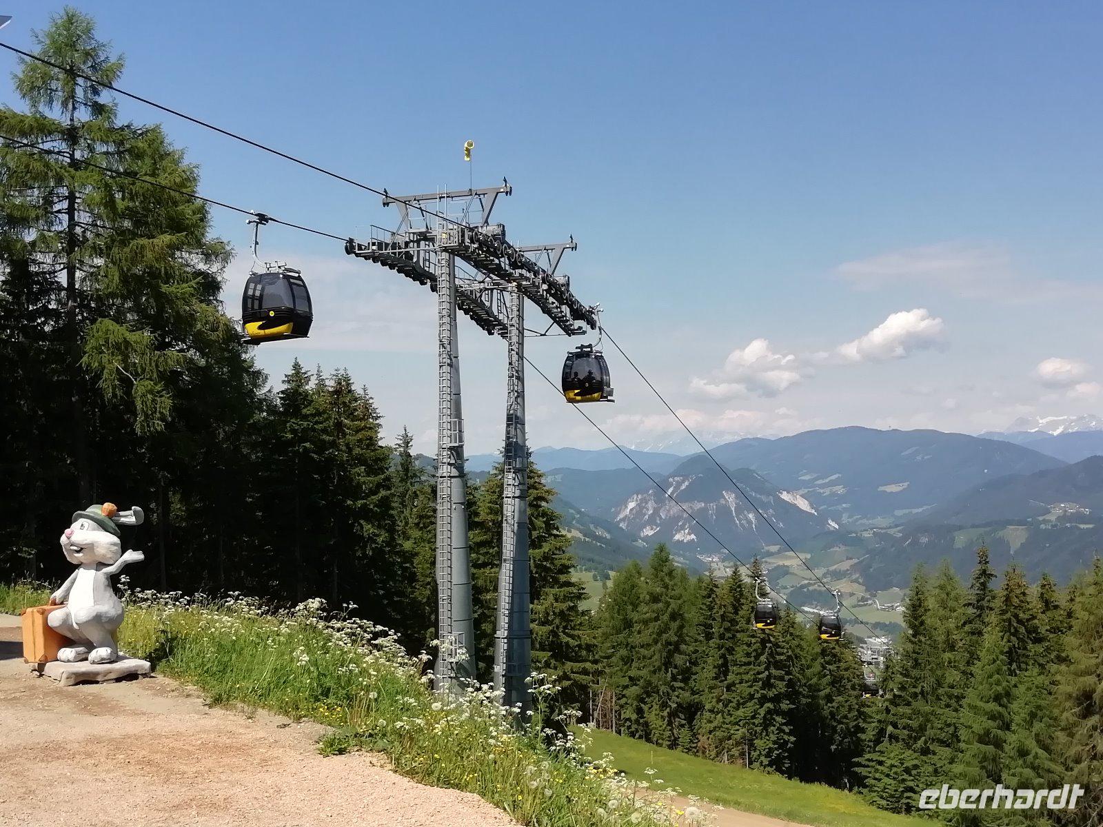 Heute zum Fronleichnam ist in Österreich Feiertag. Wir wollen auf die Planai, den Hausberg von Schladming. Da die Hauptseilbahn dort hinauf in diesem Jahr erneuert wir, fahren wir zu Seilbahn „Planai West". Nach einer tollen Auffahrt mit einem schönen Blick auf Schladming geht es mit einem Shuttle-Bus weiter hinauf zum Planaihof. Wir sehen Häschen in mehreren Varianten, die ins Hopsiland einladen. Einige Gäste laufen zum Gipfel oder umrunden diesen auf dem Panoramaweg. Immer wieder schauen wir hinüber zum Dachsteinmassiv und machen viele Fotos.