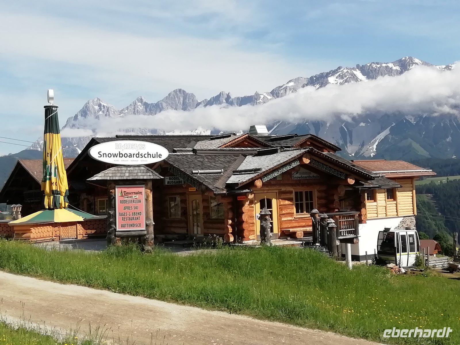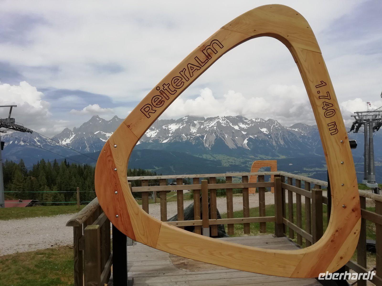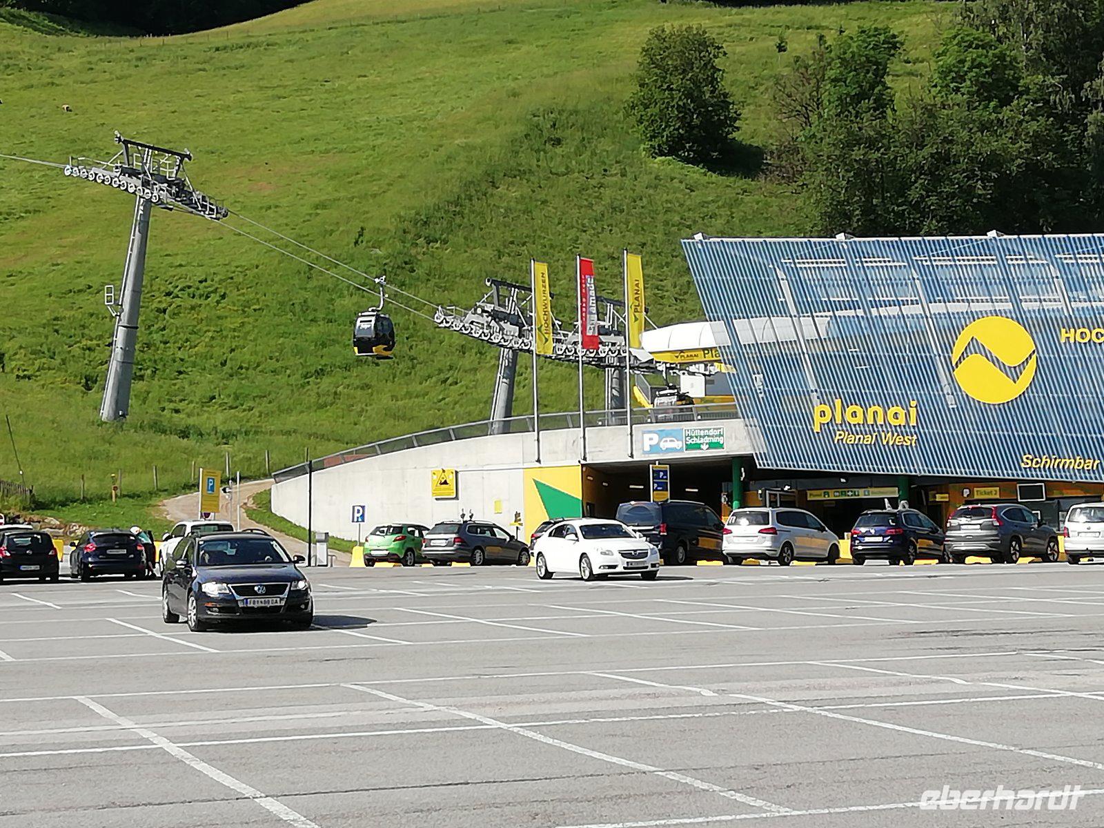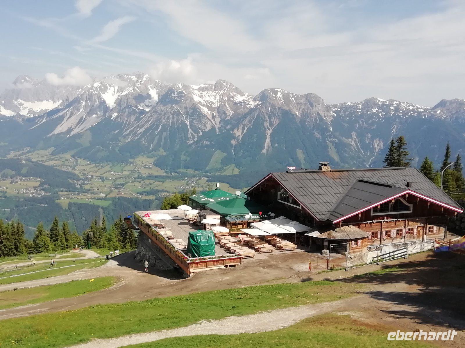 Heute zum Fronleichnam ist in Österreich Feiertag. Wir wollen auf die Planai, den Hausberg von Schladming. Da die Hauptseilbahn dort hinauf in diesem Jahr erneuert wir, fahren wir zu Seilbahn „Planai West". Nach einer tollen Auffahrt mit einem schönen Blick auf Schladming geht es mit einem Shuttle-Bus weiter hinauf zum Planaihof. Wir sehen Häschen in mehreren Varianten, die ins Hopsiland einladen. Einige Gäste laufen zum Gipfel oder umrunden diesen auf dem Panoramaweg. Immer wieder schauen wir hinüber zum Dachsteinmassiv und machen viele Fotos.