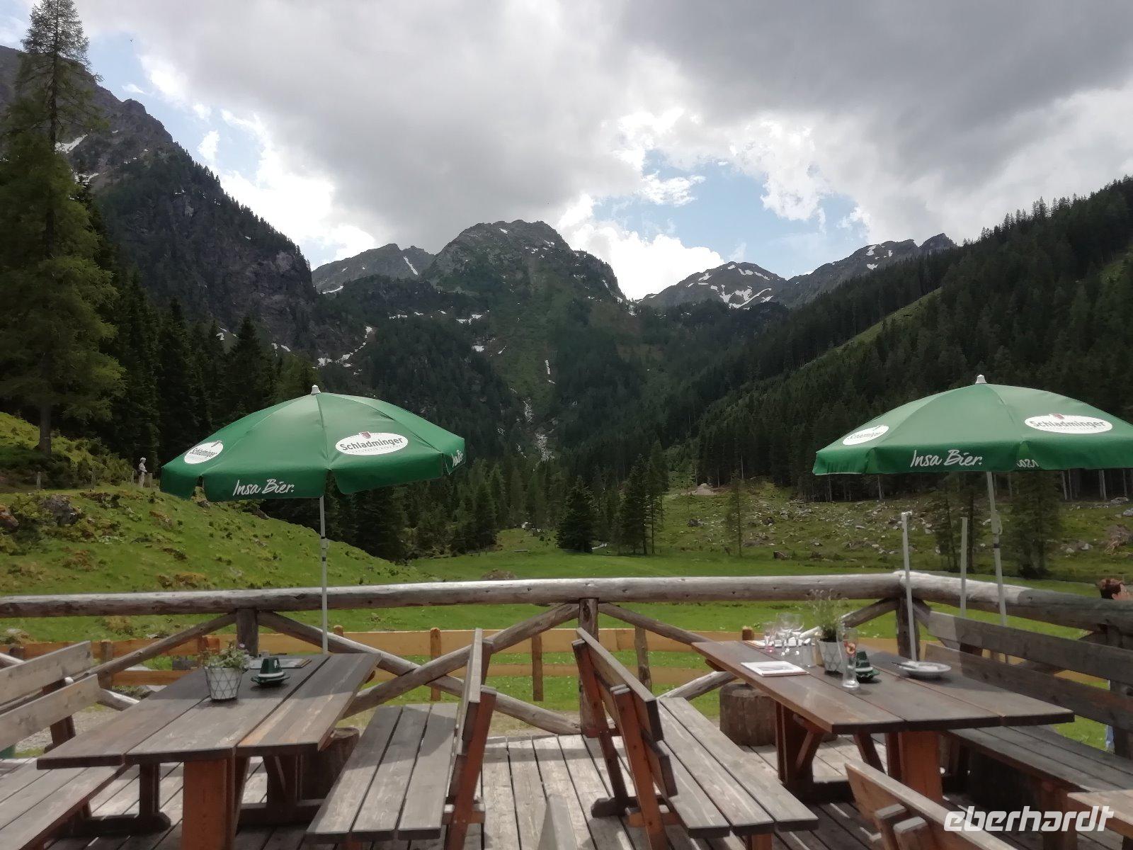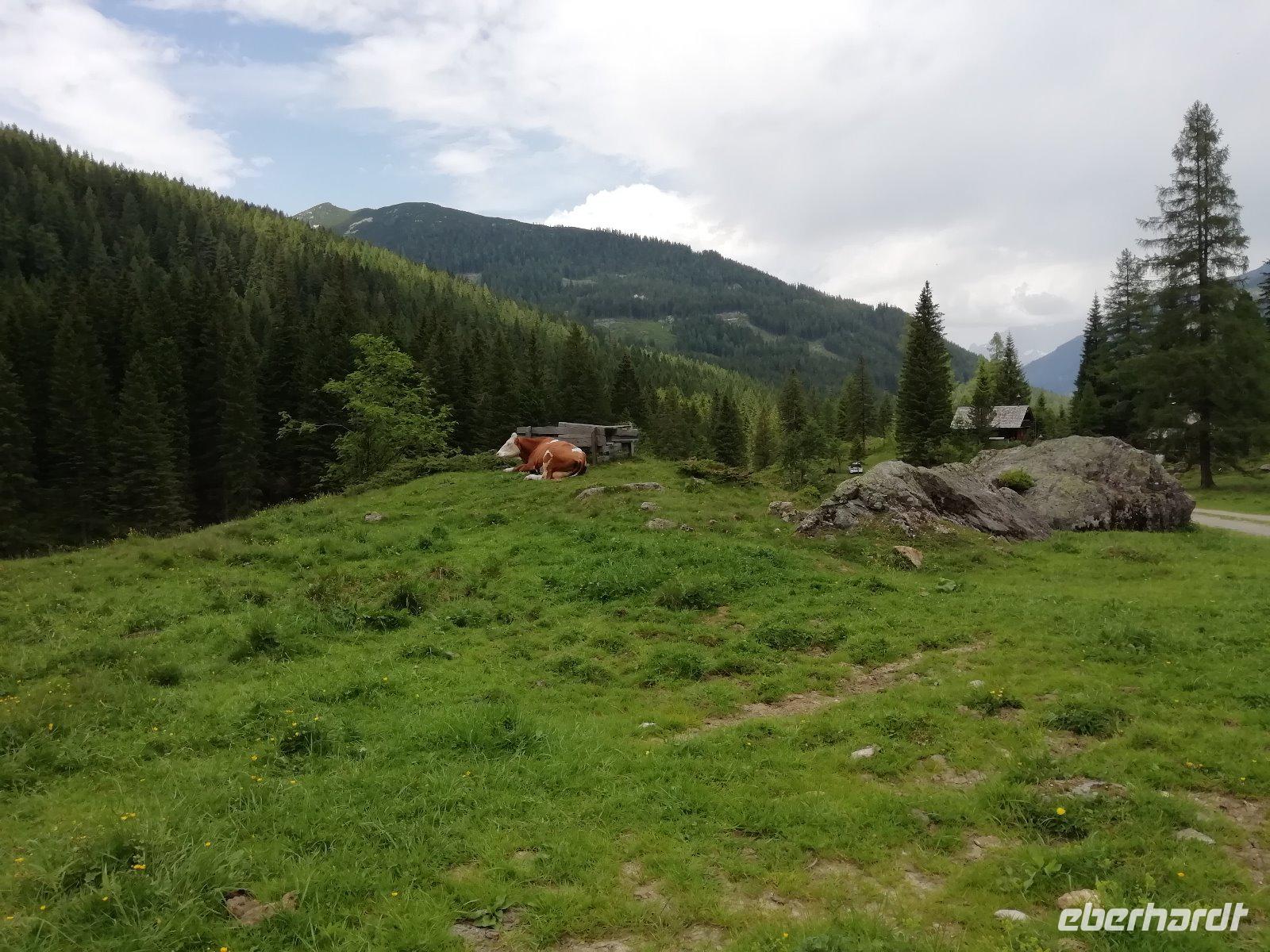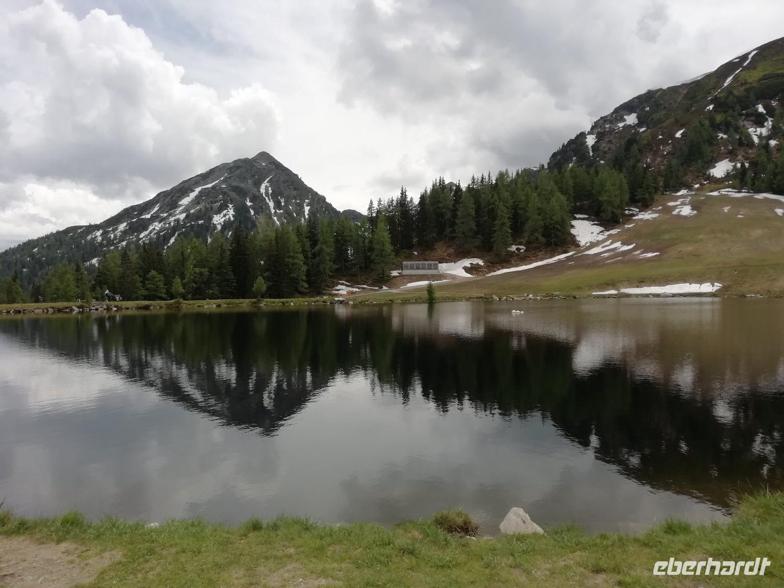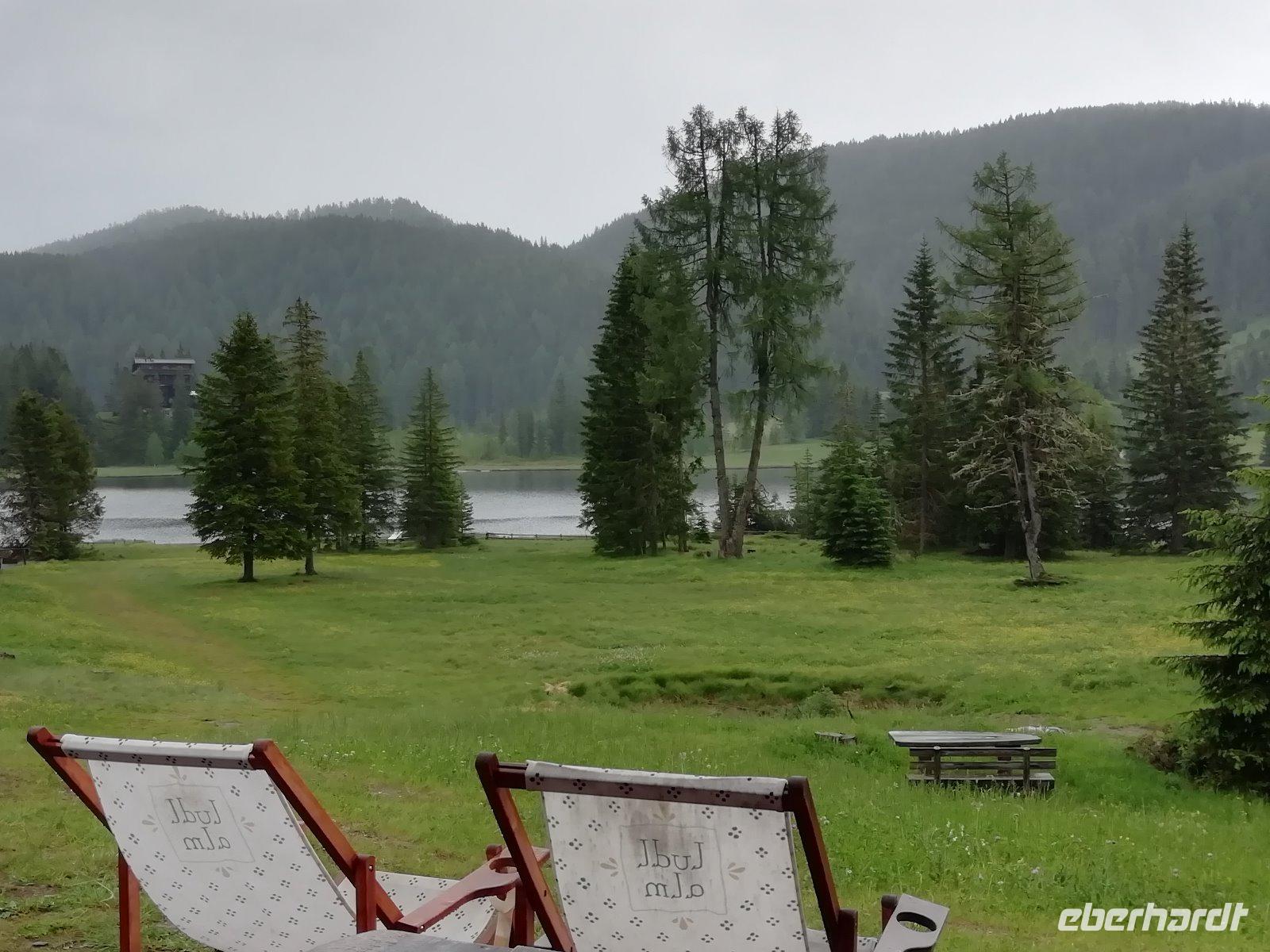 Unser nächster Höhepunkt ist die Fahrt durch das Großsölktal und über den Sölkepass. Dieser verbindet in den Niederen Tauern das Ennstal mit dem Murtal. Im August 2017 hatten starke Unwetter hier extreme Schäden verursacht. So waren auf über sieben Kilometern weite Teile der Fahrbahn und mehrere Brücken von den Fluten mitgerissen worden. Erst seit dieser Jahr ist der Pass wieder freigegeben. Wir genießen die Fahrt mit immer wieder schönen Ausblicken. Auf der Passhöhe in 1790 m machen wir einen Fotostopp. Dann geht es hinunter ins Murtal nach Tamsweg. Gerade als ich erzähle, dass man hier früher „Wetterschießen" veranstaltet hat, um die bösen Wetterhexen auf den Wolken zu vertreiben, fängt es an zu regnen. Ob die Hexen mich gehört haben? Wir fahren trotzdem weiter zum Prebersee. Da die Wetterhexen immer noch grollen, kehren wir in die Ludlalm ein. Dann haben die Hexen doch Erbarmen mit uns und wir können kurz zum See laufen.