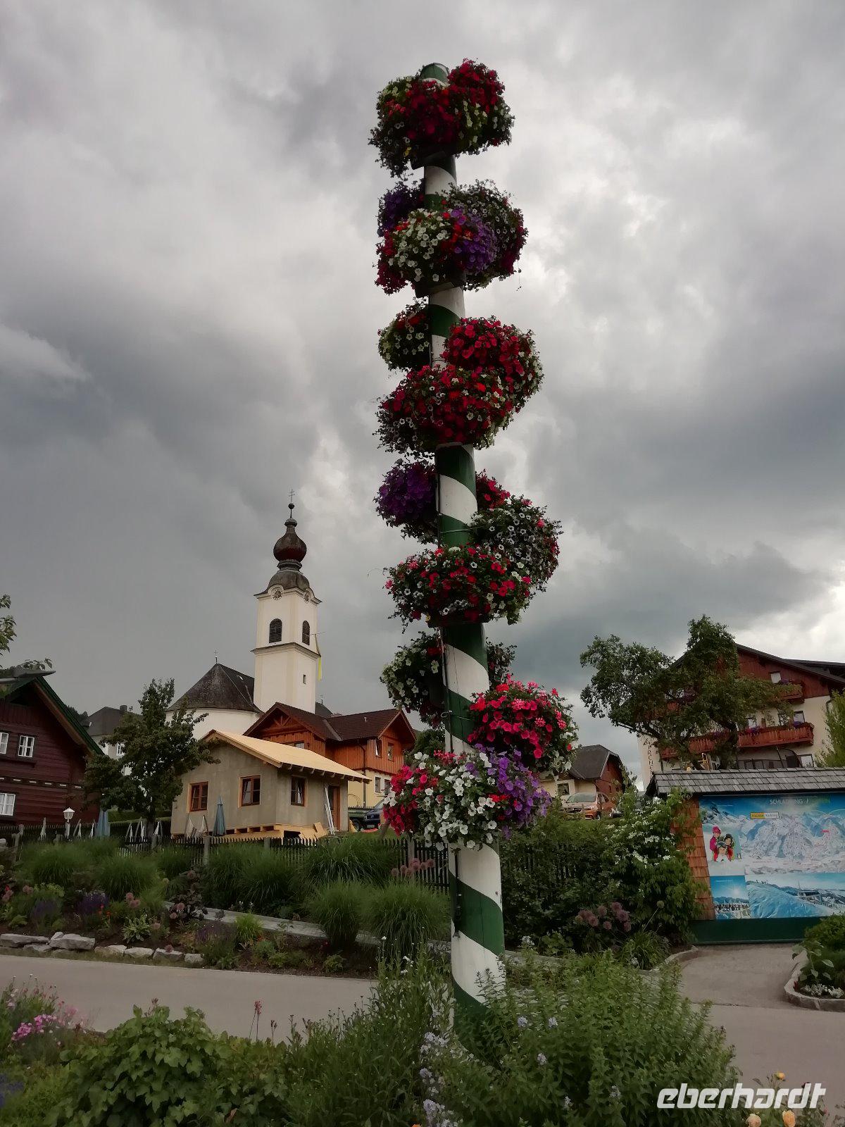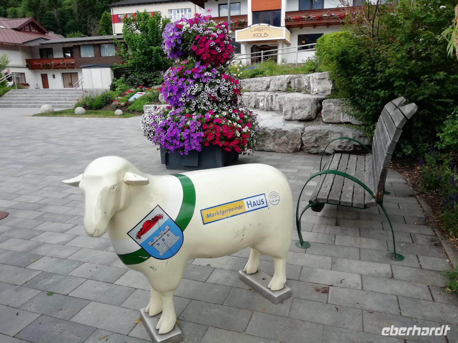 In Haus erwartet uns schon Peter. Er möchte mit uns einen Rundgang durch seinen Heimatort machen. Dabei erfahren wir u.a. woher der Name „Haus" kommt. Besonders beeindruckt sind wir vom Blumenschmuck im Ort. Blumenbaum, Blumenampeln und Blumenpyramiden sind immer wieder Fotomotive für uns. Auch die Balkons und Fenster der Häuser präsentieren Blumen in allen Farben. Peter erzählt uns stolz, dass Haus bereits zum sechsten Mal in Folge den Titel „Schönster Blumenort in der Steiermark" erhielt.