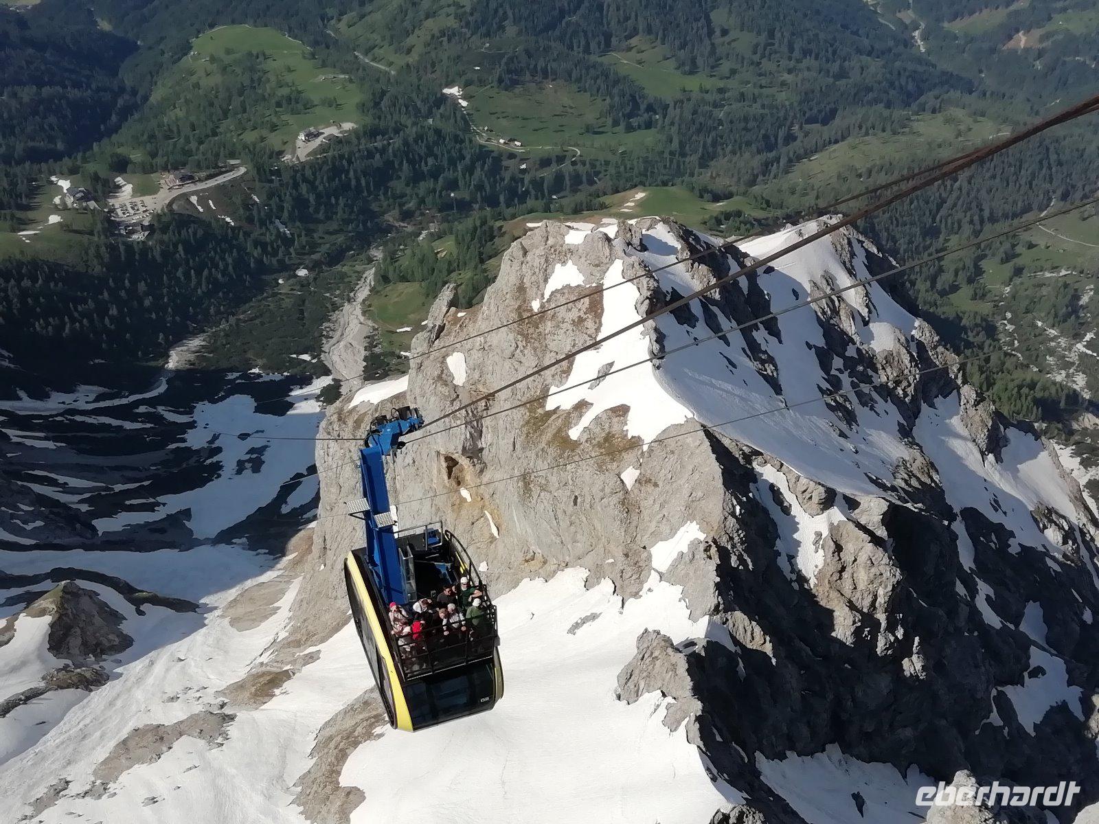 Den Nachmittag nutzen wir für die Auffahrt auf den Hauser Kaibling. Er ist der höchste Berg der Schladminger Skischaukel. Wir gelangen mit der Schladminger Tauernseilbahn, deren Talstation sich gleich neben dem Hotel befindet, hinauf. Es ist eine der ältesten Seilbahnen in der Steiermark. Oben genießen wir noch einmal den Panoramablick in die Bergwelt der Dachstein-Tauern-Region. Einige Gäste absolvieren sogar den teilweise steilen Anstieg bis zum Gipfel.