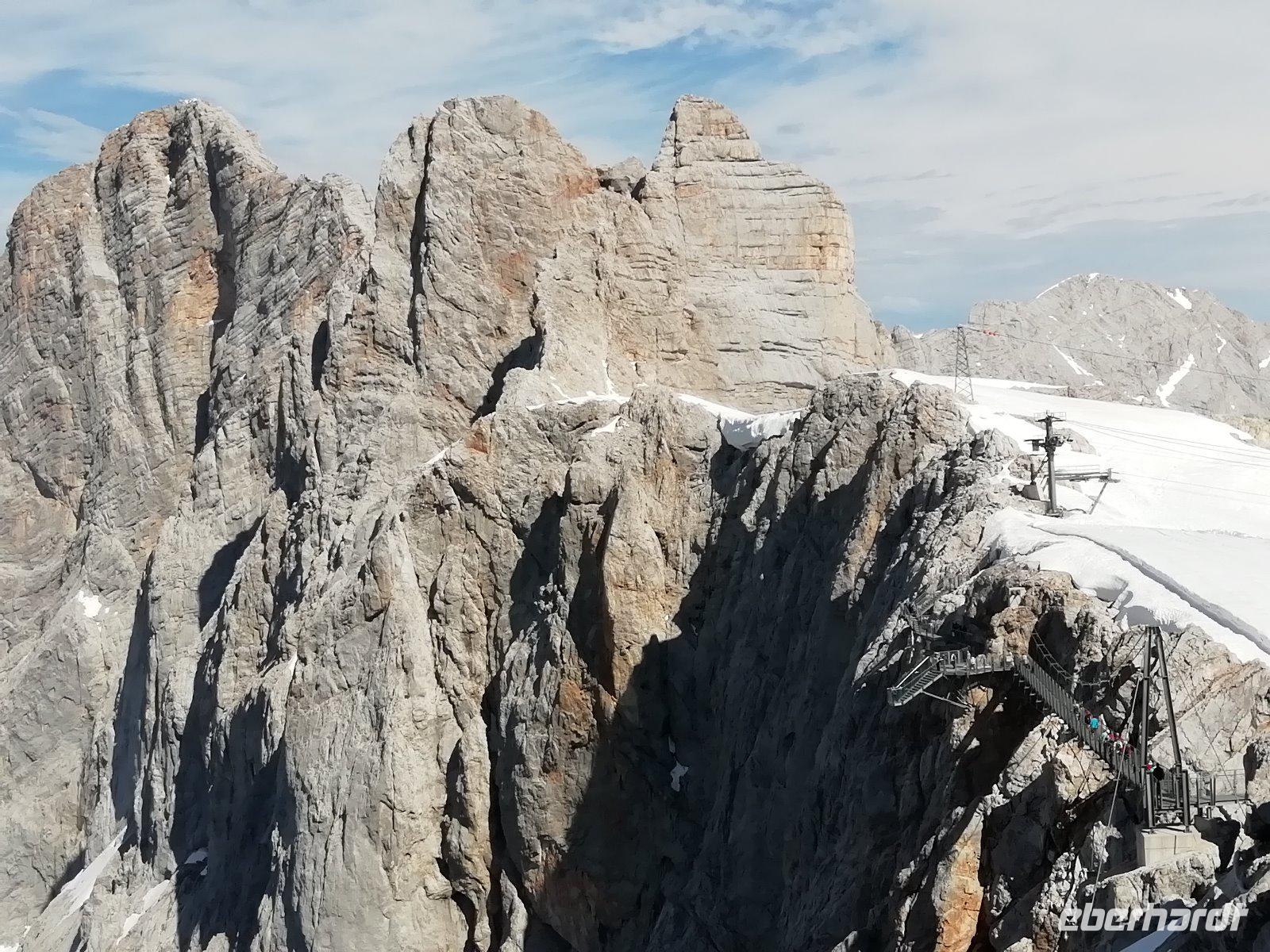 Schon 8 Uhr machen wir uns heute auf den Weg. Bei strahlendem Sonnenschein freuen wir uns auf einen Ausflug auf den Dachstein. Durch Ramsau und über die Dachsteinstraße gelangen wir ins Ramsauer Almengebiet. Hier befindet sich die Talstation der Dachstein-Südwandbahn. Mit der rundum verglasten Gondel fahren wir auf eine Höhe von 2700 m. Oben angekommen, begeben wir uns zum Dachstein-Skywalk. Er ragt über die 250 m senkrecht abfallende Felswand des Hunerkogels hinaus. Gleich nebenan beginnt der Rundweg um die Dachstein-Gletscherbahn. Die meisten Gäste wagen sich auch auf Österreichs höchstgelegene Hängebrücke und steigen die „Treppe ins Nichts" hinunter. Es bleibt auch noch Zeit für einen Besuch des Eispalastes. So manches bekannte europäische Bauwerk wurde hier detailgetreu aus Eis geschnitzt. Über das Schneefeld geht es zurück zur Seilbahn. Besonders spektakulär: Einige Gäste nutzen die Möglichkeit, die Fahrt hinunter im Freien auf dem Dachbalkon der Gondel zu machen.