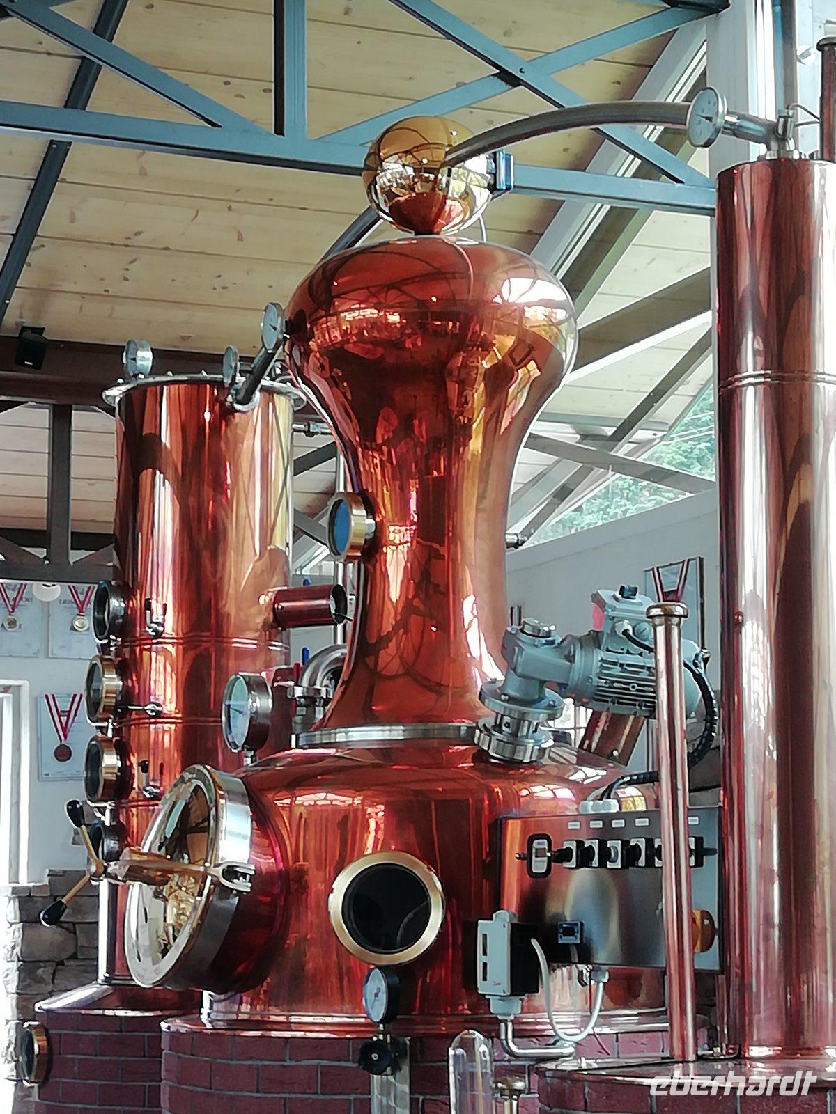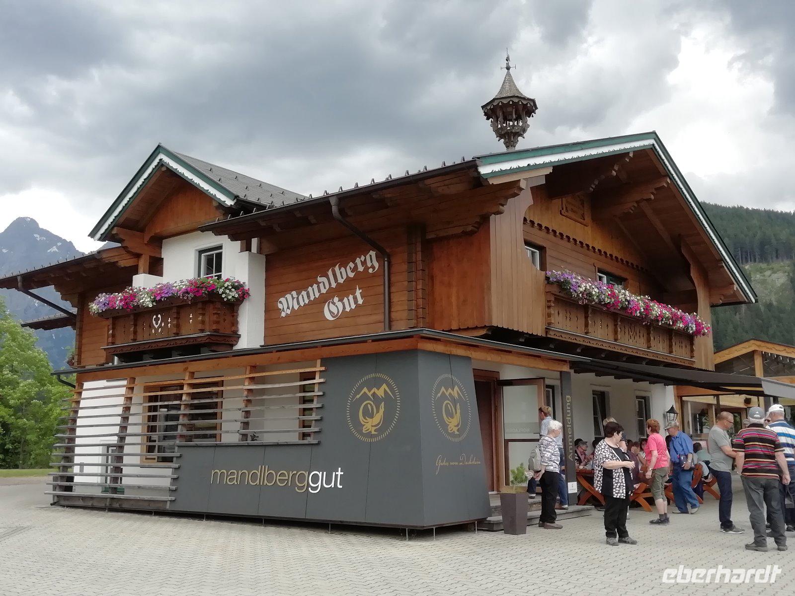 Unser nächstes Ziel ist die Manufaktur „Mandlberggut". Als erstes besuchen wir die Latschenkiefer-Brennerei. Hier wird die Latschenkiefer zur Ölgewinnung genutzt. Wir erfahren u.a., dass 400 kg Nadeln und Zweigspitzen nötig sind, um ca. einen Liter ätherisches Latschenkiefernöl zu gewinnen. Weiter geht es in die Dachstein-Destillerie, wo wir erklärt bekommen, wie aus frischem Obst edle Brände entstehen. Und natürlich wird auch verkostet. Zur Auswahl stehen Bergwiesenkräutermix, Ahornkirsche oder Zirbengold sowie Marille mit Weißdorn oder Rum-Karamell. Im kleinen Shop wird dann so Mitbringsel gekauft.