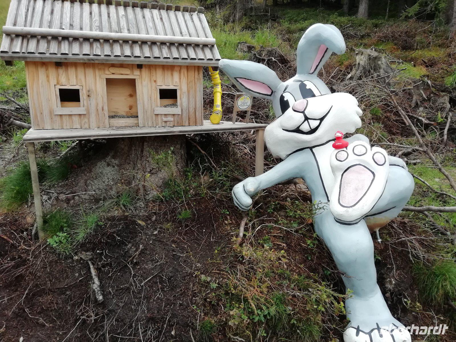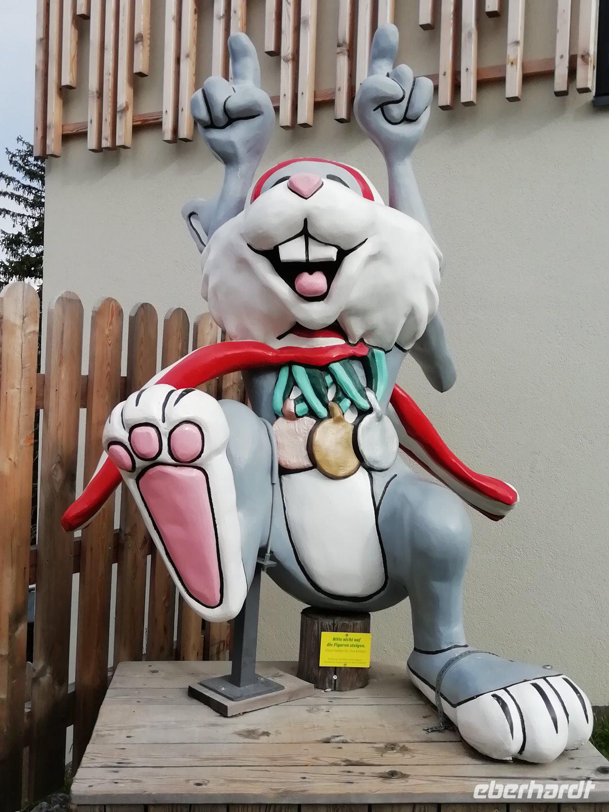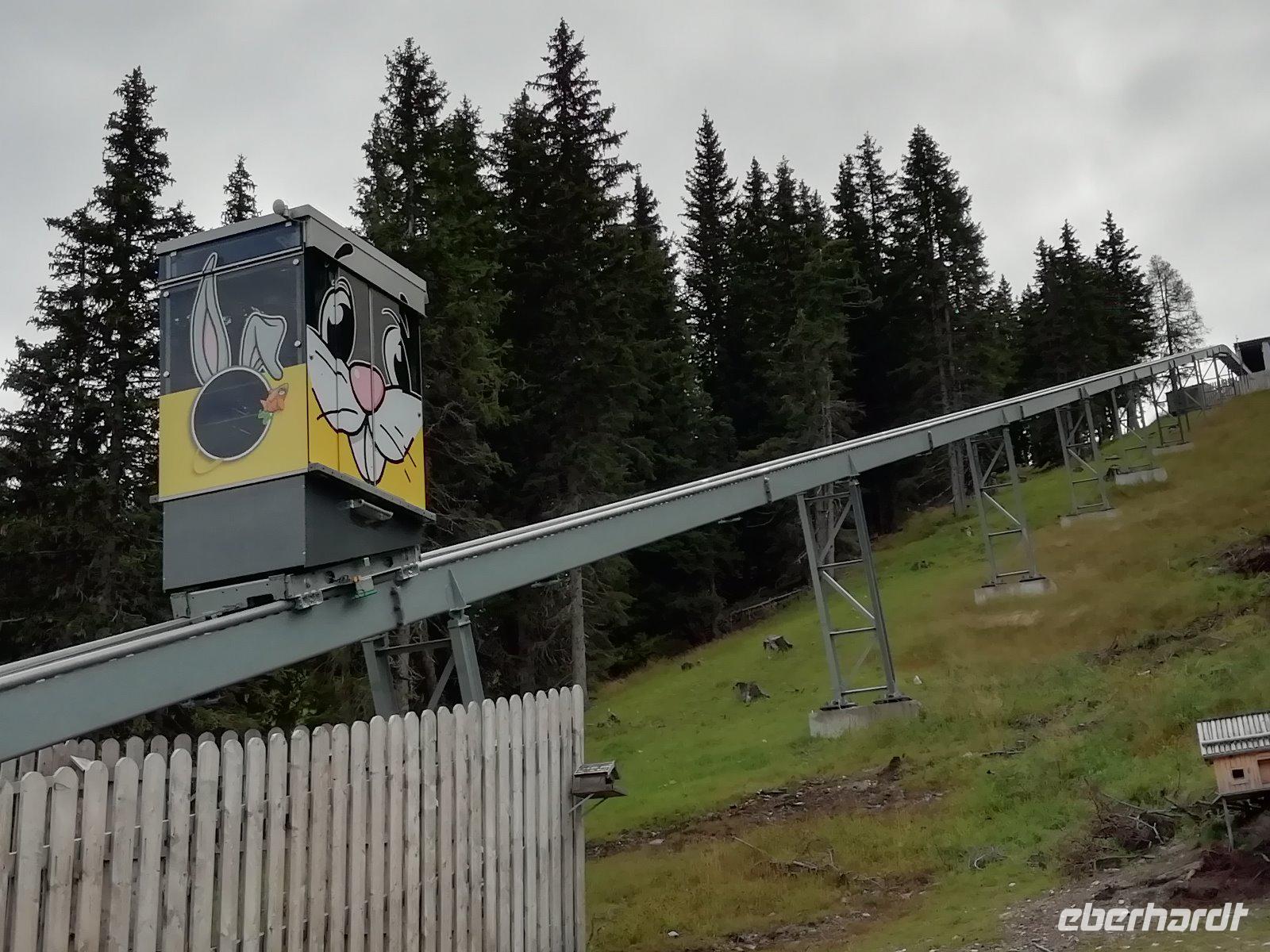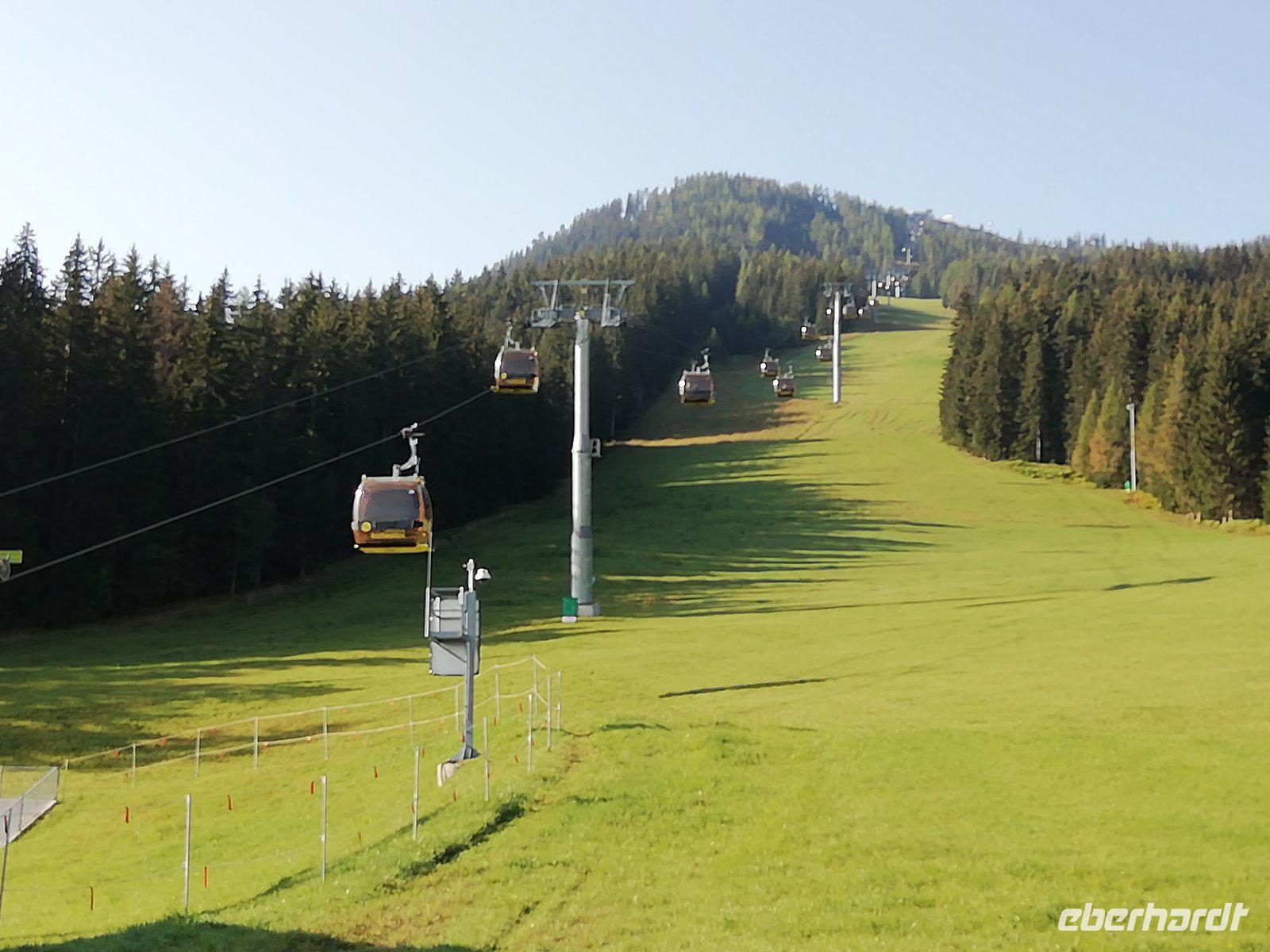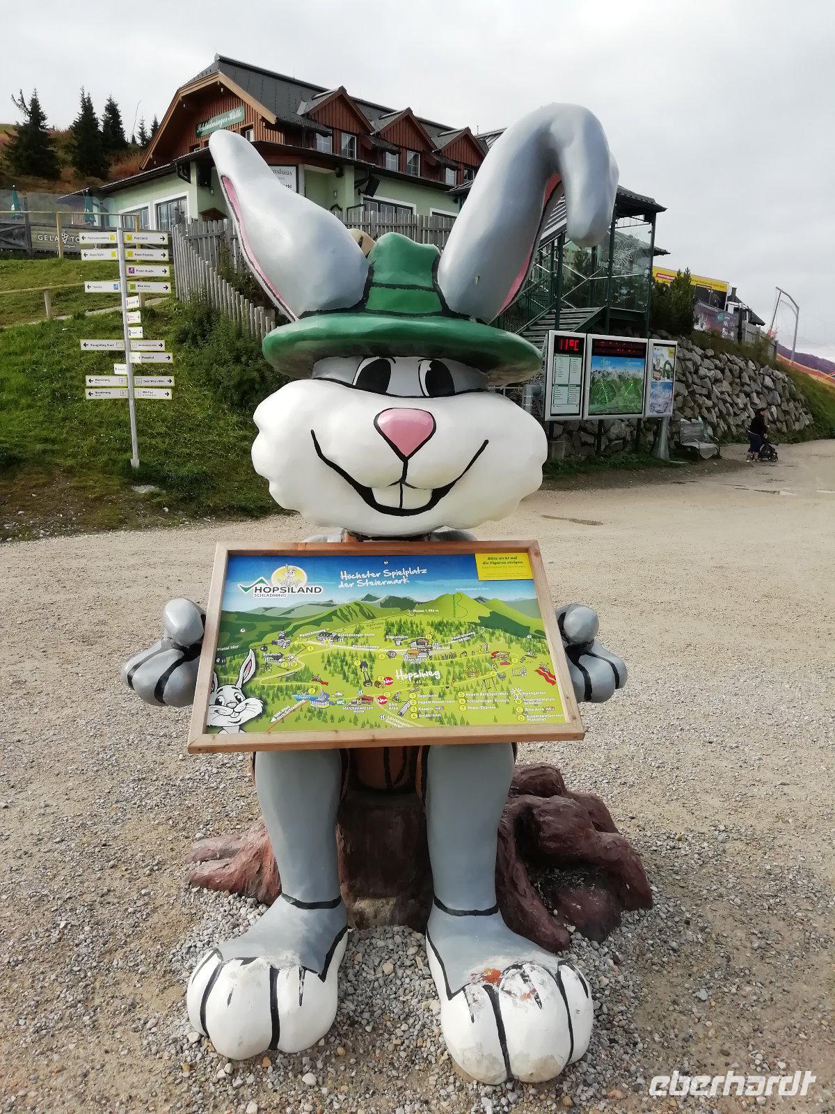 Bei unseren Fahrten durchs Ennstal haben wir in den letzten Tagen schon mehrmals den Hausberg von Schladming, die Planai, gesehen. Heute, bei strahlendem Sonnenschein, wollen wir dort hinauf. Das machen wir gemütlich mit der Seilbahn. Von oben haben wir einen tollen Blick. Einige Gäste laufen zum Gipfel, andere umrunden diesen auf dem Panoramaweg. Überall begegnen uns lustige Hasen, denn hier oben befindet sich auch das Hopsi-Land. Es bietet Kindern umfangreiche Spielmöglichkeiten. Auch einige von uns fahren mit dem „Hopsi-Express".
