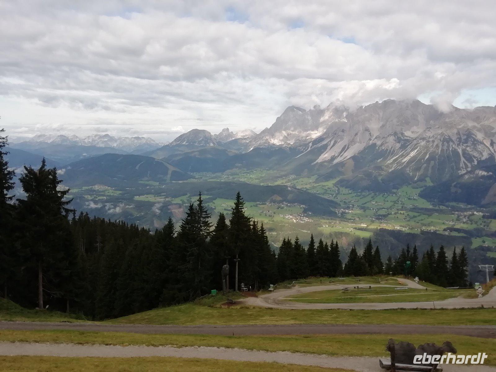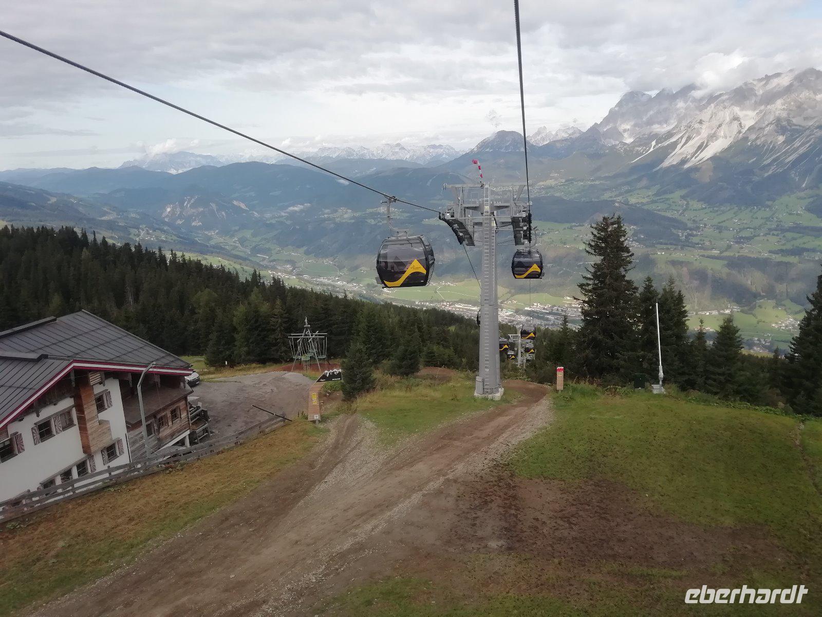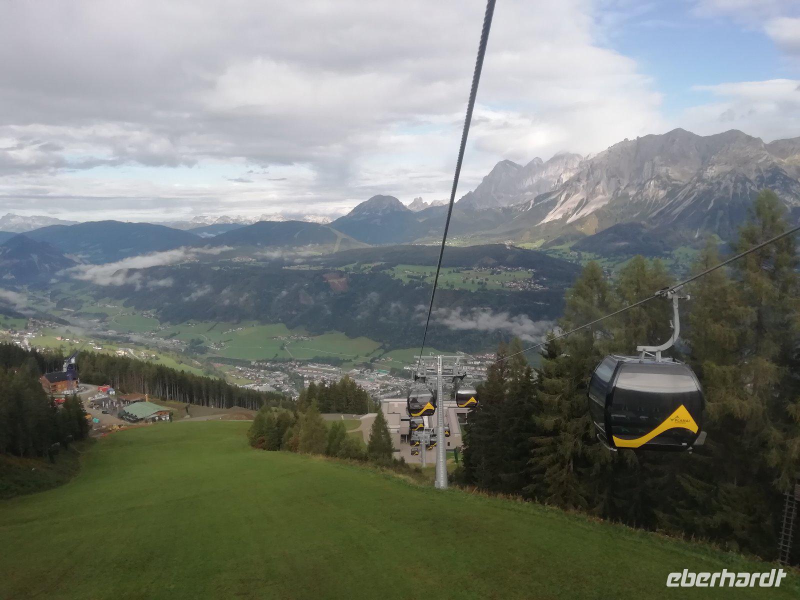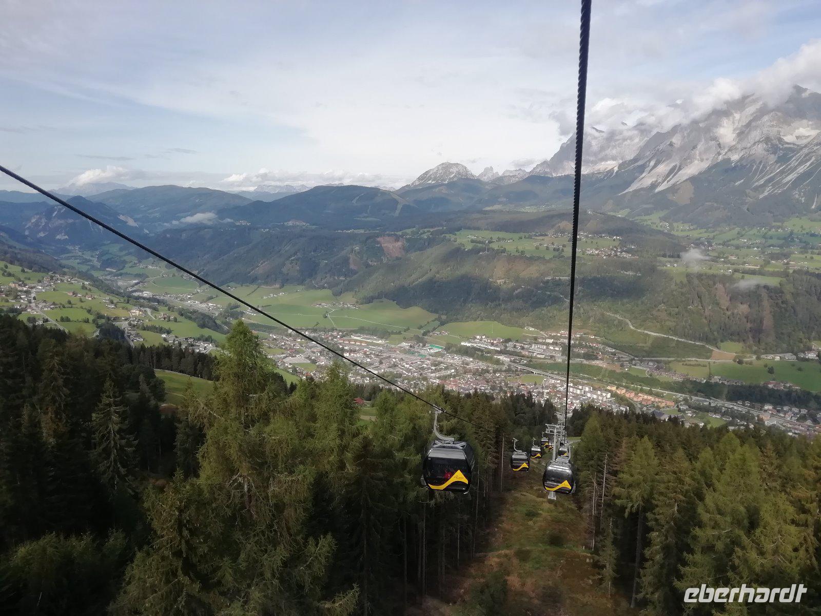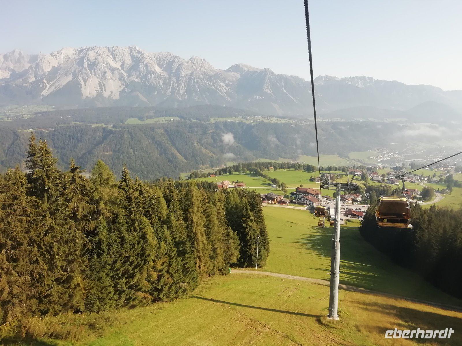 Nach einen guten Frühstück mit Produkten aus der Region wollen wir unseren ersten Berg „erklimmen". Inzwischen hat sich der Nebel verzogen und Jan bringt uns mit dem Bus nach Rohrmoos. Von hier geht es mit der Seilbahn hinauf auf den Hochwurzen. In 1852 m Höhe haben wir einen schönen Blick auf das gegenüberliegende Dachsteinmassiv. Wir spazieren noch bis zum Gipfel des „Kleinen Wurzen". Dann können wir die Go-Card-Piloten bei ihrer rasanten Fahrt beobachten. Auch für uns geht es wieder hinunter, allerdings mit der Seilbahn.