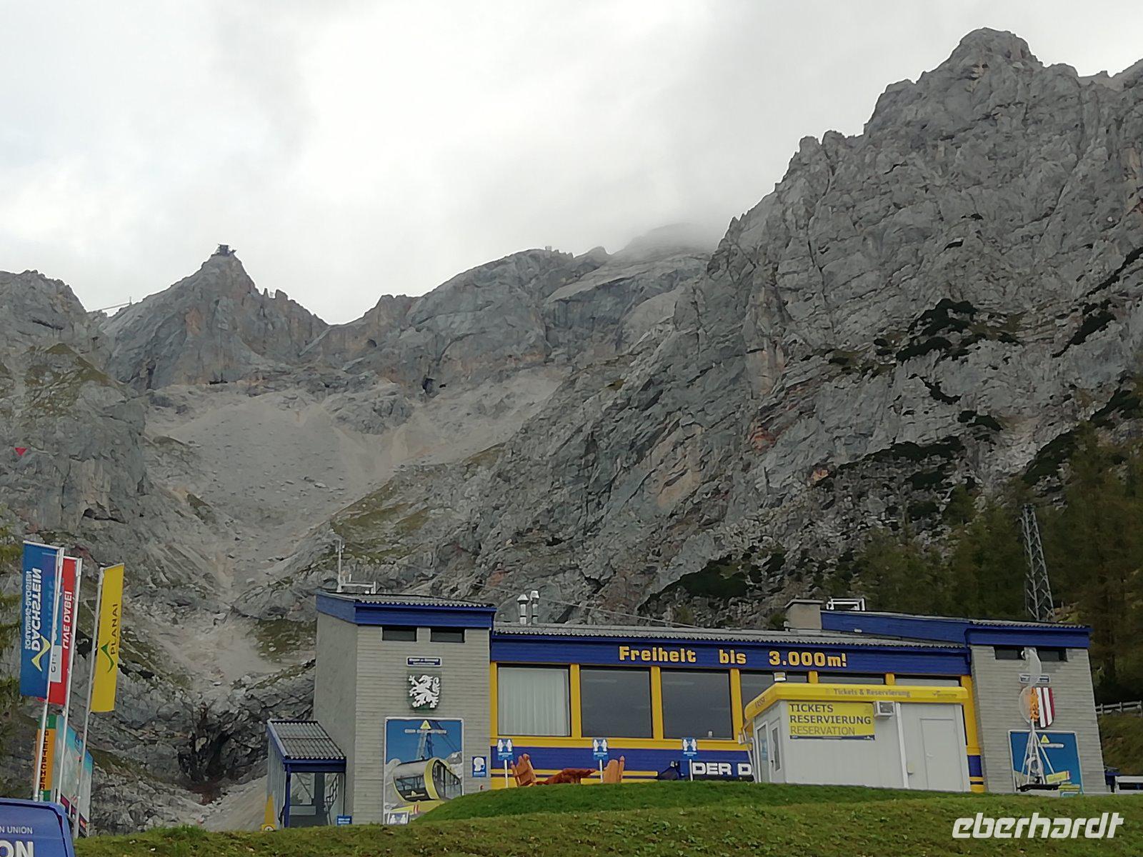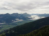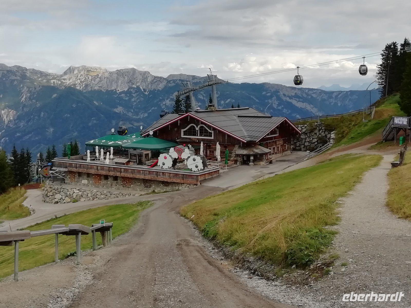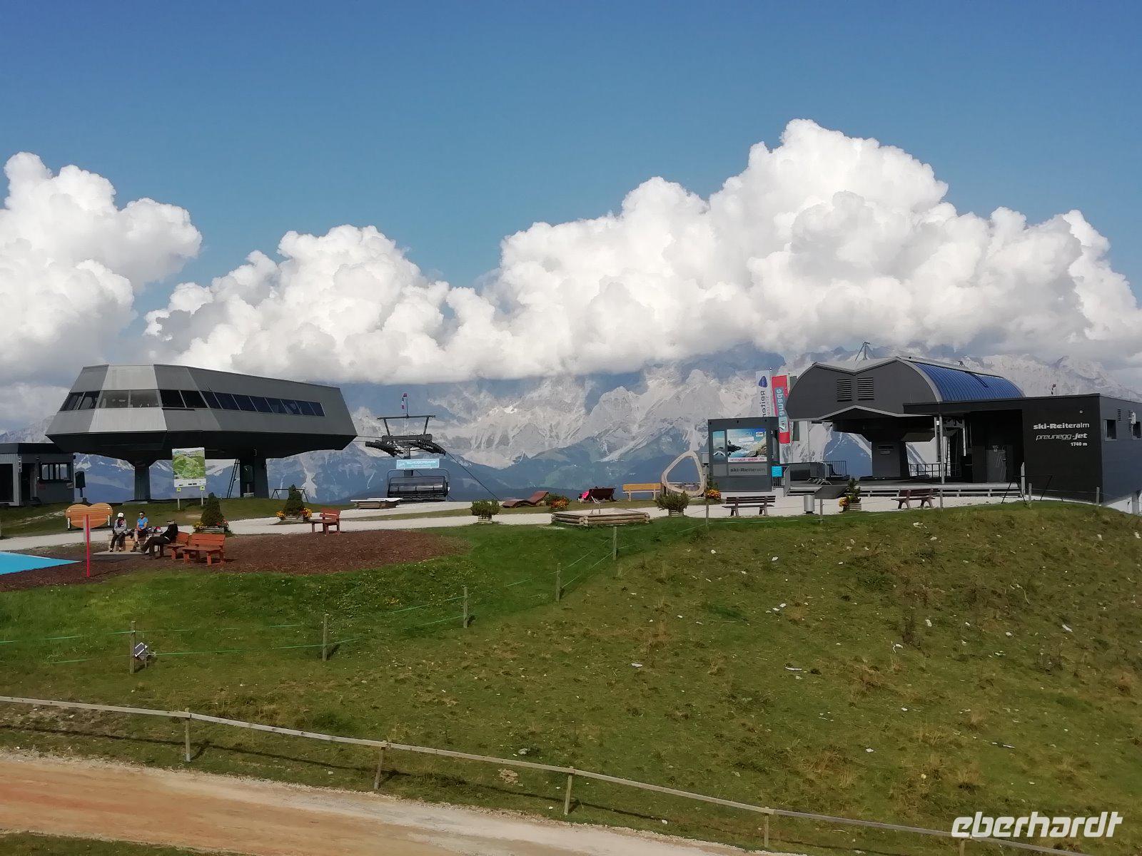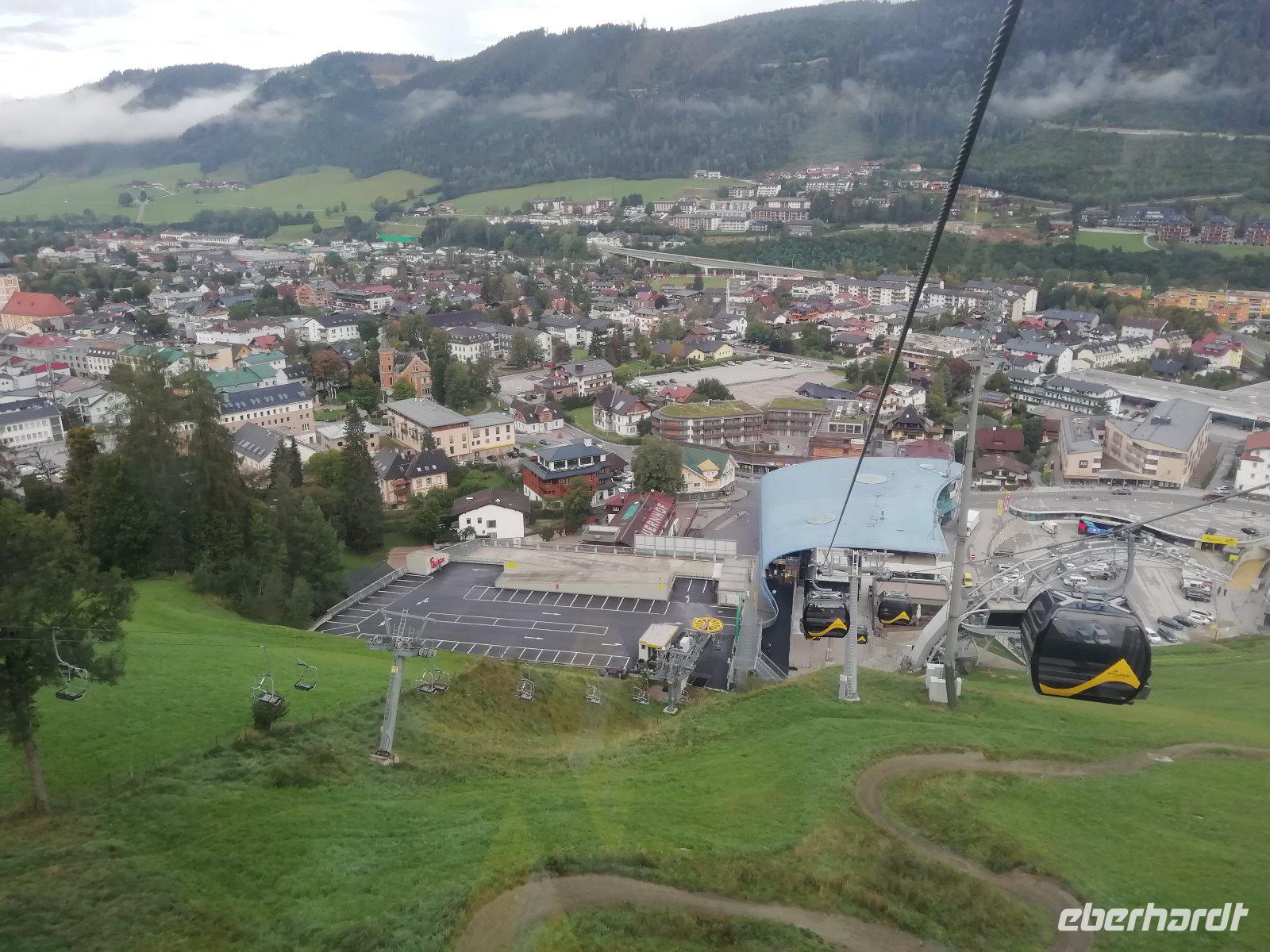 Nach einen guten Frühstück mit Produkten aus der Region wollen wir unseren ersten Berg „erklimmen". Inzwischen hat sich der Nebel verzogen und Jan bringt uns mit dem Bus nach Rohrmoos. Von hier geht es mit der Seilbahn hinauf auf den Hochwurzen. In 1852 m Höhe haben wir einen schönen Blick auf das gegenüberliegende Dachsteinmassiv. Wir spazieren noch bis zum Gipfel des „Kleinen Wurzen". Dann können wir die Go-Card-Piloten bei ihrer rasanten Fahrt beobachten. Auch für uns geht es wieder hinunter, allerdings mit der Seilbahn.
