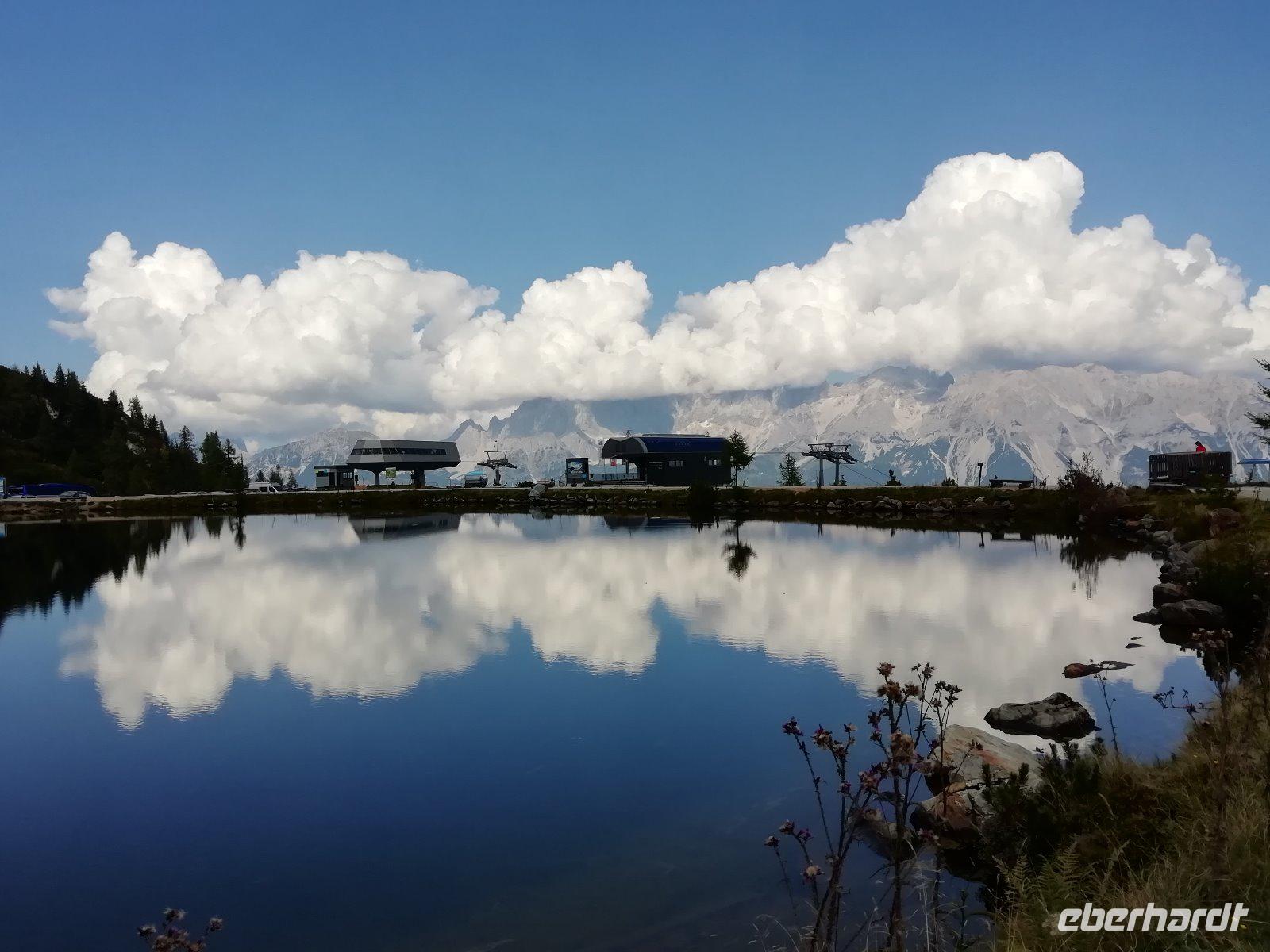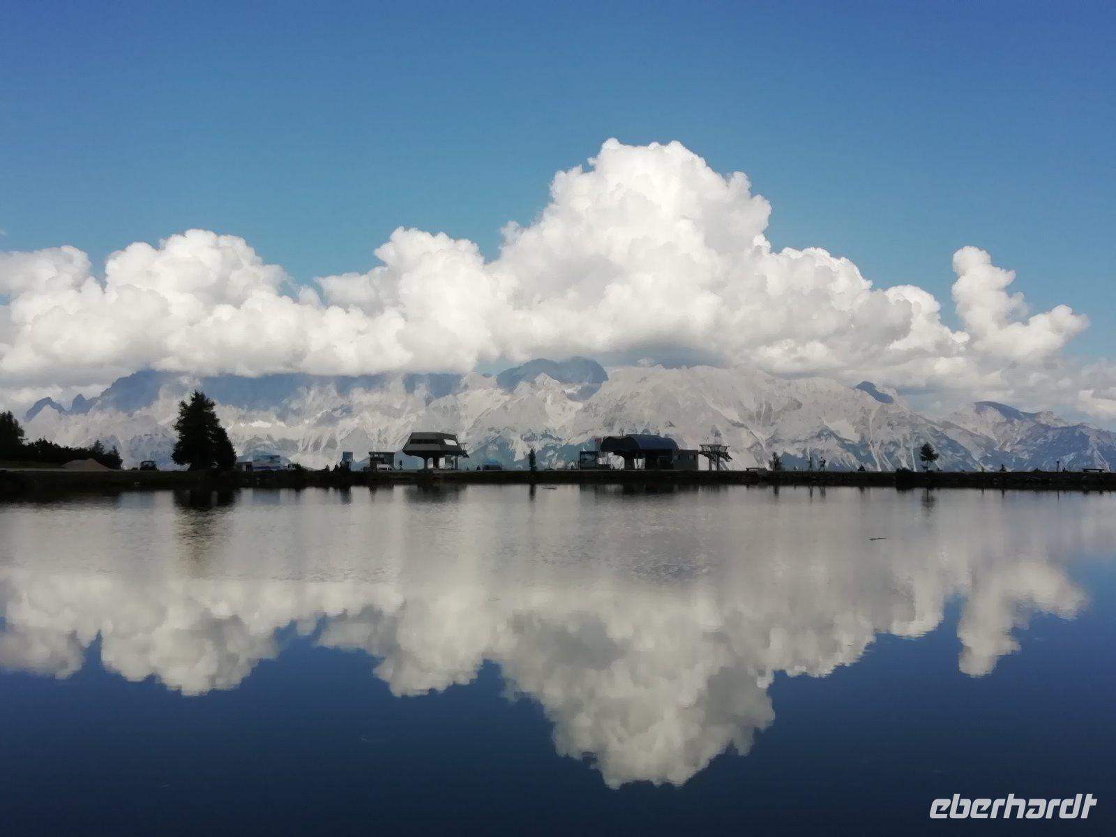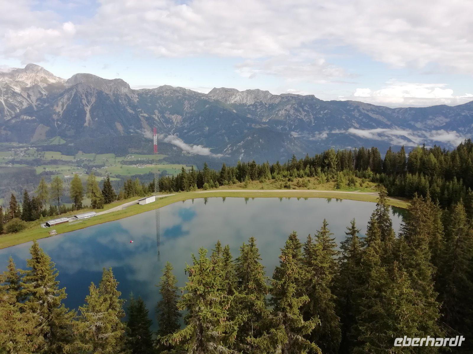 Nun folgt eine Busfahrt über eine enge, serpentinenreiche Straße. Kompliment an unseren Jan. Immer wieder haben wir schöne Panoramablicke zum Dachsteinmassiv, in die umliegende Bergwelt und ins Ennstal. Nach 30 Minuten erreichen wir die Reiteralm. Da es inzwischen Mittag ist, kehren die meisten Gäste in die Grasselhöh-Hütte ein. Danach bleibt noch genügend Zeit für einen Spaziergang um den Reiteralmsee. Dabei bieten sich fantastische Fotomotive. Dann beginnt die Busrückfahrt ins Tal.