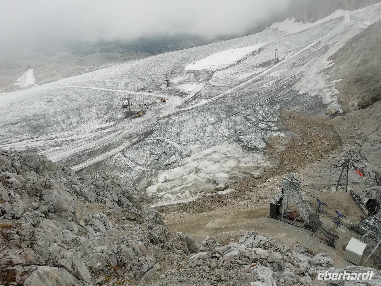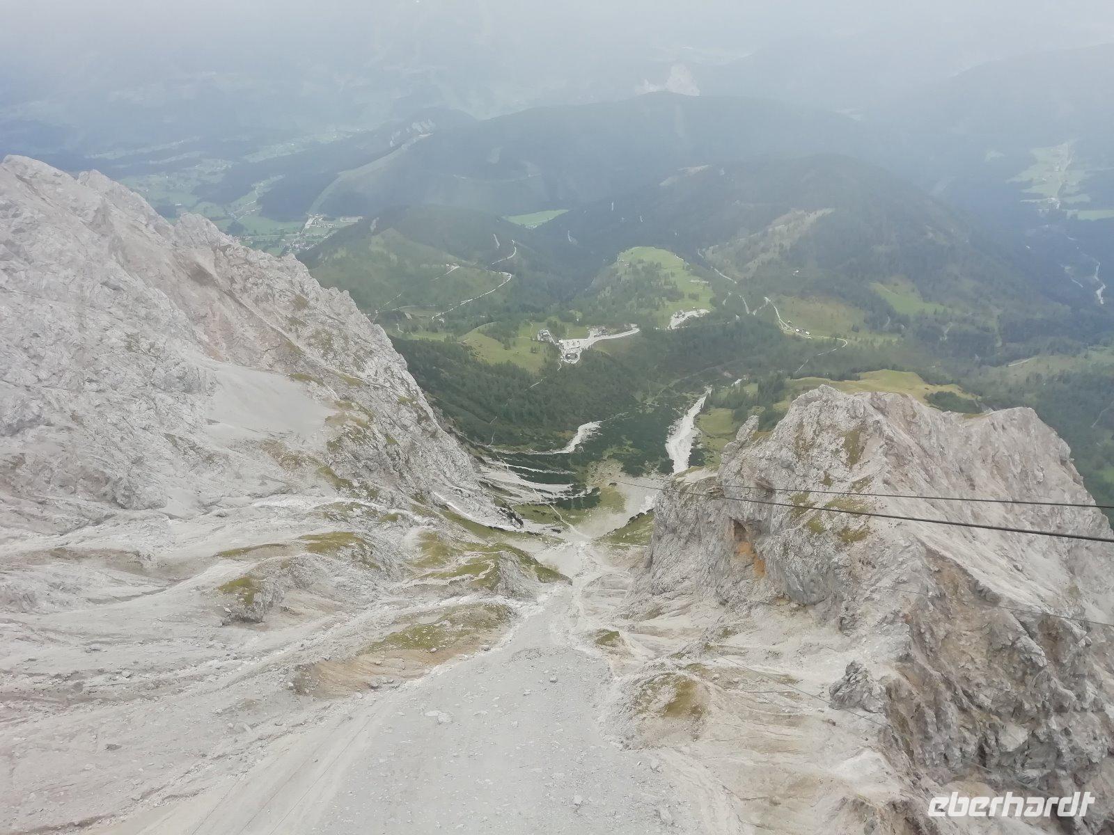 Heute wollen wir besonders hoch hinaus, deshalb machen wir uns schon 8 Uhr auf den Weg. Durch Ramsau und über die Dachsteinstraße gelangen wir ins Ramsauer Almengebiet. Hier befindet sich die Talstation der Dachstein-Südwandbahn. Mit der rundum verglasten Gondel fahren wir auf eine Höhe von 2700 m. Oben angekommen, begeben wir uns zum Dachstein-Skywalk. Er ragt über die 250 m senkrecht abfallende Felswand des Hunerkogels hinaus. Gleich nebenan beginnt der Rundweg um das Dachsteinhaus. Die meisten Gäste wagen sich auch auf Österreichs höchstgelegene Hängebrücke und steigen die „Treppe ins Nichts" hinunter. Es bleibt auch noch Zeit für einen Besuch des Eispalastes. Wieder unten angekommen, machen wir unsere Mittagspause im Alpengasthof, denn leider fängt es an zu regnen.