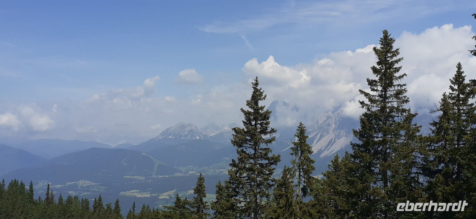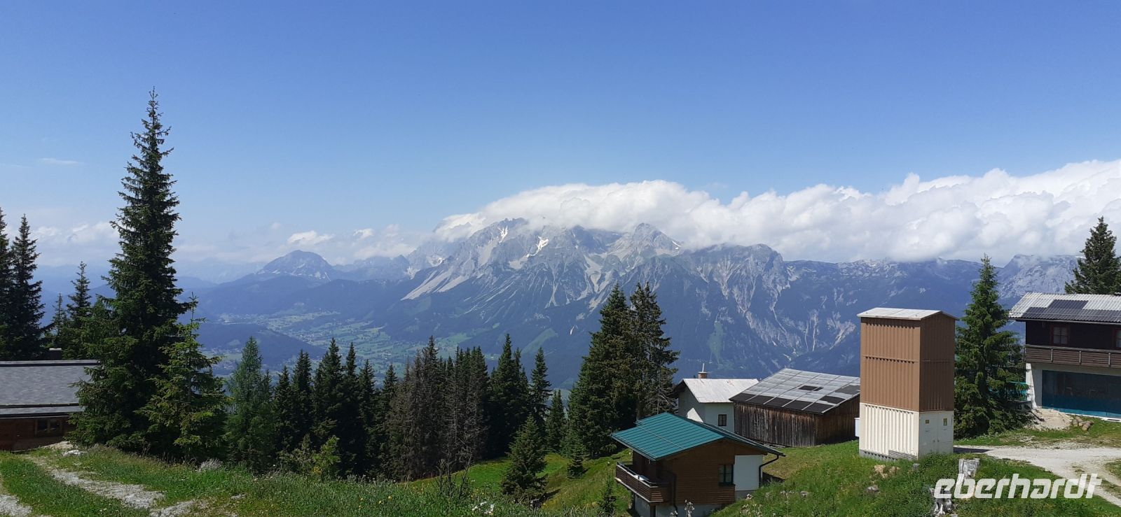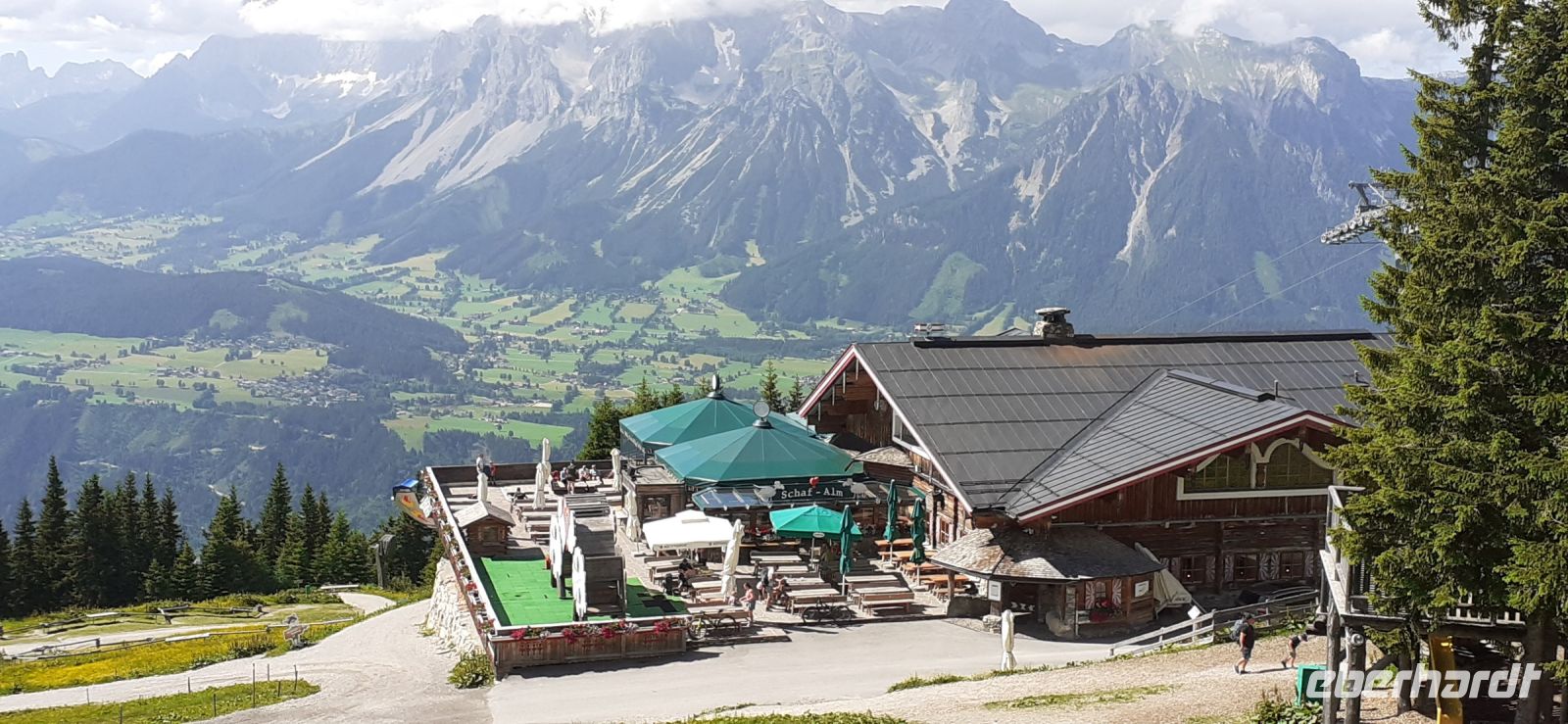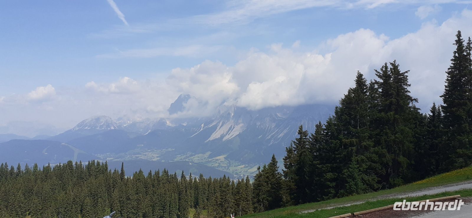 Die Ursprungalm war unser Ziel. Da wir nicht mit unserem Bus hinauf fahren durften stiegen wir in den Shuttelbus um der uns übe die Kurvenreiche Straße zur Ursprungalm in 1610m brachte. Uns erwartete wunder schöne Natur und Landschaft mit blühenden Wiesen und weidenten Kühen. Kein Wunder das dort in der 1968 ein Heidifilm gedreht wurde. Leider durfte er nie gezeigt werden den die Schweizer pochten auf ihre Rechte. Auf einem schönen Rundweg wanderten wir wieder zur Alm immer mit dem Blick auf die Hohen Tauern. Auf der Terrasse der Alm kehrten wir ein und ließen uns die Köstlichkeiten munden. Nach einem weiteren Spaziergang brachte uns der Bus wieder zur Planai Talstation. Spontan haben wir uns entschieden noch einmal auf die Planai zu fahren. Blauer Himmel und Sonnenschein und fast keine Wolken lockten uns nach oben. Wir wurden belohnt mit einem Blick in die Region. Das Dachsteinmassiv ohne Wolken. Was wollten wir mehr.