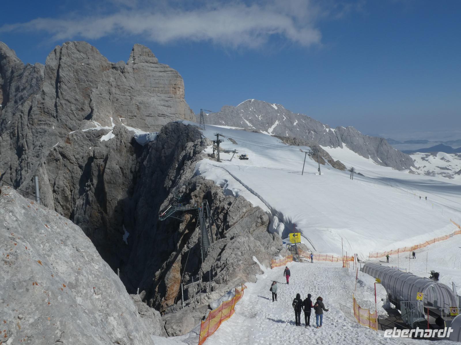 Der schönste Tag der Woche, mit blauen Himmel Sonnenschein und der Höhepunkt der Reise, führte uns auf den Dachstein. Wir fuhren über Ramsau und die Mautstraße zur Talstation. Wir waren fast die ersten Gäste, die mit der Gondel nach oben fuhren. So konnten wir in aller Ruhe den Blick in jede Richtung schweifen lassen. Auch einige Langläufer konnten wir auf dem Gletscher noch beobachten. Viele Gäste nutzten die Gelegenheit für den Besuch der Hängebrücke und der „Treppe ins Nichts" sowie der Eishöhle. Das Thema war dieses Jahr Europa. So dass man viele bekannte Sehenswürdigkeiten entdecken konnten. Anschließend besuchten wir das Mandelberggut. Während einer Führung erfuhren wir interessantes und wissenswertes über die Latschenkiefernöl Herstellung und das Schnapsbrennen. Eine Verkostung durfte dabei auch nicht fehlen. Unser nächstes Ziel war Öblan. In dem ehemaligen Bergbauort wartete schon ein Traktor mit Anhänger auf uns. Nach einer etwas holprigen Fahrt erreichten wir den Stollen. Währen sich einige bei einem kühlen Getränk erfrischten, unternahmen zwei Gruppen eine interessante Führung durch das Bergwerk.