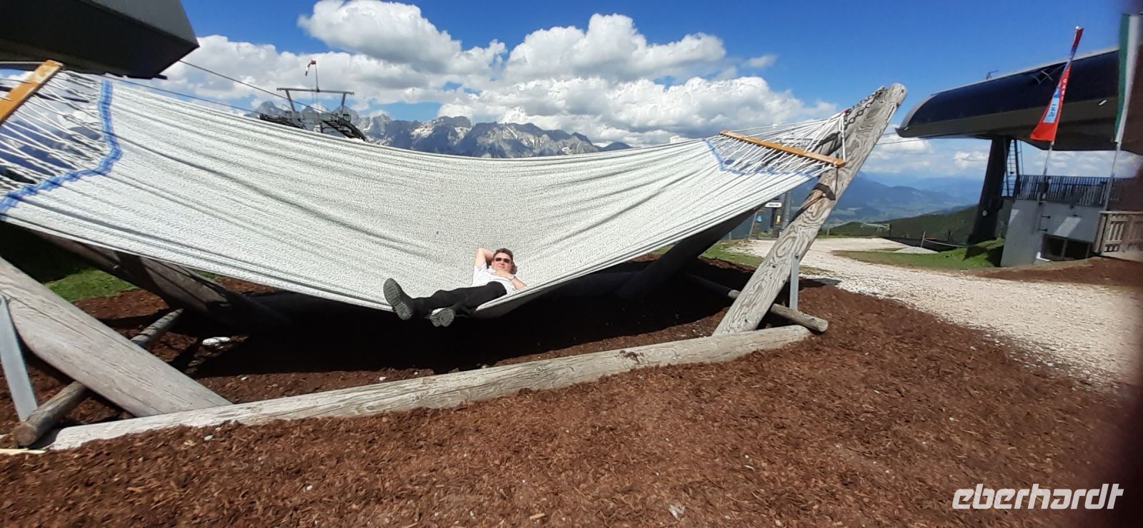 Auch an diesem Tag war das Wetter nicht so schön. Deshalb entschlossen wir uns die Oberhofalm in Filzmoos zu besuchen. Unsere Fahrt führte uns in Richtung Radstadt. Die Mittelalterliche Stadt ist noch zum Teil von der alten Stadtmauer umgeben. Davor befinden sich originelle Fahrräder die es zum Teil sogar in das Guinnessbuch der Rekorde geschafft haben. Wir erreichten den bekannten Wintersportort Filzmoos. Eine Mautstraße führte uns zu den Hofalmen, die sich unterhalb der Bischofsmütze befinden. Wir unternahmen einen Spaziergang rund um den Almsee und zur Holzkirche. In der Oberhof Alm kehrten wir zum Mittag ein. Leider hörte es nicht auf zu regnen. Doch wir entschlossen uns auf die Planai zu fahren. Das Wetter sollte am Nachmittag schöner werden. Die neu eröffnete Gondelbahn brachte uns auf 1840 m Höhe. Es war leider alles im Nebel, doch es zog auch kurz auf, um einen Blick in das Tal zu werfen. Wir spazierten zu Onkel Willys Hütte und ließen uns in der Schladminger Hütte den Kaffee, Jagatee und Glühwein schmecken.