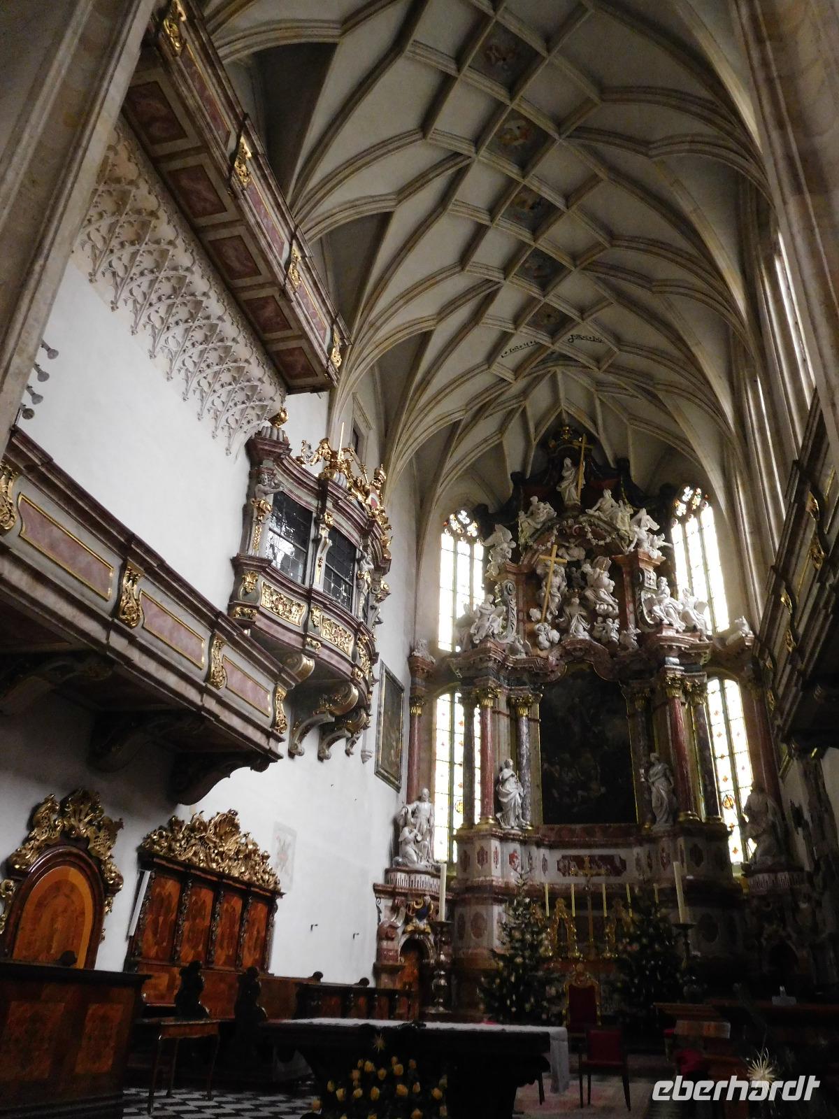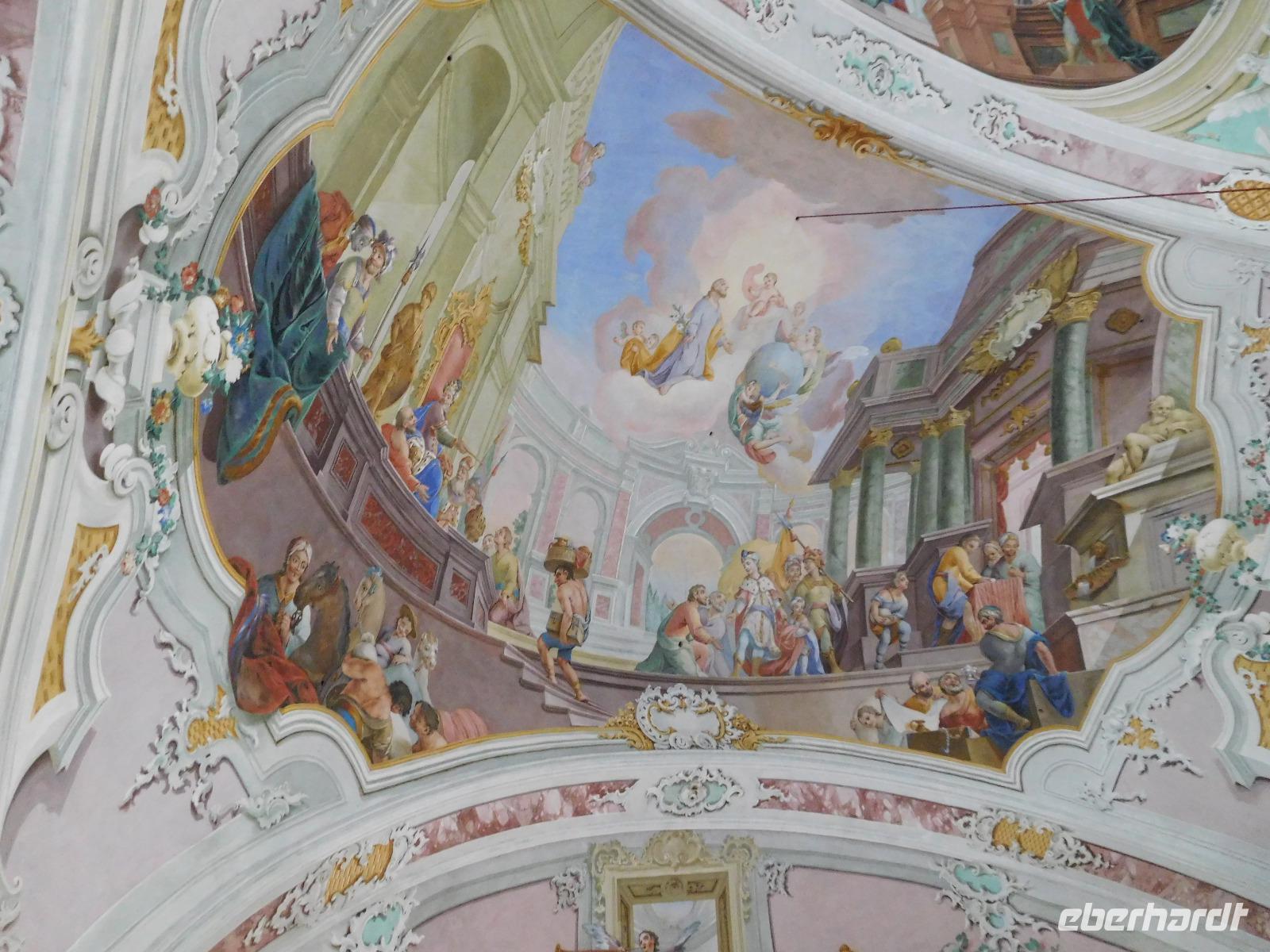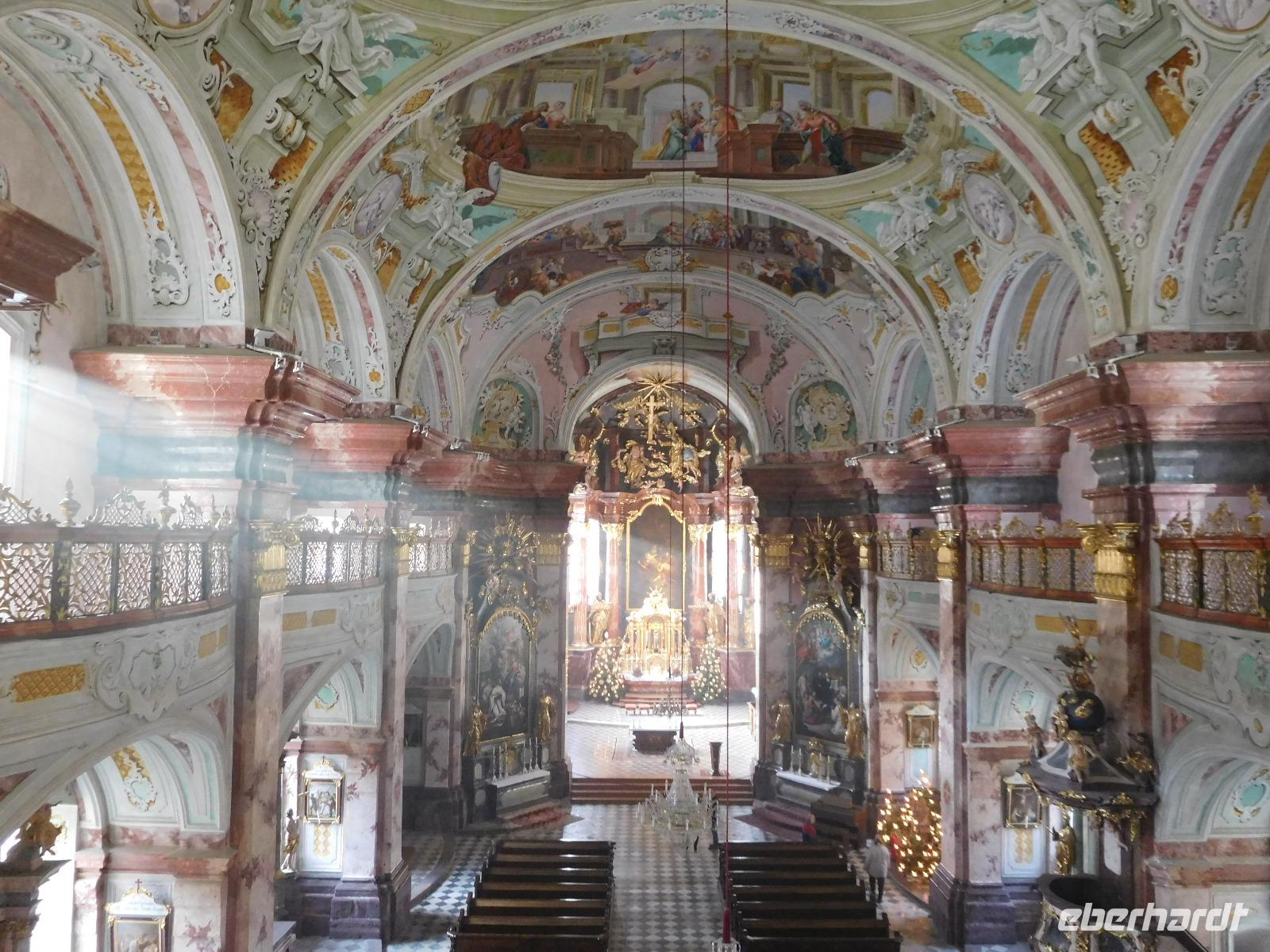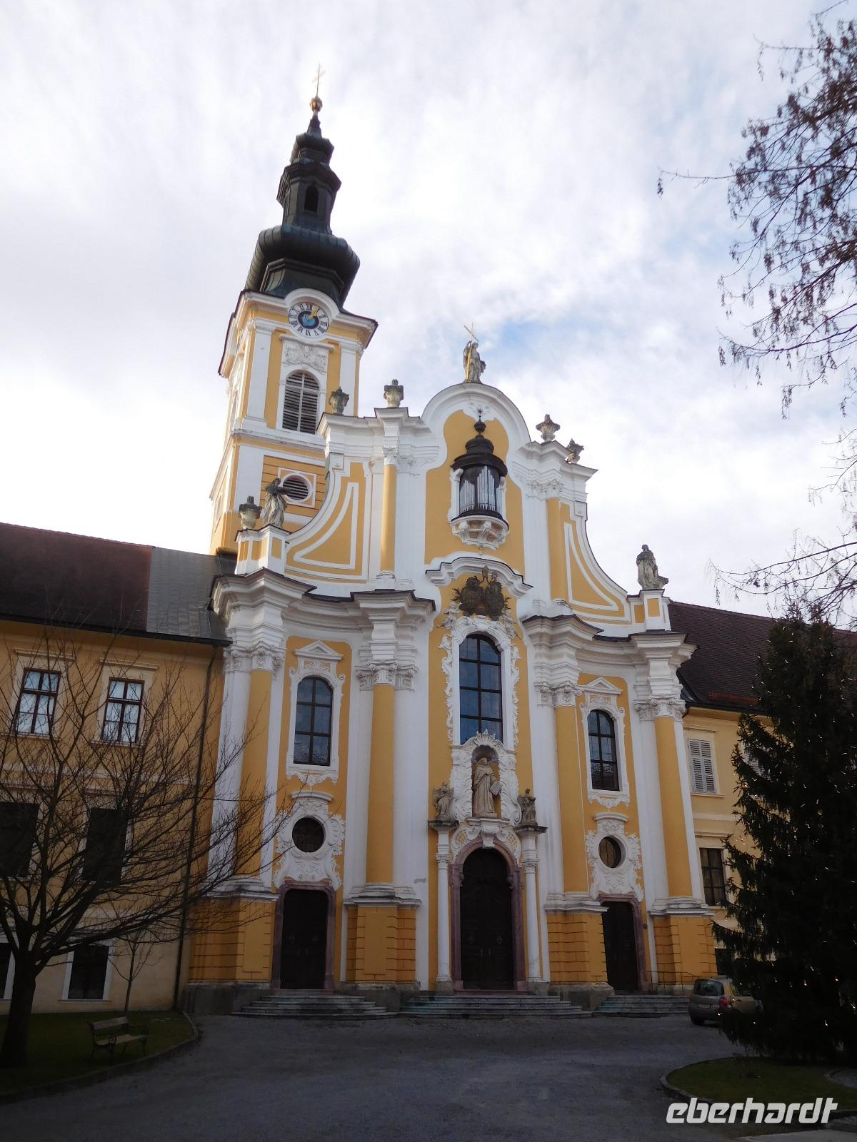 Am späten Vormittag ging es nach einem entspannten Frühstück zum Stift Rein. Das älteste ununterbrochen aktive Zisterzienserkloster der Welt befindet sich am Ende eines stillen Seitentals der Mur und wurde 1129 durch den steirischen Markgrafen Leopold I. gestiftet. Während der Fahrt erzählte der Reiseleiter Grundlegendes über die Geschichte des Zisterzienserordens allgemein und insbesondere über die des Stiftes Rein, wo wir eine ausführliche Führung durch eine sehr kundige Dame erleben durften. Zu Beginn derselben lernten wir mit Bruder Augustin einen sympathischen und weltoffenen Zisterziensermönch kennen. Dann ging es zunächst in die unter Kaiserin Maria Theresia barockisierte Stiftskirche, die getreu der Zisterzienserregel vergleichsweise schlicht aufgeführt wurde. Trotzdem finden wir auch hier feinste Illusionsmalerei und prächtige Altäre. In den um vier Innenhöfe gruppierten Konventsgebäuden ist heute auch eine öffentliche Schule untergebracht. Besonders interessant ist die in neun historischen Räumen untergebrachte Klosterbibliothek, deren Bestand über einhunderttausend Bände, darunter viele wertvolle Inkunabeln umfasst. Bei der Ankuft im Hotel erwarteten uns Kaffe und Kuchen, bevor es zum Abendmenu ging.