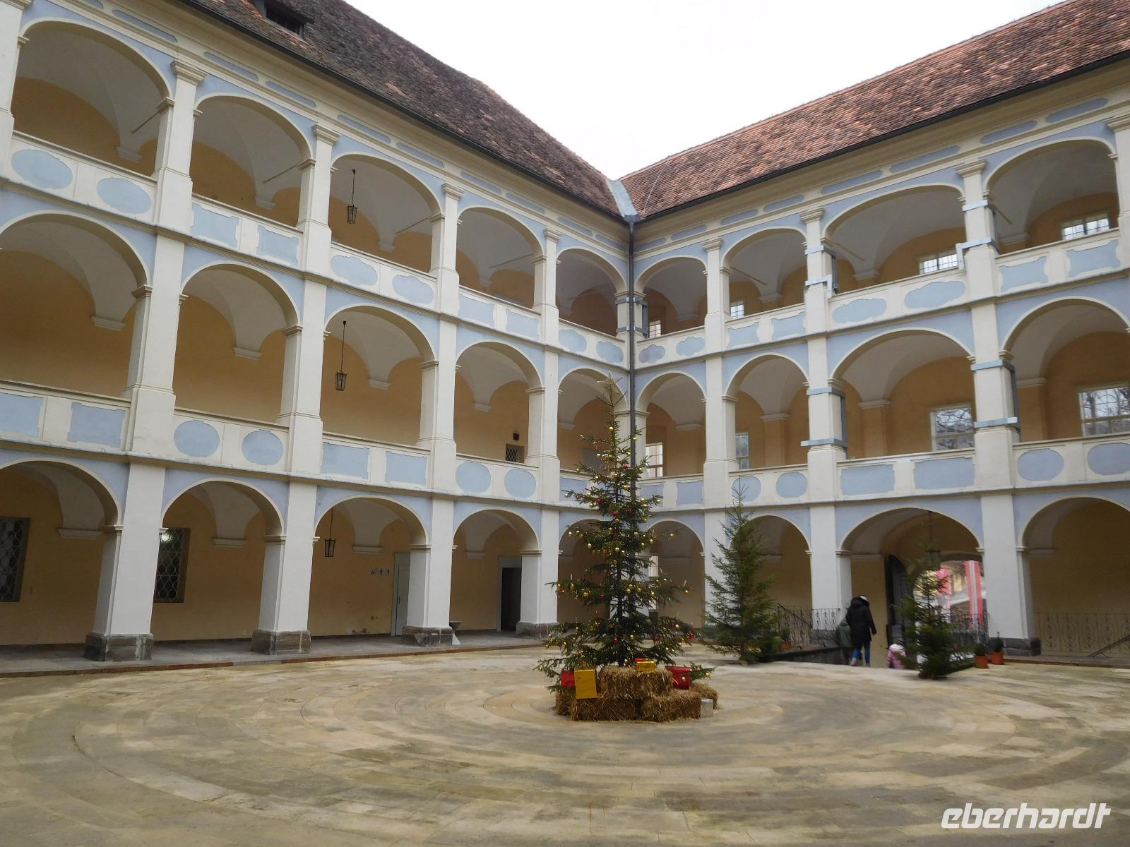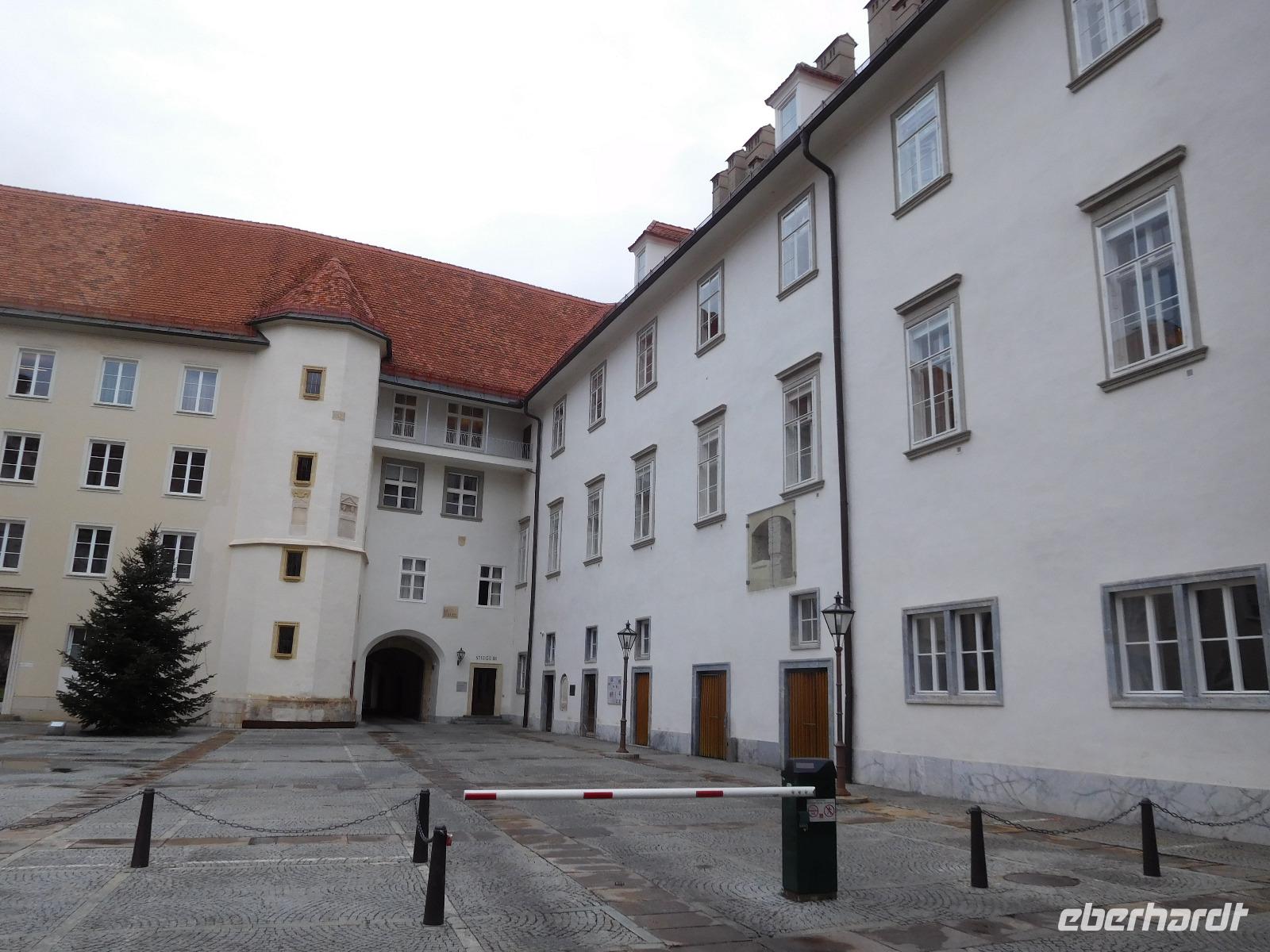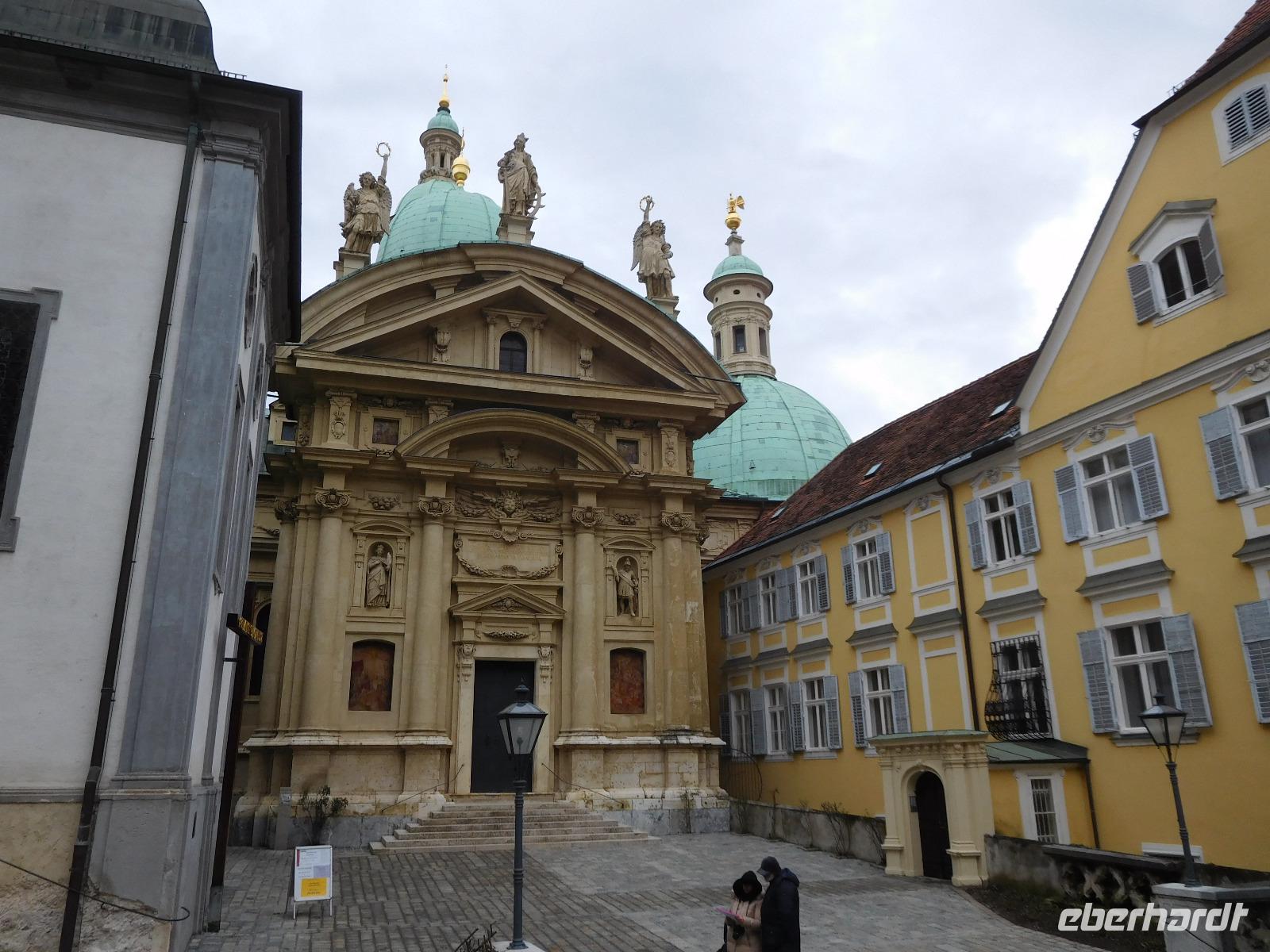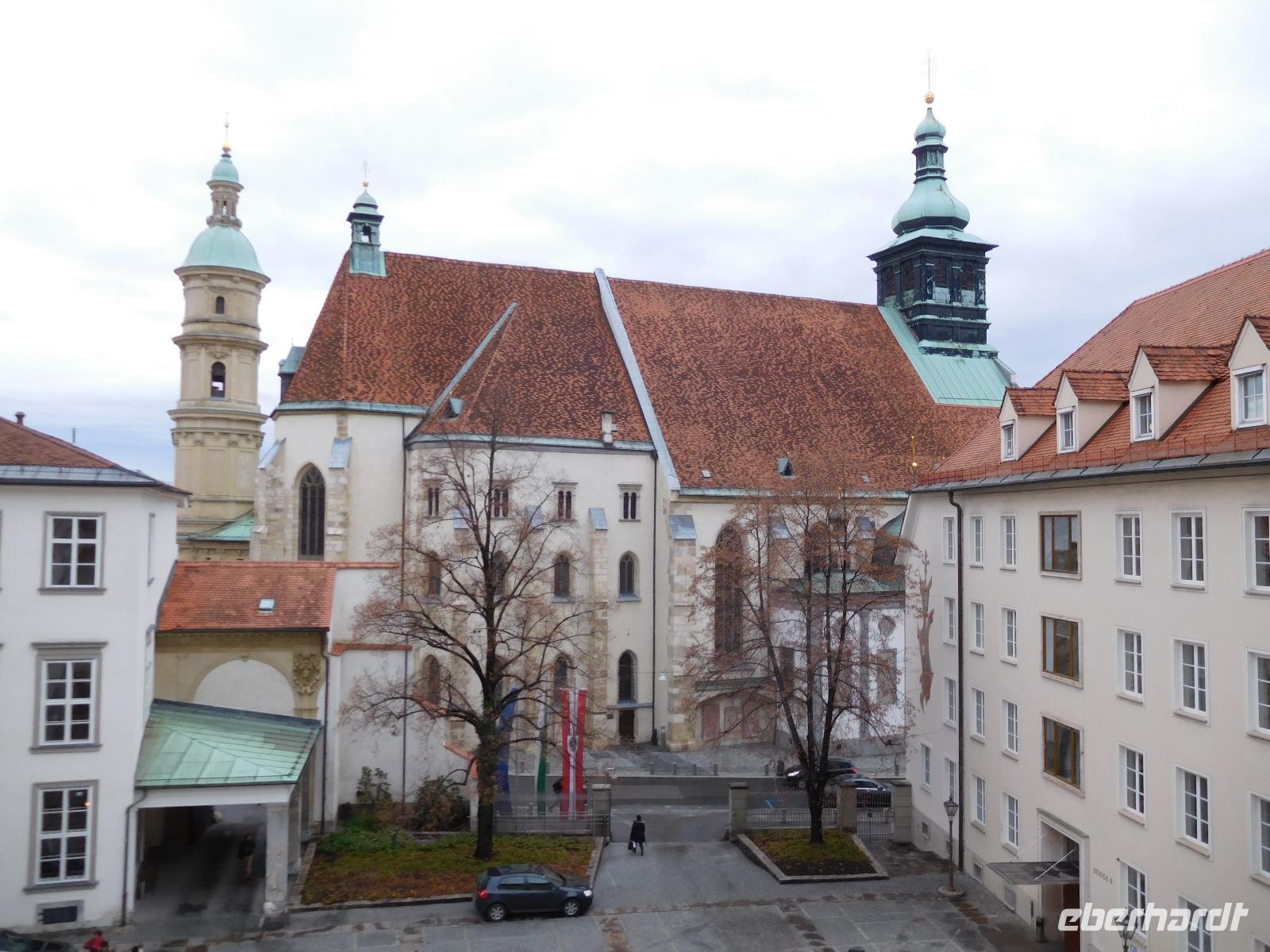 Um halbzehn trafen wir in Graz auf dem so genannten Glacier, einem zur ehemaligen Stadtbefestigung gehörenden Schmuckplatz, unsere englischstämmige Fremdenführerin, die uns die zweitgrößte Stadt Österreichs zeigte. Durch die Stadtmauer gingen wir zunächst zur ehemaligen Burg, in der seit Kaiser Friedrich III., der ab 1438 den Bau voran trieb, die Herrscher aus dem Haus Habsburg residierten. Besonders fasziniert die doppelläufige Wendeltreppe mit zwei ineinander verschlungenen gegenläufigen Treppen, die um 1500 ohne jegliche Mittelstütze konstruiert wurde. Anschließend besuchten wir die Mitte des 15. Jahrhunderts errichtete gotische Domkirche St. Ägidius mit ihren bedeutenden spätmittelalterlichen Fresken. Das benachbarte Mausoleum Kaiser Ferdinand II., eines der bedeutendsten Zeugnisse manieristischer Alpen, konnten wir von außen sehen, während das Innere dem Interesse während der Freizeit vorbehalten blieb. Ein paar Schritte weiter beeindruckt das gigantische Jesuitenkolleg, aus dem sich die Universität entwickelte. Im Innenhof steht zu jeder Jahreszeit ein hübscher Schneemann, der sich bei genauerer Untersuchung als eine Plastik aus weißem Marmor entpuppt. Dann schlenderten wir durch die mondäne Herrengasse zum Landhaus, dem bedeutendsten Monumentalbau der Renaissance in der Steiermark. Der ehemalige Rittersaal wurde Mitte des 16. Jahrhunderts durch den italienischen Festungsbaumeister Domenico dell Allio im venezianisch- lombardischen Stil erweitert.