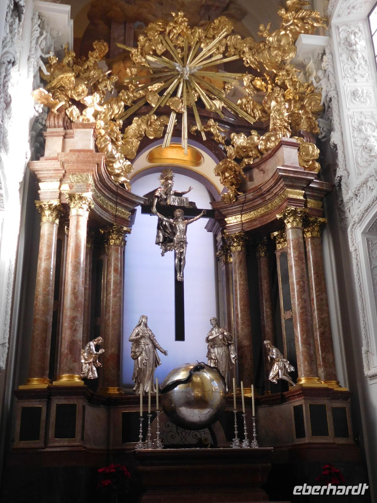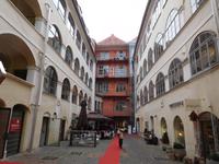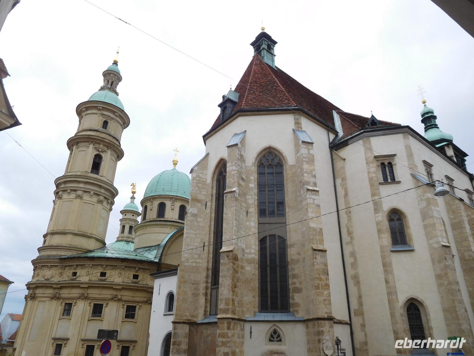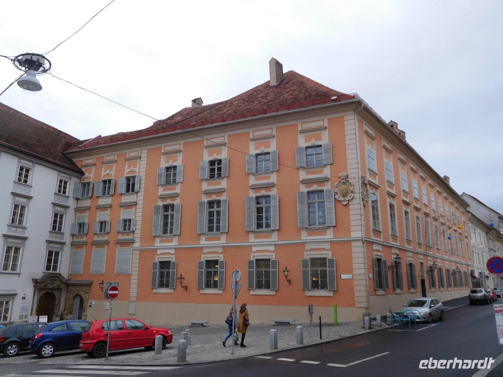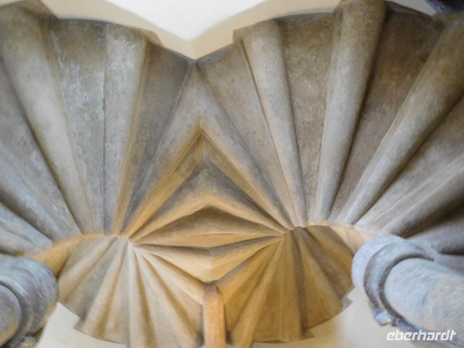 Um halbzehn trafen wir in Graz auf dem so genannten Glacier, einem zur ehemaligen Stadtbefestigung gehörenden Schmuckplatz, unsere englischstämmige Fremdenführerin, die uns die zweitgrößte Stadt Österreichs zeigte. Durch die Stadtmauer gingen wir zunächst zur ehemaligen Burg, in der seit Kaiser Friedrich III., der ab 1438 den Bau voran trieb, die Herrscher aus dem Haus Habsburg residierten. Besonders fasziniert die doppelläufige Wendeltreppe mit zwei ineinander verschlungenen gegenläufigen Treppen, die um 1500 ohne jegliche Mittelstütze konstruiert wurde. Anschließend besuchten wir die Mitte des 15. Jahrhunderts errichtete gotische Domkirche St. Ägidius mit ihren bedeutenden spätmittelalterlichen Fresken. Das benachbarte Mausoleum Kaiser Ferdinand II., eines der bedeutendsten Zeugnisse manieristischer Alpen, konnten wir von außen sehen, während das Innere dem Interesse während der Freizeit vorbehalten blieb. Ein paar Schritte weiter beeindruckt das gigantische Jesuitenkolleg, aus dem sich die Universität entwickelte. Im Innenhof steht zu jeder Jahreszeit ein hübscher Schneemann, der sich bei genauerer Untersuchung als eine Plastik aus weißem Marmor entpuppt. Dann schlenderten wir durch die mondäne Herrengasse zum Landhaus, dem bedeutendsten Monumentalbau der Renaissance in der Steiermark. Der ehemalige Rittersaal wurde Mitte des 16. Jahrhunderts durch den italienischen Festungsbaumeister Domenico dell Allio im venezianisch- lombardischen Stil erweitert.