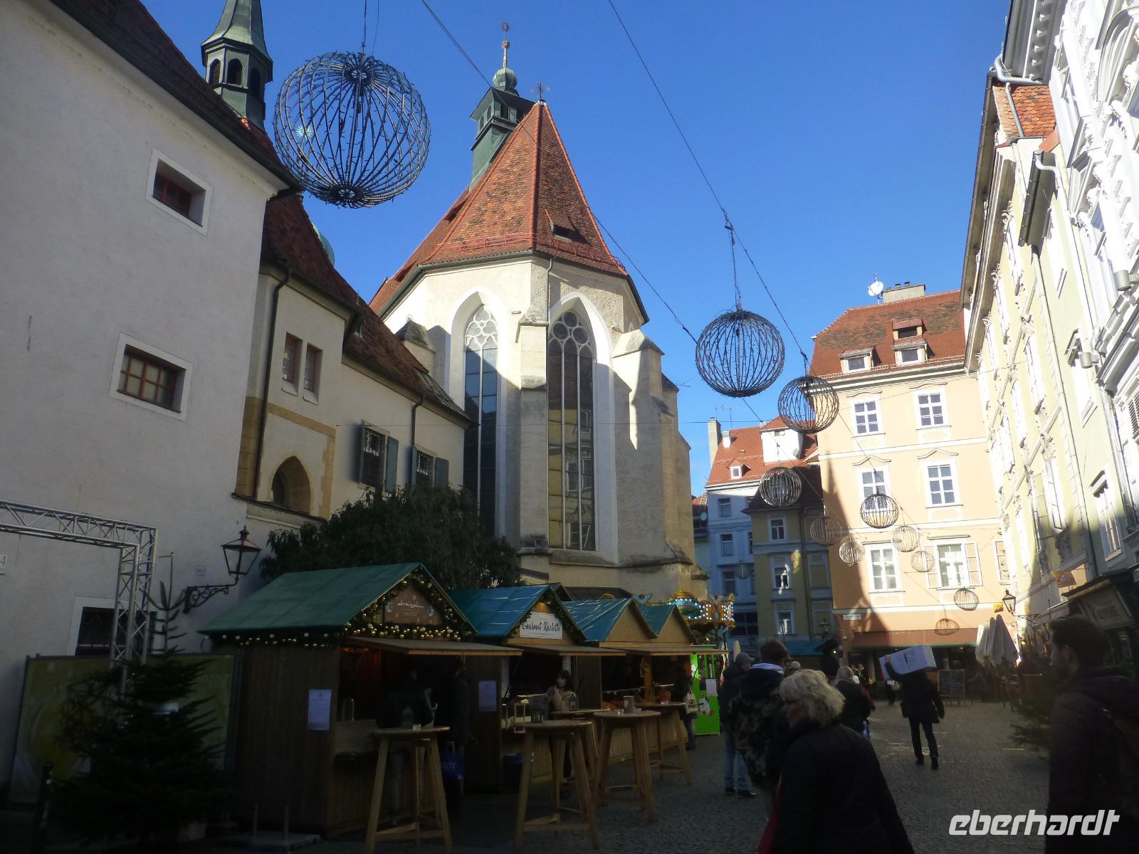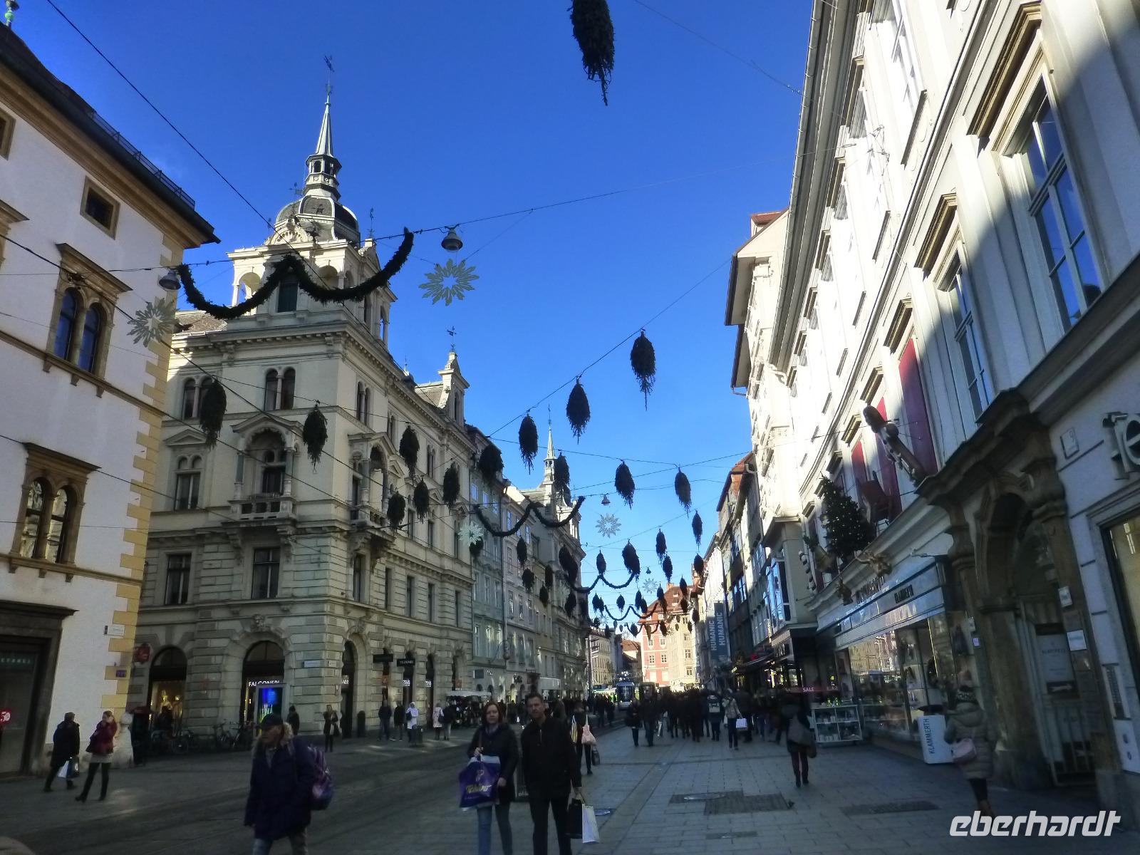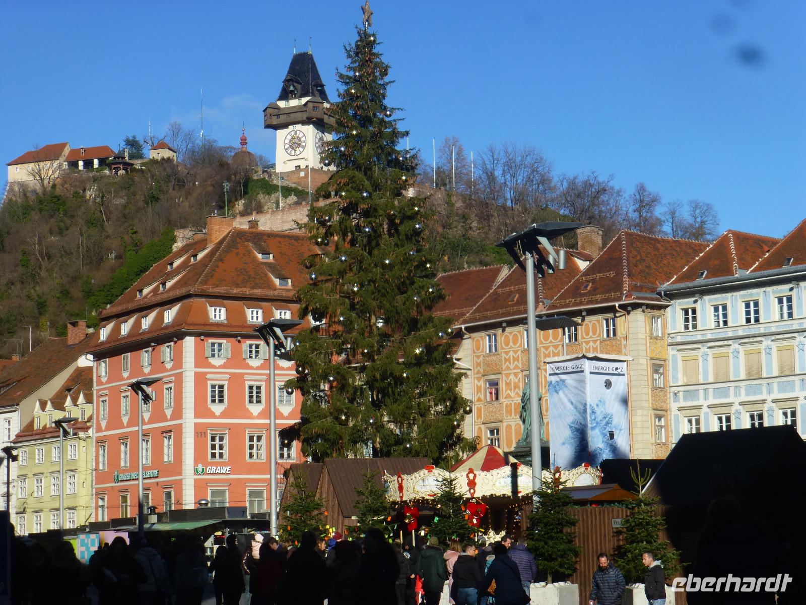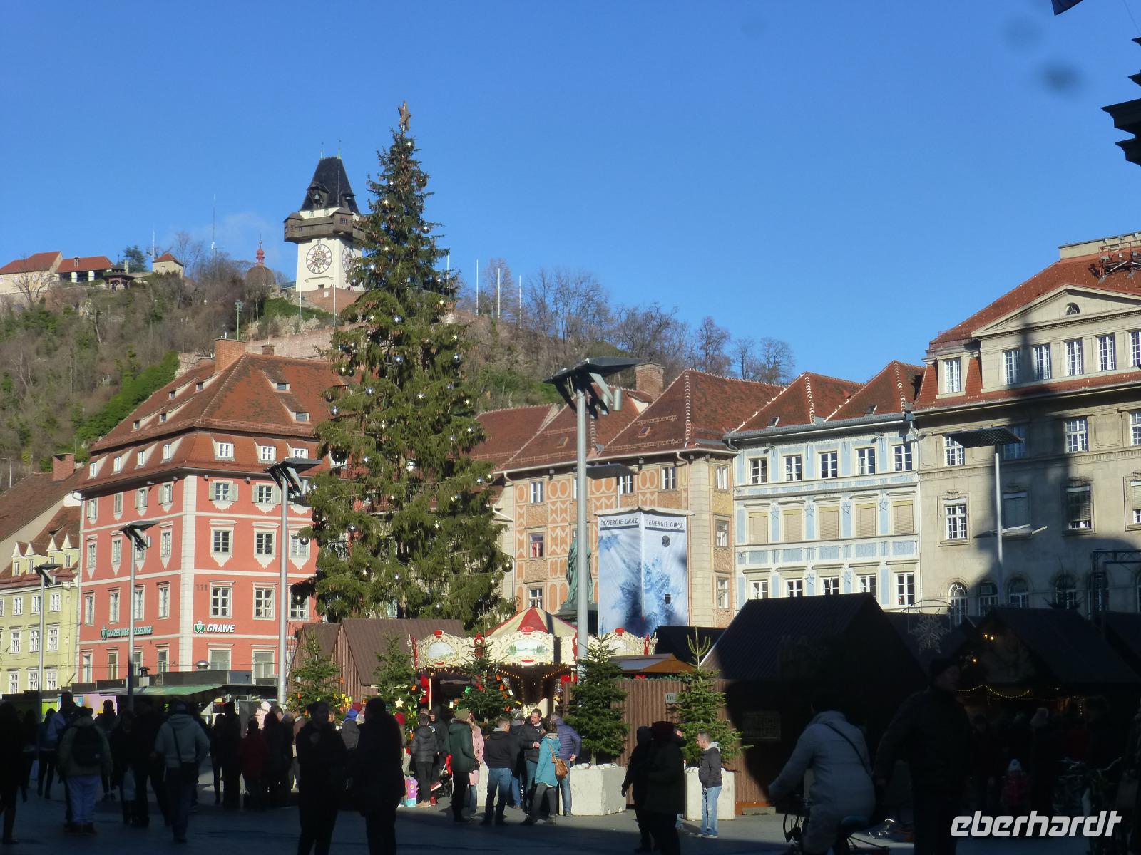 Graz die Hauptstadt der Steiermark ist zu jeder Jahreszeit einen Besuch wert. Unser Gästeführer David brachte uns seine Stadt mit Engagement und Leidenschaft näher. Wir merkten gar nicht wie die Zeit verging. Strahlend blauer Himmel und Sonnenschein taten sein Übriges. Sehr interessant war die doppelführende Wendeltreppe in der ehemaligen Burg. Sie ist einzigartig auf der Welt. Nach dem Besuch im Dom kamen wir gerade rechtzeitig zum Glockenspiel. Es erklangen weihnachtliche Weisen. Anschließend besuchten wir die Eiskrippe im Amtshof. Jedes Jahr entsteht ein neues Motiv. Wir erreichten den Rathausplatz und erhaschten den ersten Blick auf das Wahrzeichen von Graz, den Uhrturm. Noch ein Abstecher zur Mur und wir entschieden uns bei dem schönen Wetter auf den Schlossturm zu fahren. Der Lift brachte uns bequem nach oben. Die Auffahrt hatte sich gelohnt ein wunderschöner Blick auf Graz und die Umgebung erwartete uns. Nach einem kleinen Spaziergang auf dem Schlossberg besuchten wir noch den Weihnachtsmarkt. Zurück im Hotel nahmen wir in der Weiz Kirche an der Kinderchristmette teil. Eine schöne Einstimmung auf den Heiligen Abend. Nach dem Weihnachtsmenü schaute sogar der Weihnachtsmann vorbei. In geselliger Runde ließen wir denn Tag ausklingen. Im Innenhof trafen wir uns zu einem Punsch und lauschten den Turmbläsern.