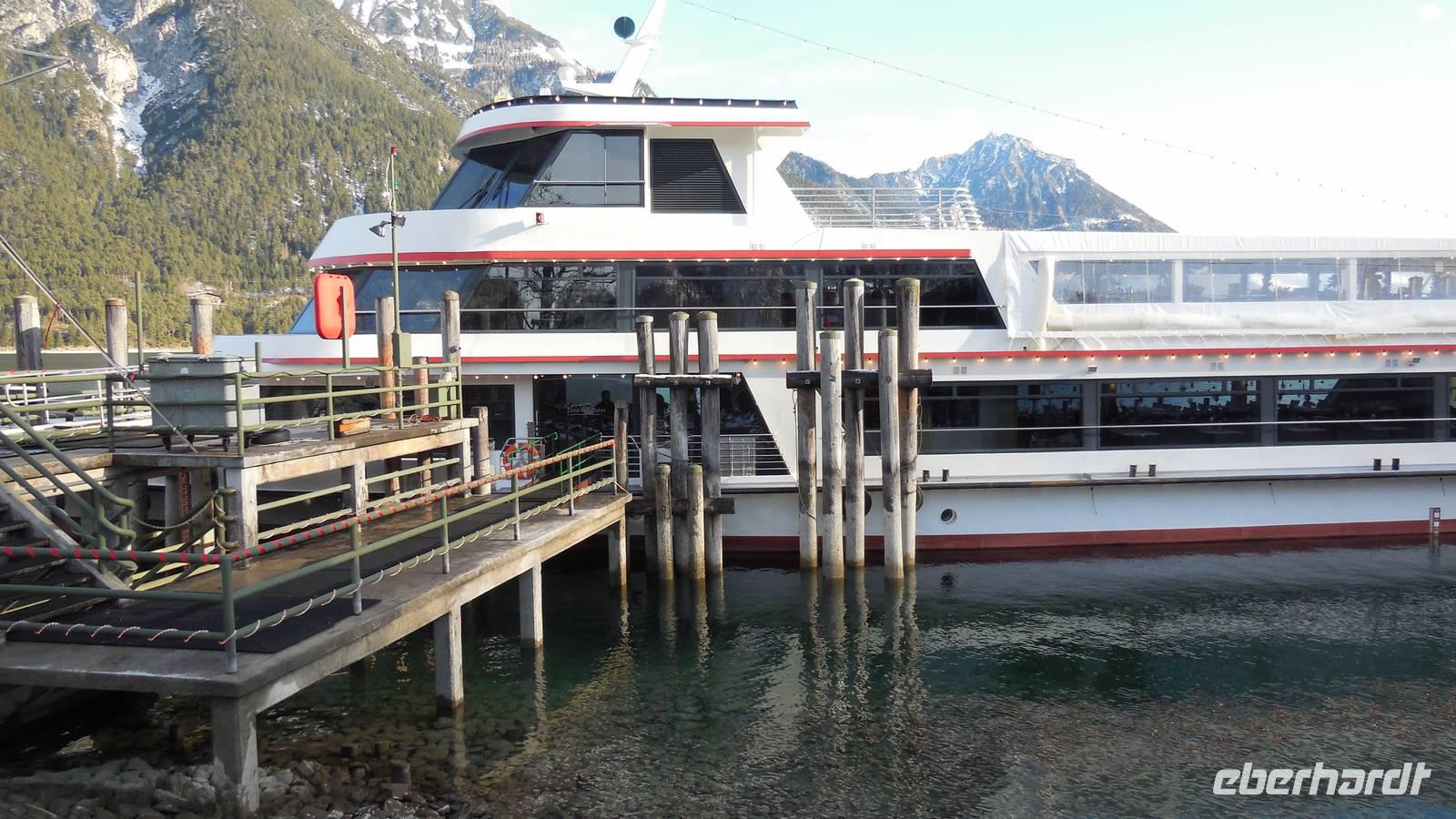 Am Nachmittag trafen sich unsere Gäste am Bootsanleger von Pertisau um ein weihnachtlich geschmücktes Schiff zu besteigen, welches uns für zwei Stunden die sog. „Seeweihnacht am Achensee" bot. Bei Live-Musik, Bewirtung und einem Weihnachtsmarkt am Oberdeck schipperten wir für zwei Stunden auf dem See, der auf einer Höhe von 929 m ü.M. liegt, 9 km lang und bis zu 1 km breit ist und eine Tiefe von133 m erreicht.