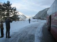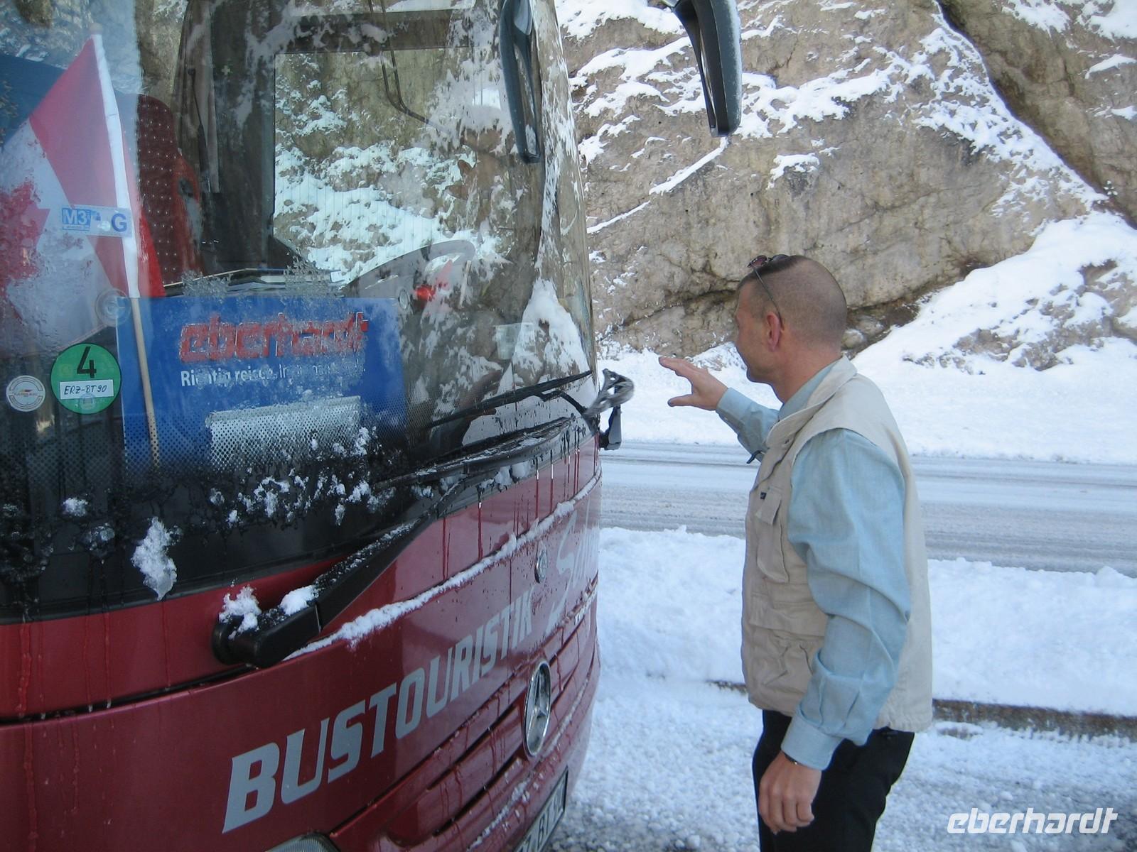Gestärkt vom Frühstück starten wir um 8:30 Uhr zur Rundfahrt um den Wilden Kaiser. Das Wetter ist heute nicht ideal für den Ausflug, aber wir lassen uns dadurch die Laune nicht verderben. Die Wolken hängen tief und von Zeit zu Zeit schneit es.